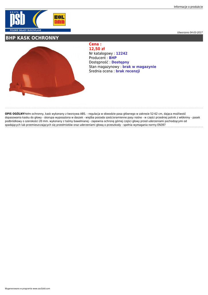 Informacje o produkcie Utworzono 04-03-2017 BHP KASK OCHRONNY Cena : 12,50 zł Nr katalogowy : 12242 Producent : BHP Dostępność : Dostępny Stan magazynowy : brak w magazynie Średnia ocena : brak recenzji OPIS OGÓLNYHełm ochronny, kask wykonany z tworzywa ABS. - regulacja w obwodzie pasa głównego w zakresie 52-62 cm, dająca możliwość dopasowania kasku do głowy - skorupa wyposażona w daszek - więźba posiada sześcioramienne pasy nośne - w części przedniej potnik z włókniny - pasek podbródkowy o szerokości 20 mm. wykonany z taśmy bawełnianej - zapewnia ochronę górnej części głowy przed uderzeniami pochodzącymi od spadających lub przemieszczających się przedmiotów oraz uderzeniami głową o przeszkody - spełnia wymagania normy EN397 Wygenerowano w programie www.oscGold.com