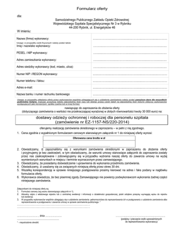 Formularz oferty dla: Samodzielnego Publicznego Zakładu Opieki Zdrowotnej Wojewódzkiego Szpitala Specjalistycznego Nr 3 w Rybniku 44-200 Rybnik, ul. Energetyków 46 W imieniu: Nazwa (firma) wykonawcy: .................................................................................................. Uwaga: w przypadku osób fizycznych należy podać także: Imię i nazwisko wykonawcy: ................................................................................................. PESEL i NIP wykonawcy: ................................................................................................. Adres zamieszkania wykonawcy: ................................................................................................. Adres siedziby wykonawcy (kod, miasto, ulica): ................................................................................................. Numer NIP i REGON wykonawcy: .................................................................................................. Numer telefonu i faksu: .................................................................................................. Adres e-mail: .................................................................................................. Nazwa banku i numer rachunku bankowego .................................................................................................. Uwaga: w przypadku składania oferty przez wykonawców wspólnie ubiegających się o udzielenie zamówienia należy podać powyższe dane dla wszystkich podmiotów kolejno, kopiując powyższą tabelę odpowiednią ilość razy lub dzieląc prawą cześć tabeli na odpowiednią ilość kolumn (dotyczy wykonawców występujących jako konsorcjum, spółka cywilna lub w innej formie). nawiązując do zaproszenia do złożenia oferty (dotyczącego zamówienia o wartości nie przekraczającej wyrażonej w złotych równowartości kwoty 30 000 euro) na: dostawy odzieży ochronnej i roboczej dla personelu szpitala (zamówienie nr EZ-1157-NS/220-2014) oferujemy realizację zamówienia określonego w zaproszeniu – w pełni z nią zgodnego. 1. Cena zgodnie z wypełnionym formularzem cenowym stanowiącym załącznik nr 1 do niniejszej oferty wynosi: Oferowana cena brutto w zł …………………………………… 2. Oświadczamy, iż zapoznaliśmy się z warunkami zamówienia określonymi w zaproszeniu do złożenia oferty i przyjmujemy je bez zastrzeżeń, w tym oświadczamy, że warunki umowy stanowiące załącznik do zaproszenia zostały przez nas zaakceptowane i zobowiązujemy się w przypadku wybrania naszej oferty do zawarcia umowy na wyżej wymienionych warunkach w miejscu i terminie wyznaczonym przez zamawiającego. 3. Oświadczamy, że posiadamy doświadczenie i uprawnienia do wykonania przedmiotu zamówienia. 4. Oświadczamy, iż uważamy się za związanych niniejszą ofertą przez okres 30 dni. 5. Wszelką korespondencję w sprawie niniejszego postępowania prosimy kierować na adres i faks podany w nagłówku formularza oferty. 6. Wykonawca oświadcza, że bez pisemnej zgody Zamawiającego nie powierzy podwykonawcom wykonania żadnej części niniejszego zamówienia. . Załącznikami do niniejszej oferty są: 1. Formularz cenowy (wg wzoru stanowiącego załącznik nr 1). 2. Aktualny odpis z właściwego rejestru lub z centralnej ewidencji i informacji o działalności gospodarczej, jeżeli odrębne przepisy wymagają wpisu do rejestru lub ewidencji. 3. W przypadku wykonawców wspólnie ubiegający się o udzielenie zamówienia: pełnomocnictwo do reprezentowania ich w postępowaniu o udzielenie zamówienia albo reprezentowania w postępowaniu i zawarcia umowy w sprawie zamówienia publicznego. * .................................................................................................................................... .................................................................................................................................... .............................. , dnia ........................ ______________________________________ * - niepotrzebnie skreślić ………............................................................. (podpisy i pieczęcie osób upoważnionych do reprezentowania wykonawcy)