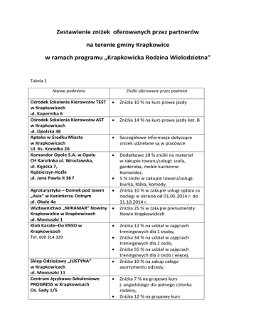 Zestawienie zniżek oferowanych przez partnerów na terenie gminy Krapkowice w ramach programu „Krapkowicka Rodzina Wielodzietna” Tabela 2 Nazwa podmiotu Zniżki oferowane przez podmiot Ośrodek Szkolenia Kierowców TEST w Krapkowicach ul. Kopernika 6 Ośrodek Szkolenia Kierowców AST w Krapkowicach ul. Opolska 38 Apteka w Środku Miasta w Krapkowicach Ul. Ks. Koziołka 20 Komandor Opole S.A. w Opolu CH Karolinka ul. Wrocławska, ul. Kępska 7, Kędzierzyn-Koźle ul. Jana Pawła II 36 f Zniżka 10 % na kurs prawa jazdy Zniżka 14 % na kurs prawa jazdy kat. B Szczegółowe informacje dotyczące zniżek udzielane są w placówce Agroturystyka – Domek pod lasem „Asia” w Kazimierzu Dolnym ul. Okale 4a Wydawnictwo „MIRAMAR” Nowiny Krapkowickie w Krapkowicach ul. Moniuszki 1 Klub Karate–Do ENSO w Krapkowicach Tel. 600 314 329 Dodatkowe 10 % zniżki na materiał w zakupie towaru/usługi: szafa, garderoba, meble kuchenne Komandor, 5 % zniżki w zakupie towaru/usługi: biurka, łóżka, komody. Zniżka 10 % w zakupie usługi opłata za noclegi w okresie od 01.05.2014 r. do 31.10.2014 r. Zniżka 25 % w zakupie prenumeraty Nowin Krapkowickich Sklep Odzieżowy „JUSTYNA” w Krapkowicach ul. Moniuszki 11 Centrum Językowo-Szkoleniowe PROGRESS w Krapkowicach Os. Sady 1/5 Zniżka 12 % na udział w zajęciach treningowych dla 1 osoby, Zniżka 34 % na udział w zajęciach treningowych dla 2 osób, Zniżka 55 % na udział w zajęciach treningowych dla 3 osób i więcej. Zniżka 10 % na zakup całego asortymentu odzieży. Zniżka 7 % na grupowy kurs j. angielskiego dla jednego członka rodziny, Zniżka 12 % na grupowy kurs Księgarnia MAKAMA w Krapkowicach ul. Opolska 1 Usługi Opiekuńcze „Świat do 3 lat w Krapkowicach Os. Sady 1 INSTAL-KA w Gogolinie ul. Krapkowicka 167 ArtDesign Studio w Gogolinie ul. Krapkowicka 167 Szkoła Kierowców AUTO PASJA w Krapkowicach ul. Bławatków 14 j. angielskiego przy zapisie dwóch członków rodziny, Zniżka 18 % na grupowy kurs j. angielskiego przy zapisie trzech członków rodziny, Zniżka 20 % na grupowy kurs j. angielskiego przy zapisie czterech członków rodziny. Zniżka 15 % od ceny detalicznej/ katalogowej przy zakupie książek nie będących podręcznikami i publikacjami niskonakładowymi, Zniżka 10 % od ceny detalicznej/ katalogowej przy zakupie podręczników, książek niskonakładowych oraz wszelkich towarów przemysłowych będących w ofercie księgarni Makama, Zniżka 10 % na usługi oferowane przez księgarnię Makama. Zniżka 5 % w miesięcznej opłacie za żłobek Zniżka 10 % w zakupie towaru (asortyment sanitarno-grzewczy) Zniżka 10 % na projektowanie i aranżację wnętrz Zniżka 12 % na kurs nauki jazdy kat. B