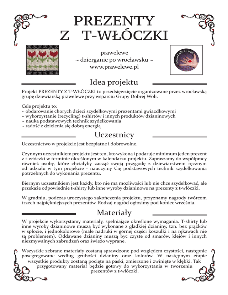PREZENTY Z T-WŁÓCZKI prawelewe ~ dzierganie po wrocławsku ~ www.prawelewe.pl Idea projektu Projekt PREZENTY Z T-WŁÓCZKI to przedsięwzięcie organizowane przez wrocławską grupę dziewiarską prawelewe przy wsparciu Grupy Dobrej Woli. Cele projektu to: ~ obdarowanie chorych dzieci szydełkowymi prezentami gwiazdkowymi ~ wykorzystanie (recycling) t-shirtów i innych produktów dzianinowych ~ nauka podstawowych technik szydełkowania ~ radość z dzielenia się dobrą energią Uczestnicy Uczestnictwo w projekcie jest bezpłatne i dobrowolne. Czynnym uczestnikiem projektu jest ten, kto wykona i podaruje minimum jeden prezent z t-włóczki w terminie określonym w kalendarzu projektu. Zapraszamy do współpracy również osoby, które chciałyby zacząć swoją przygodę z dziewiarstwem ręcznym od udziału w tym projekcie - nauczymy Cię podstawowych technik szydełkowania potrzebnych do wykonania prezentu. Biernym uczestnikiem jest każdy, kto nie ma możliwości lub nie chce szydełkować, ale przekaże odpowiednie t-shirty lub inne wyroby dzianinowe na prezenty z t-włóczki. W grudniu, podczas uroczystego zakończenia projektu, przyznamy nagrody twórcom trzech najpięknięjszych prezentów. Rodzaj nagród ogłosimy pod koniec września. Materiały W projekcie wykorzystamy materiały, spełniające określone wymagania. T-shirty lub inne wyroby dzianinowe muszą być wykonane z gładkiej dzianiny, tzn. bez prążków w splocie, i jednokolorowe (małe nadruki w górnej części koszulki i na rękawach nie są problemem). Oddawane dzianiny muszą być czyste od smarów, klejów i innych niezmywalnych zabrudzeń oraz świeżo wyprane. Wszystkie zebrane materiały zostaną sprawdzone pod względem czystości, następnie posegregowane według grubości dzianiny oraz kolorów. W następnym etapie wszystkie produkty zostaną pocięte na paski, zmierzone i zwinięte w kłębki. Tak przygotowany materiał będzie gotowy do wykorzystania w tworzeniu prezentów z t-włóczki. PREZENTY Z T-WŁÓCZKI prawelewe ~ dzierganie po wrocławsku ~ www.prawelewe.pl Proces tworzenia prezentu Powyższe zdjęcia przedstawiają przykładowe wykorzystanie t-włóczki. Pojemnik ma wymiary ok. 20 x 30 x 10 cm i jest wykonany z czterech t-shirtów o rozmiarze M z wykorzystaniem szydełka o średnicy 10 mm (rozmiar (N/P). Podczas pierwszych warsztatów uczestnicy zdecydują czy chcą szydełkować według własnych wzorów, czy też wolą skorzystać z przygotowanych sugestii. PREZENTY Z T-WŁÓCZKI Kalendarz sierpień warsztaty - zebranie t-shirtów i przygotowanie t-włóczki do 31 sierpnia t-włóczka gotowa wrzesień warsztaty - nauka szydełkowania z t-włóczki i zapisy do czynnego udziału w projekcie do 30 września lista czynnych uczestników gotowa, projekty przypisane do uczestników i t-włóczka rozdana październik warsztaty - wspólne szydełkowanie prezentów listopad warsztaty - kompletowanie, metkowanie, podpisywanie i pakowanie prezentów do 30 listopadagotowe prezenty dostarczone do miejsca zbiórki do 10 grudnia prezenty przekazane do rozesłania dla dzieci grudzień uroczyste zakończenie projektu, przyznanie nagród i świętowanie Bożego Narodzenia Powyższe terminy są orientacyjne i mogą ulec zmianie. Najświeższe informacje i nowinki o projekcie na www.prawelewe.pl prawelewe ~ dzierganie po wrocławsku ~ www.prawelewe.pl