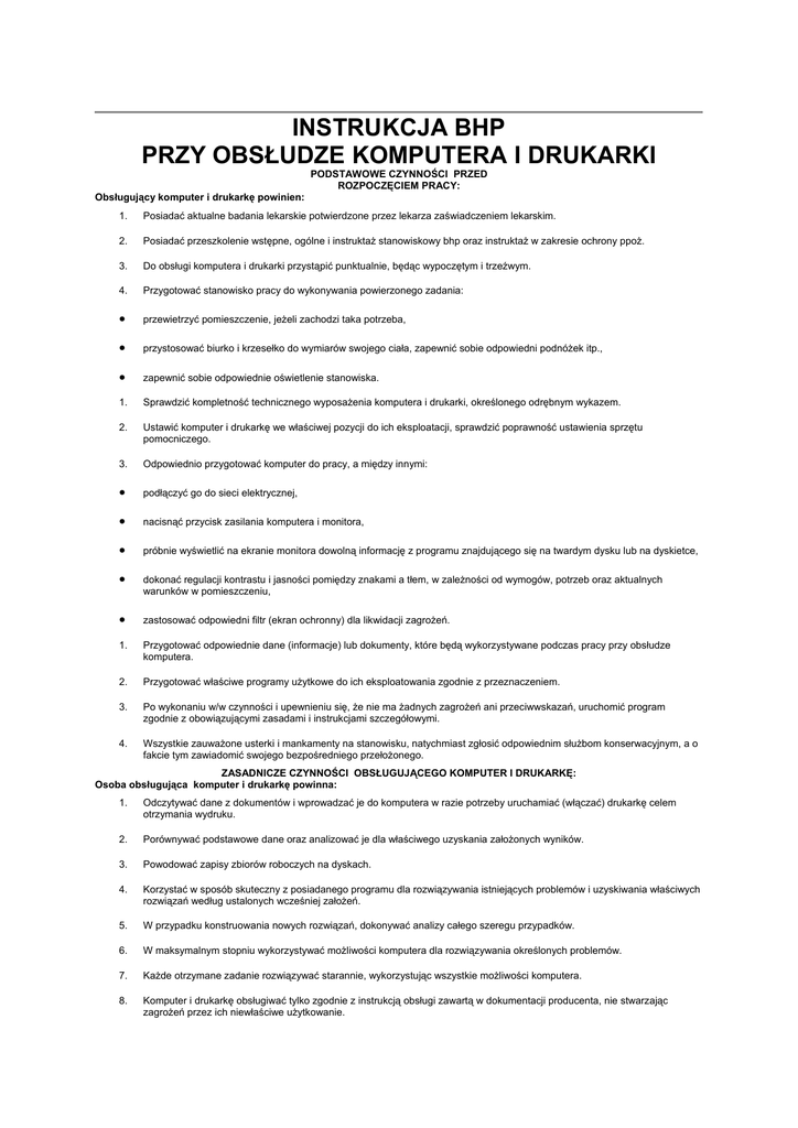 INSTRUKCJA BHP PRZY OBSŁUDZE KOMPUTERA I DRUKARKI