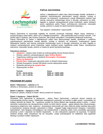PAPUA ZACHODNIA Jedna z największych połaci lasu deszczowego świata, spotkanie z ostatnimi wyizolowanymi plemionami naszej planety, nocleg w domach na drzewach, budowanych nawet kilkanaście metrów nad ziemią, poznanie codziennego życia w dżungli, polowanie na dziki, kąpiele w rzekach zamieszkanych przez krokodyle, spływ łodziami przez najdziksze partie Papui, animistyczne wierzenia, niezwykłe rytuały, podróż w czasie do epoki kamienia łupanego... Typ wyjazdu: zwiedzanie i wypoczynek Papua Zachodnia to wysunięta najdalej na wschód prowincja Indonezji. Rejon wręcz dziewiczy i przypominający świat takim, jakim był w odległej przeszłości. - Dla podróżnika jest to kraina marzeń. I nie chodzi tylko o dystans, jaki musimy pokonać, ale przede wszystkim o kompletną odrębność kulturową. Papua Zachodnia to: jedna z największych połaci lasu deszczowego świata, spotkanie z ostatnimi wyizolowanymi plemionami naszej planety, nocleg w domach na drzewach, budowanych nawet kilkanaście metrów nad ziemią, poznanie codziennego życia w dżungli, polowanie na dziki, kąpiele w rzekach zamieszkanych przez krokodyle, spływ łodziami przez najdziksze partie Papui, animistyczne wierzenia, niezwykłe rytuały, podróż w czasie do epoki kamienia łupanego... Największe atrakcje: Jayapura – jedyne duże miasto po indonezyjskiej stronie Nowej Gwinei Wizyta u plemion zamieszkujących rejon Doliny Baliem Tygodniowy trekking przez terytoria Korowajów i Kombajów Domy na drzewach Plemię Dani i tradycyjne pieczenie świni w liściach bananowca Wioska Sumpaima i ponad 200-letnia mumia założyciela wioski Rybackie plemiona na wyspie Asei Wypoczynek na Bali Termin: 01.03 – 20.03.2016r. 04.11 – 23.11.2016r. Cena: 5290 zł + 5659 USD 5290 zł + 5659 USD PROGRAM WYJAZDU Dzień 1 Warszawa – Jakarta (-/-/-) Zbiórka w Warszawie, przelot do Jakarty. Dzień 2 Jakarta – Jayapura (-/-/K) Przylot do Jakarty, kolacja w hotelu. Nocny przelot do Jayapury. Dzień 3 Jayapura – Dekai (S/L/K) Wcześnie rano lądowanie w Jayapurze - stolicy Papui Zachodniej i jedynym dużym mieście po indonezyjskiej stronie wyspy. Odebranie niezbędnych pozwoleń na podróż w głąb wyspy i przesiadka na kolejny samolot do Dekai. Ok. 1-godzinny przelot do Doliny Baliem jest atrakcją samą w sobie - z okien samolotu rozpościera się niezapomniany widok na dziki interior wyspy – gęste połacie lasu deszczowego, serpentyny potężnych rzek, wzgórza i poszarpane wierzchołki gór oraz nieliczne ślady ludzkiej obecności w bezkresnym oceanie dżungli. Lądowanie w Dekai - niegdyś małej miejscowości misyjnej z niewielkim lądowiskiem, dziś będącej rozrastającym się miasteczkiem z siedzibą władz nowo powstałej, papuaskiej prowincji. Lunch i wyprawa na lokalne targowisko - w celu zakupienia zapasów na wyprawę. To będzie ostatnia okazja, żeby zaopatrzyć się we wszystko, czego potrzebujecie na najbliższe dwa tygodnie! Nocleg w prostym hotelu rządowym. www.lachmanski.pl ŁACHMAŃSKI TRAVEL Dzień 4 rzeka Brazza – rzeka Siretsj (S/L/K) Przejazd samochodem nad rzekę Brazza. Przesiadka na łódź motorową i wyprawa w dół rzeki - aż do osiągnięcia rzeki Siretsj. Kolacja i nocleg w jednej z wiosek plemienia Citak-Mitak. Dzień 5 Mabul (S/L/K) Kontynuacja wyprawy po rzece Siretsj. Trasa wiedzie w górę głównego nurtu rzeki, później w dół jednej z jej odnóg. Po drodze lunch w jednej z mijanych wiosek. Dopłynięcie do wioski Mabul, będącej bazą wypadową dla wypraw eksplorujących terytoria Korowajów. Wybranie tragarzy, negocjacje z „szefem wioski” – to jeden z elementów wyprawy, który zapadnie w pamięć jej uczestnikom. Kolacja i nocleg w wiosce. UWAGA: w zależności od warunków pogodowych i godziny przelotu do Dekai, możliwe dotarcie do Mabul dzień wcześniej. W takim wypadku program "przesunie się" o jeden dzień do przodu, a grupa spędzi dodatkowy dzień w dżungli. Dzień 6-11 Trekking – Korowajowie i Kombajowie (S/L/K) Tygodniowy trekking przez terytoria Korowajów i Kombajów. W zależności od warunków pogodowych i tempa marszu (które zawsze dostosowane jest do najwolniejszej osoby w grupie), wyprawa odwiedzi od pięciu do ośmiu „domów na drzewach”. W dwóch z nich grupa spędzi po dwie noce, co umożliwi zbliżenie się do jej mieszkańców i lepsze poznanie ich codziennego życia; w pozostałych po jednej. Dziennie wyprawę czekać będzie od czterech do sześciu godzin marszu, co z uwzględnieniem licznych postojów i „przerw fotograficznych”, niemal zawsze oznaczać będzie pełny dzień trekkingu. Grupie przez cały czas towarzyszyć będą tragarze oraz lokalny przewodnik/zwiadowca/myśliwy, wynajęty z pierwszej wioski. Podczas pobytu w dżungli wyprawa nie tylko odwiedzi kilka odciętych od cywilizacji osad, ale także doświadczy piękna i groźnej potęgi jednej z najdzikszych połaci lasu deszczowego świata. Uczestnicy wyprawy będą mogli podziwiać niezakłóconą przez człowieka florę i faunę, poznają kilka podstawowych zasad radzenia sobie w dżungli, a może nawet uda się zorganizować jakieś polowanie...(?) Przede wszystkim jednak – wyprawa spotka na swojej drodze niezwykłych ludzi, pochodzących z zupełnie odmiennego świata. Plemiona Kombajów i Korowajów to jedne z najbardziej wyizolowanych i najmniej poznanych grup etnicznych Melanezji, stroniące nawet od misjonarzy, którzy w ciągu ostatnich trzech dekad osiągają coraz większe sukcesy chrystianizacyjne pośród innych plemion. Korowajowie i Kombajowie odwiedzani są na tyle rzadko przez grupy białych, że trudno powiedzieć kto będzie tu dla kogo większą atrakcją – uczestnicy wyprawy dla Ludzi Drzew, czy odwrotnie. UWAGA: Trasa wyprawy nigdy nie jest taka sama i zależy w zdecydowanym stopniu od tego, gdzie nasi przewodnicy zlokalizowali w ostatnim czasie domy na drzewach. Korowajowie to nomadzi, przemieszczają się z miejsca na miejsce w 