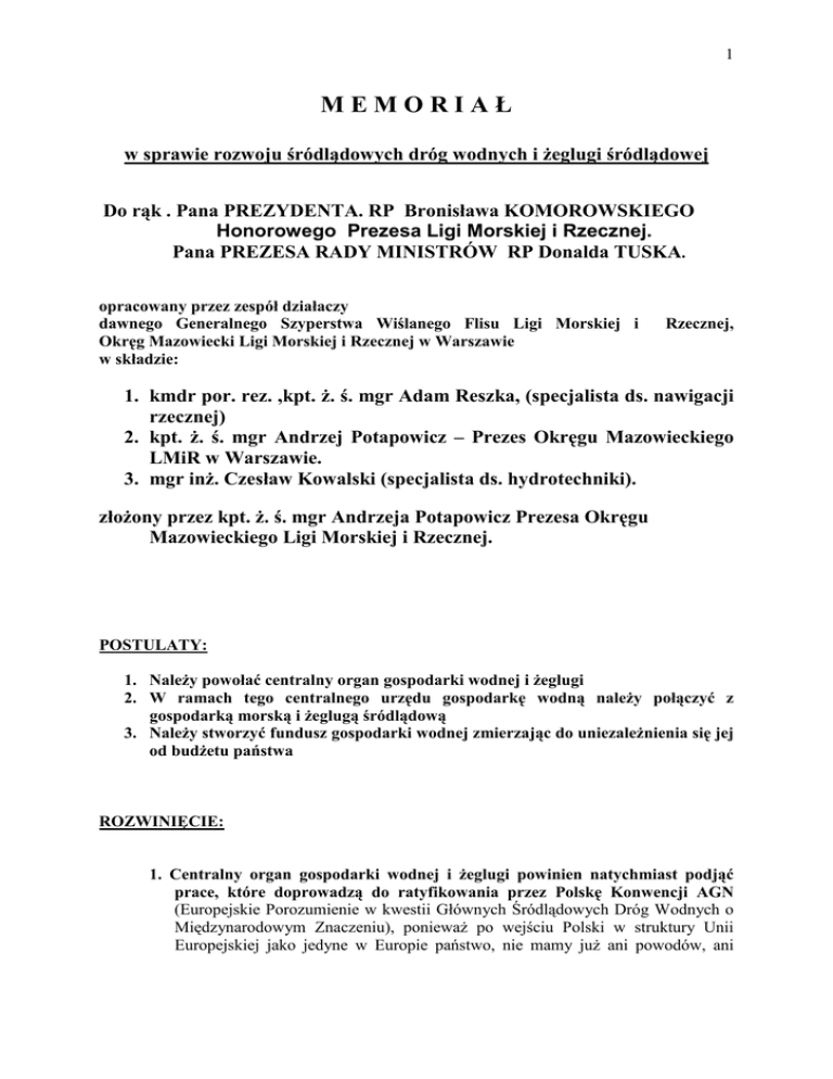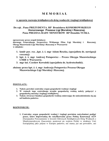 1 MEMORIAŁ w sprawie rozwoju śródlądowych dróg wodnych i Ŝeglugi śródlądowej Do rąk . Pana PREZYDENTA. RP Bronisława KOMOROWSKIEGO Honorowego Prezesa Ligi Morskiej i Rzecznej. Pana PREZESA RADY MINISTRÓW RP Donalda TUSKA. opracowany przez zespół działaczy dawnego Generalnego Szyperstwa Wiślanego Flisu Ligi Morskiej i Okręg Mazowiecki Ligi Morskiej i Rzecznej w Warszawie w składzie: Rzecznej, 1. kmdr por. rez. ,kpt. Ŝ. ś. mgr Adam Reszka, (specjalista ds. nawigacji rzecznej) 2. kpt. Ŝ. ś. mgr Andrzej Potapowicz – Prezes Okręgu Mazowieckiego LMiR w Warszawie. 3. mgr inŜ. Czesław Kowalski (specjalista ds. hydrotechniki). złoŜony przez kpt. Ŝ. ś. mgr Andrzeja Potapowicz Prezesa Okręgu Mazowieckiego Ligi Morskiej i Rzecznej. POSTULATY: 1. NaleŜy powołać centralny organ gospodarki wodnej i Ŝeglugi 2. W ramach tego centralnego urzędu gospodarkę wodną naleŜy połączyć z gospodarką morską i Ŝeglugą śródlądową 3. NaleŜy stworzyć fundusz gospodarki wodnej zmierzając do uniezaleŜnienia się jej od budŜetu państwa ROZWINIĘCIE: 1. Centralny organ gospodarki wodnej i Ŝeglugi powinien natychmiast podjąć prace, które doprowadzą do ratyfikowania przez Polskę Konwencji AGN (Europejskie Porozumienie w kwestii Głównych Śródlądowych Dróg Wodnych o Międzynarodowym Znaczeniu), poniewaŜ po wejściu Polski w struktury Unii Europejskiej jako jedyne w Europie państwo, nie mamy juŜ ani powodów, ani 2 prawa do dalszego przeciwstawiania się Ŝywotnym interesom Unii i jej krajów członkowskich 2. Rozporządzeniem Rady Ministrów naleŜy natychmiast przenieść szlaki Ŝeglowne figurujące w rejestrze dróg wodnych śródlądowych w gestię nowego Centralnego organu gospodarki wodnej i Ŝeglugi, likwidując ten unikalny w skali całego świata eksperyment, przyjmowany wśród obcokrajowców jako Ŝart, a który dotychczas przyniósł Ŝegludze polskiej wręcz nieobliczalne straty. Przez DROGI WODNE naleŜy rozumieć pełne trasy regulacyjne rzek, personel słuŜb liniowych, infrastrukturę budowli hydrotechnicznych przynaleŜnych do dróg wodnych jak stopnie wodne, umocnienia, śluzy i jazy wraz z budynkami, portami, stoczniami i gospodarstwami pomocniczymi. 3. Jak najrychlej przystąpić do odbudowy i rozwojowej modernizacji dróg wodnych pod kierownictwem Centralnego organu gospodarki wodnej i Ŝeglugi, (poniewaŜ bez spełnienia tego warunku dalsza dyskusja o Ŝegludze śródlądowej staje się bezprzedmiotowa, nie ma bowiem Ŝeglugi bez dróg wodnych). RADA MINISTRÓW powinna wreszcie uznać Śródlądowe Drogi Wodne za jeden z istotnych elementów waŜny dla gospodarki narodowej. 4. Powinna zostać określona realna perspektywa ,w której Międzynarodowe Drogi Wodne na obszarze Polski (ok. 2000 km) dostosowane będą do standardu klasy IV z głębokością tranzytową 280 cm. UZASADNIENIE: Istniejąca administracja wodna kierowana przez Krajowy Zarząd Gospodarki Wodnej Ministerstwa Środowiska nastawiona jest zbyt jednostronnie na problematykę ochronną , nie dopuszczając do realizacji jakichkolwiek inwestycji Ŝeglugowych w Polsce. Tymczasem niezbędne jest działanie uwzględniające zarówno potrzeby ochrony środowiska, jak i racjonalnie pojmowanie interesów kraju. . Ministerstwo Środowiska, mające strategiczne znaczenie dla sytuacji, w jakiej znalazła się Ŝegluga śródlądowa, nie dopuszczało dotychczas do Ŝadnej inwestycji dla poprawienia nawigacji i usprawnienia gospodarki wodnej z dofinansowania UE. Ministerstwo Środowiska w swej dotychczasowej praktyce odrzucało róŜne dyrektywy Unii Europejskiej, pomijało je lub lekcewaŜyło z niewyobraŜalną szkodą dla gospodarki narodowej. Prawa właścicielskie w stosunku do wód będących śródlądowymi drogami wodnymi wykonuje Prezes Krajowego Zarządu Gospodarki Wodnej (art.11 Ustawy z dnia 18 lipca 2001 r. Prawo Wodne). Za korzystanie ze śródlądowych dróg wodnych oraz urządzeń wodnych stanowiących własność Skarbu Państwa, pobierane są naleŜności (art. 143 Ustawy Prawo Wodne). NaleŜności te stanowią przychód Narodowego Funduszu Ochrony Środowiska i Gospodarki Wodnej i powinny być przeznaczane m.in. na opracowywanie i wydawanie informacji oraz publikacji z zakresu śródlądowych dróg wodnych (art. 152 Ustawy Prawo Wodne). NaleŜy w tym miejscu zauwaŜyć, Ŝe zapowiadany w r. 2002 INFORMATOR Dróg Wodnych Śródlądowych dotychczas nie ujrzał światła dziennego. Utrzymywanie śródlądowych dróg wodnych w stanie zapewniającym bezpieczną Ŝeglugę naleŜy do jednostek organizacyjnych ministra właściwego do spraw gospodarki wodnej. 3 Zatem na Prezesie KZGW spoczywa obowiązek utrzymywania w sposób zapewniający bezpieczną Ŝeglugę poprzez naleŜyty stan techniczny budowli i urządzeń hydrotechnicznych, systematyczną poprawę warunków eksploatacyjnych odpowiednich do klasy drogi wodnej (art. 43 Ustawy z dnia 21 grudnia 2000 r. o Ŝegludze śródlądowej). Tymczasem Minister Środowiska:. • Od ćwierćwiecza nie buduje na rzekach nowych hydrotechnicznych urządzeń regulacyjnych i w ostatnich latach całkowicie zaprzestał remontów istniejących obiektów, doprowadzając rzeczne szlaki Ŝeglowne do krańcowej ruiny i dekapitalizacji. • ZlekcewaŜył jeden z istotniejszych aktów prawnych kształtujących europejskie akweny, a mianowicie dyrektywę 2000/60/EC z 23 października 2000 r. ustanawiającą ramy wspólnotowego działania w dziedzinie polityki wodnej zwaną potocznie Ramową Dyrektywą Wodną. Ramowa Dyrektywa Wodna w sposób bezpośredni nie odnosi się do transportu wodnego, jednak wyraźnie wyznacza politykę gospodarki wodnej, której transport wodny na Wiśle i Odrze zawsze był istotnym elementem. Uchwalając Ramową Dyrektywę Wodną unijne organy europejskie (co podkreśla się w pkt. 16 przesłanek dyrektywy), miały na uwadze integrację zrównowaŜonego gospodarowania wodą z innymi dziedzinami polityk wspólnotowych