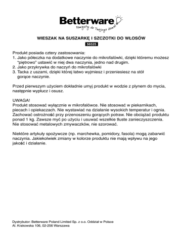 Wieszak na suszarkę i szczotki do włosów 56525 Produkt posiada cztery zastosowania: 1. Jako półeczka na dodatkowe naczynie do mikrofalówki, dzięki któremu możesz “piętrowo” ustawić w niej dwa naczynia, jedno nad drugim. 2. Jako przykrywka do naczyń do mikrofalówki 3. Tacka z uszami, dzięki której łatwo wyjmiesz i przeniesiesz na stół gorące naczynie. Przed pierwszym użyciem dokładnie umyj produkt w wodzie z plynem do mycia, następnie wypłucz i osusz. UWAGA! Produkt stosować wyłącznie w mikrofalówce. Nie stosować w piekarnikach, piecach i opiekaczach. Nie wystawiać na działanie wysokich temperatur i ognia. Zachować ostrożność przy przenoszeniu gorących potraw. Nie obciążać produktu ponad 1 kg. Zawsze myć po użyciu i usuwać wszelkie tłuste zanieczyszczenia. Nie stosować metalowych zmywaczków, nie szorować. Niektóre artykuły spożywcze (np. marchewka, pomidory, fasola) mogą zabarwić naczynia. Jakiekolwiek zmiany w kolorze produktu nie mają wpływu na jego jakość i działanie. Dystrybutor: Betterware Poland Limited Sp. z o.o. Oddział w Polsce Al. Krakowska 106, 02-256 Warszawa
