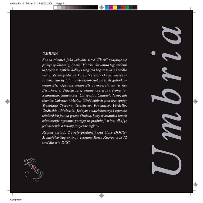 umbria.FH10 Fri Jan 11 23:53:52 2008 Page 1 C M Y CM MY CY CMY UMBRIA Znana równie¿ jako zielone serce W³och znajduje siê pomiêdzy Toskani¹, Lazio i Marche. Struktura tego regionu to przede wszystkim doliny i wzgórza bogate w lasy i ród³a wody. Ze wzglêdu na korzystne warunki klimatyczne zadomowi³o siê tutaj nieprawdopodobnie wiele gatunków winoroli. Upraw¹ winoroli zajmowali siê tu ju¿ Etruskowie. Najbardziej znane czerwone grona to: Sagrantino, Sangiovese, Ciliegiolo i Canaiolo Nero, jak równie¿ Cabernet i Merlot. Wród bia³ych gron wystêpuj¹: Trebbiano Toscano, Grechetto, Procanico, Verdello, Verdicchio i Malvasia. Jednym z najciekawszych rejonów winiarskich jest na pewno Orvieto, który w ostatnich latach odnotowuje ogromne postêpy w produkcji wina, dbaj¹c jednoczenie o walory antyczne regionu. Region posiada 2 strefy produkcji win klasy DOCG: Montefalco Sagrantino i Torgiano Rosso Riserva oraz 12 stref dla win DOC. Composite K umbria.FH10 Fri Jan 11 23:53:52 2008 Page 2 C M Y CM MY CY CMY K Cardeto CAR 1 - PIERLEONE, ORVIETO Classico Secco DOC - Cardeto CAR 2 - ORVIETO Classico Amabile DOC - Cardeto CAR 3 - FEBEO, Orvieto Classico Superiore DOC - Cardeto Przyjemne, wytrawne bia³e wino o barwie s³omkowo-¿ó³tej z delikatnymi zielonymi refleksami. Bukiet intensywny a zarazem delikatny, charakterystyczny ze wzglêdu na bogat¹ gamê aromatów wie¿ych owoców. W smaku wytrawne, pe³ne, eleganckie, dobrze zbalansowane, z wyczuwaln¹ nut¹ bia³ych owoców. Doskona³e jako aperitif. Polecane równie¿ do delikatnych przystawek, ryb i bia³ego miêsa. Grona: Trebbiano, Procanico, Malvasia, Grechetto, Verdello, Drupeggio i Chardonnay. Temperatura serwowania 10-12°C. Delikatne bia³e wino o ¿ó³to-s³omkowej barwie, z delikatnymi zielonymi refleksami. Bukiet intensywny a zarazem subtelny i delikatny, z zauwa¿aln¹ owocow¹ nut¹. W smaku przyjemnie s³odkawe, miêkkie i eleganckie z charakterystycznym akcentem bia³ych owoców. Idealne wino dla osób o delikatnym podniebieniu. Doskonale pasuje do ca³ego posi³ku nie pomijaj¹c deseru. Grona: Trebbiano, Malvasia, Grechetto, Verdello i Drupeggio. Temperatura serwowania 10-12°C. Doskona³e wzorcowe Orvieto to wytrawne bia³e wino o g³êbokiej, s³omkowo¿ó³tej barwie. Bukiet intensywny, kompletny, pe³en akcentów wie¿ych owoców i kwiatów. W smaku wytrawne, dobrze zbalansowane, z wyczuwaln¹ owocow¹ nut¹. Polecane do przystawek z ryb, dañ g³ównych ze skorupiaków oraz dañ na bazie ryb i bia³ego miêsa. Grona: Trebbiano, Procanico, Malvasia, Grechetto, Drupeggio i Chardonnay. Temperatura serwowania 10-12°C. Wino bia³e, wytrawne Wino bia³e, pó³wytrawne Wino bia³e, wytrawne 79 - region - Umbria Composite