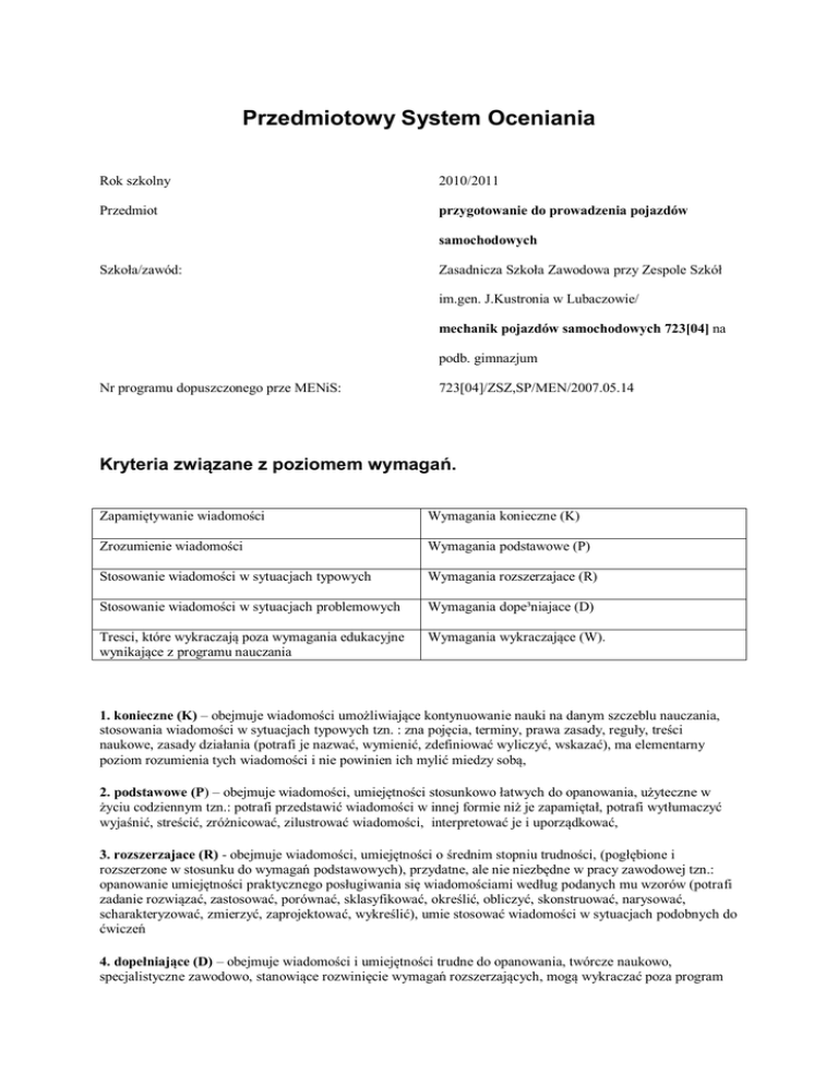 Przedmiotowy System Oceniania Rok szkolny 2010/2011 Przedmiot przygotowanie do prowadzenia pojazdów samochodowych Szkoła/zawód: Zasadnicza Szkoła Zawodowa przy Zespole Szkół im.gen. J.Kustronia w Lubaczowie/ mechanik pojazdów samochodowych 723[04] na podb. gimnazjum Nr programu dopuszczonego prze MENiS: 723[04]/ZSZ,SP/MEN/2007.05.14 Kryteria związane z poziomem wymagań. Zapamiętywanie wiadomości Wymagania konieczne (K) Zrozumienie wiadomości Wymagania podstawowe (P) Stosowanie wiadomości w sytuacjach typowych Wymagania rozszerzajace (R) Stosowanie wiadomości w sytuacjach problemowych Wymagania dope³niajace (D) Tresci, które wykraczają poza wymagania edukacyjne wynikające z programu nauczania Wymagania wykraczające (W). 1. konieczne (K) – obejmuje wiadomości umożliwiające kontynuowanie nauki na danym szczeblu nauczania, stosowania wiadomości w sytuacjach typowych tzn. : zna pojęcia, terminy, prawa zasady, reguły, treści naukowe, zasady działania (potrafi je nazwać, wymienić, zdefiniować wyliczyć, wskazać), ma elementarny poziom rozumienia tych wiadomości i nie powinien ich mylić miedzy sobą, 2. podstawowe (P) – obejmuje wiadomości, umiejętności stosunkowo łatwych do opanowania, użyteczne w życiu codziennym tzn.: potrafi przedstawić wiadomości w innej formie niż je zapamiętał, potrafi wytłumaczyć wyjaśnić, streścić, zróżnicować, zilustrować wiadomości, interpretować je i uporządkować, 3. rozszerzajace (R) - obejmuje wiadomości, umiejętności o średnim stopniu trudności, (pogłębione i rozszerzone w stosunku do wymagań podstawowych), przydatne, ale nie niezbędne w pracy zawodowej tzn.: opanowanie umiejętności praktycznego posługiwania się wiadomościami według podanych mu wzorów (potrafi zadanie rozwiązać, zastosować, porównać, sklasyfikować, określić, obliczyć, skonstruować, narysować, scharakteryzować, zmierzyć, zaprojektować, wykreślić), umie stosować wiadomości w sytuacjach podobnych do ćwiczeń 4. dopełniające (D) – obejmuje wiadomości i umiejętności trudne do opanowania, twórcze naukowo, specjalistyczne zawodowo, stanowiące rozwinięcie wymagań rozszerzających, mogą wykraczać poza program nauczania, tzn.: opanowanie przez ucznia umiejętności formułowania problemów, dokonywania analizy i syntezy nowych zjawisk (potrafi udowodnić, przewidzieć, oceniać, wykryć, zanalizować, zaproponować, zaplanować), umie formułować plan działania, tworzyć oryginalne rozwiązania. Kryteria wymagań na poszczególne oceny dopuszczający dostateczny dobry bardzo dobry celujący wymagania konieczne wymagania podstawowe wymagania rozszerzające wymagania dopełniające wymagania wykraczające K K+P K+P+R K+P+R+D K+P+R+D+W Treść Wymagania edukacyjne PODSTAWOWA TERMINOLOGIA KODEKSU DROGOWEGO Określa cele i zadania ruchu drogowego Określa akty prawne regulujące przepisy ruchu drogowego Interpretuje podstawowe określenia zawarte w ustawie „Prawo o ruchu drogowym” Porównuje zasady obowiązujące w ruchu pieszych i ruchu pojazdów Określa różnicę między masą a ładownością Analizuje przepisy dotyczące zatrzymania i postoju Analizuje przepisy dotyczące wymijania, omijania i cofania K K P R R D D ZNAKI I SYGNAŁY DROGOWE Rozróżnia znaki i sygnały drogowe stosowane na drogach Określa znaczenie znaków i sygnałów drogowych Planuje usytuowanie znaków drogowych pionowych w różnych warunkach Rozwiązuje przykładowe testy egzaminacyjne dotyczące zastosowania znaków i sygnałów drogowych K P R D ZASADY RUCHU DROGOWEGO Określa kolejność stosowania się uczestnika ruchu drogowego do znaków, sygnałów i poleceń Określa dopuszczalne prędkości pojazdów na terenie zabudowanym, poza nim i w strefie zamieszkania Określa pierwszeństwo przejazdu w różnych sytuacjach drogowych Wyjaśnia techniki kierowania pojazdem w różnych warunkach drogowych i atmosferycznych Sporządza schematy sytuacji drogowych zgodnie z zasadami ruchu drogowego Rozwiązuje testy egzaminacyjne z zakresu stosowania zasady ruchu drogowego K K P P R D RUCH POJAZDÓW – TECHNIKI KIEROWANIA POJAZDAMI Charakteryzuje manewry: wymijania, omijania, cofania, wyprzedzania Wyjaśnia zasady zatrzymywania i postoju pojazdów na różnych drogach z powodu uszkodzenia lub wypadkuK Rozróżnia metody i techniki kierowania pojazdem na podstawie opisu sytuacji drogowej Określa warunki wyprzedzania na podstawie opisu sytuacji drogowej Rozpoznaje oznaczenia pojazdu uprzywilejowanego, pojazdu przewożącego materiały niebezpieczne i przewożące dzieci oraz osoby niepełnosprawne Wykonuje na tablicach poglądowych manewrów: włączania się do ruchu, zmiany kierunku jazdy lub pasa, wymijania, omijania, cofania, wyprzedzania K K K P R D PRZYGOTOWANIE POJAZDU DO UŻYTKOWANIA Rozpoznaje przyrządy i elementy sterowania w pojeździe samochodowym Charakteryzuje wyposażenie pojazdu związane z bezpieczeństwem jazdy Określa zakres czynności przed przystąpieniem do jazdy pojazdem samochodowym Określa uprawnienia do kierowania pojazdami Charakteryzuje obsługę codzienną samochodu Charakteryzuje posługiwanie się urządzeniami do kierowania samochodem Porównuje manewry: ruszania, zatrzymania, cofania, zmiany biegów K K P P P R D WARUNKI DOPUSZCZENIA POJAZDÓW DO RUCHU DROGOWEGO Charakteryzuje warunki dopuszczenia i użytkowania pojazdów w ruchu drogowym Opisuje obowiązki właściciela pojazdu związane z rejestracją i badaniami technicznymi K K UPRAWNIENIA DO KIEROWANIA POJAZDAMI I ZASADY KONTROLI W RUCHU DROGOWYM Identyfikuje uprawnienia kierowców wynikające z kategorii prawa jazdy Analizuje kwalifikację prawną czynu związanego z naruszeniem przepisów ruchu drogowego Analizuje uprawnienia policji i służb miejskich w zakresie kontroli drogowejR Analizuje system punktów karnych w odniesieniu do różnych wykroczeń drogowych Wyjaśnia sytuacje drogowe skutkujące zatrzymaniem prawa jazdy lub dowo