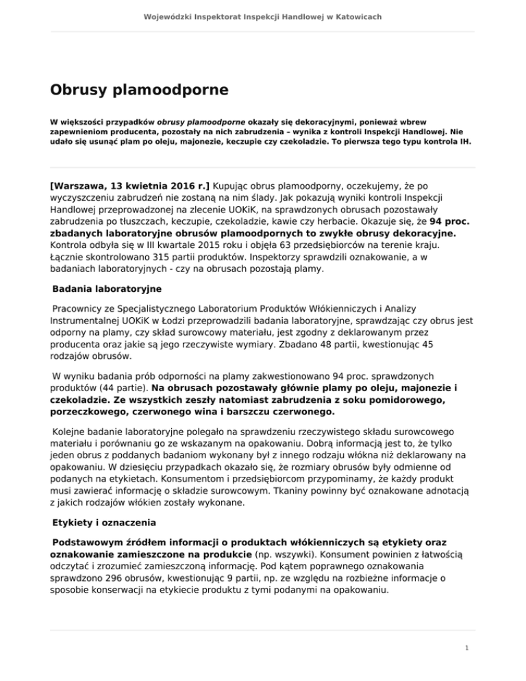 Wojewódzki Inspektorat Inspekcji Handlowej w Katowicach Obrusy plamoodporne W większości przypadków obrusy plamoodporne okazały się dekoracyjnymi, ponieważ wbrew zapewnieniom producenta, pozostały na nich zabrudzenia – wynika z kontroli Inspekcji Handlowej. Nie udało się usunąć plam po oleju, majonezie, keczupie czy czekoladzie. To pierwsza tego typu kontrola IH. [Warszawa, 13 kwietnia 2016 r.] Kupując obrus plamoodporny, oczekujemy, że po wyczyszczeniu zabrudzeń nie zostaną na nim ślady. Jak pokazują wyniki kontroli Inspekcji Handlowej przeprowadzonej na zlecenie UOKiK, na sprawdzonych obrusach pozostawały zabrudzenia po tłuszczach, keczupie, czekoladzie, kawie czy herbacie. Okazuje się, że 94 proc. zbadanych laboratoryjne obrusów plamoodpornych to zwykłe obrusy dekoracyjne. Kontrola odbyła się w III kwartale 2015 roku i objęła 63 przedsiębiorców na terenie kraju. Łącznie skontrolowano 315 partii produktów. Inspektorzy sprawdzili oznakowanie, a w badaniach laboratoryjnych - czy na obrusach pozostają plamy. Badania laboratoryjne Pracownicy ze Specjalistycznego Laboratorium Produktów Włókienniczych i Analizy Instrumentalnej UOKiK w Łodzi przeprowadzili badania laboratoryjne, sprawdzając czy obrus jest odporny na plamy, czy skład surowcowy materiału, jest zgodny z deklarowanym przez producenta oraz jakie są jego rzeczywiste wymiary. Zbadano 48 partii, kwestionując 45 rodzajów obrusów. W wyniku badania prób odporności na plamy zakwestionowano 94 proc. sprawdzonych produktów (44 partie). Na obrusach pozostawały głównie plamy po oleju, majonezie i czekoladzie. Ze wszystkich zeszły natomiast zabrudzenia z soku pomidorowego, porzeczkowego, czerwonego wina i barszczu czerwonego. Kolejne badanie laboratoryjne polegało na sprawdzeniu rzeczywistego składu surowcowego materiału i porównaniu go ze wskazanym na opakowaniu. Dobrą informacją jest to, że tylko jeden obrus z poddanych badaniom wykonany był z innego rodzaju włókna niż deklarowany na opakowaniu. W dziesięciu przypadkach okazało się, że rozmiary obrusów były odmienne od podanych na etykietach. Konsumentom i przedsiębiorcom przypominamy, że każdy produkt musi zawierać informację o składzie surowcowym. Tkaniny powinny być oznakowane adnotacją z jakich rodzajów włókien zostały wykonane. Etykiety i oznaczenia Podstawowym źródłem informacji o produktach włókienniczych są etykiety oraz oznakowanie zamieszczone na produkcie (np. wszywki). Konsument powinien z łatwością odczytać i zrozumieć zamieszczoną informację. Pod kątem poprawnego oznakowania sprawdzono 296 obrusów, kwestionując 9 partii, np. ze względu na rozbieżne informacje o sposobie konserwacji na etykiecie produktu z tymi podanymi na opakowaniu. 1 Wojewódzki Inspektorat Inspekcji Handlowej w Katowicach Efekty kontroli Z ustaleń IH wynika, że obrusy oferowane konsumentom jako plamoodporne w rzeczywistości nimi nie są. W efekcie podjętych działań, 14 sprzedawców poinformowano o stwierdzonych nieprawidłowościach w zakresie oznakowania, natomiast 31 dostawcom nakazano usunięcie wad produktów. Większość przedsiębiorców zastosowało się do uwag, zastępując napis „obrus plamoodporny” słowem „dekoracyjny”. W przypadku wątpliwości co do jakości produktów, polecamy kontakt z Inspekcją Handlową. Dodatkowe informacje dla mediów: Biuro prasowe UOKiK pl. Powstańców Warszawy 1, 00-950 Warszawa Tel. 22 827 28 92, 55 60 314 , 55 60 111 E-mail: [email protected] Twitter: @UOKiKgovPL 2
