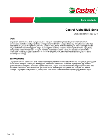 Dane produktu Castrol Alpha BMB Seria Oleje przekładniowe typu CLPF Opis Oleje z serii Castrol Alpha BMB są wysokiej jakości olejami przekładniowymi ze stałymi środkami smarnymi. (dwusiarczek molibdenu/MoS2). Spełniają wymagania normy DIN51517, część 3 i zostały sklasyfikowane jako oleje przekładniowe typu CLPF wg normy DIN51502. Dodatek MoS2 został dokładnie dobrany do oleju bazowego oraz do innych dodatków uszlachetniających. Dzięki tej szczególnie stabilnej suspensji możliwe jest uzyskanie najwyższej efektywności w szerokim zakresie obciążeń. Ponadto oleje te są neutralne u stosunku do uszczelnień i metali kolorowych, wyróżnia je wysoka stabilność w wysokich temperaturach, odporność na starzenie i wyjątkowo dobra ochrona przed korozją. Zastosowanie Oleje przekładniowe z serii Alpha BMB przeznaczone są do przekładni wolnobieżnych i mocno obciążonych, pracujących w warunkach obciążeń szokowych i wibracyjnych. Zapewniają smarowanie przekładni w przypadku, gdy warstwa graniczna wytworzona przez chemiczne czynne substancje, ulegnie na skutek niedostatecznego doprowadzenia oleju znacznemu rozkładowi, a także wówczas, gdy w warunkach rozruchu pod obciążeniem nie zdąży się one jeszcze utworzyć. Oleje Alpha BMB gwarantują zmniejszenie ilości awarii w czasie eksploatacji i sprzyjają tłumieniu drgań. Page 1 of 2 Dane Techniczne Parametr Metoda Jednostka 100 220 320 460 680 1200 Barwa wzrokowa - ciemna ciemna ciemna ciemna ciemna ciemna Gęstość przy 15°C ISO 12185 / ASTM D4052 kg/m³ 887 893 895 898 902 917 Wskaźnik lepkości ISO 2909 / ASTM D2270 - 93 90 94 95 94 101 Lepkość przy 40°C ISO 3104 / ASTM D445 mm²/s 99.1 220 320 457 681 1198 Lepkość przy 100 °C ISO 3104 / ASTM D445 mm²/s 10.9 19 23.8 30.3 38.7 59.6 Temperatura zapłonu (COC) ISO 2592 / ASTM D92 °C 226 230 268 270 284 260 Temperatura płynięcia ISO 3016 / ASTM D97 °C -27 -24 -12 -9 -6 -9 Liczba neutralizacji ISO 6618 / ASTM D974 mgKOH/g 0.32 0.32 0.32 0.32 0.32 0.32 Pozostałość po koksowaniu ISO 6244 / ASTM D482 zawartość % <0.1 <0.1 <0.1 <0.1 <0.1 <0.1 Wzrost liczby kwasowej po 1000 godz. ASTM D4310 mg KOH/g <2.0 <2.0 <2.0 <2.0 <2.0 <2.0 Test na korozję na stali (Woda ISO 7120 / destylowana, 24 godz.) ASTM D665A stopień 0-A 0-A 0-A 0-A 0-A 0-A Test na korozję na miedzi (24 ISO 2160 / godz. przy 100°C) ASTM D130 stopień 1-100 A3 1-100 A3 1-100 A3 1-100 A3 1-100 A3 1-100 A3 Test FZG A/8,3/90 ISO 14635-1 SKS >12 >12 >12 >12 >12 >12 Test FZG A/16,6/140 ISO 14635-1 (zmodyfikowana) SKS >12 >12 >12 >12 >12 >12 Test na pienienie przy 24 °C ISO 6247 / ASTM D892 ml/ml <50/0 <50/0 <50/0 <50/0 <50/0 <50/0 Powyższe dane są typowymi wartościami uzyskiwanymi przy normalnych tolerancjach produkcyjnych i nie stanowią specyfikacji technicznych. Castrol Alpha BMB Seria 28 Jan 2014 Castrol, the Castrol logo and related marks are trademarks of Castrol Limited, used under licence. Prawne wylaczenie Karta produktu i informacje w niej zawarte sa aktualne w momencie jej tworzenie i wydruku. Jednakze , nie dajemy gwarancji ze prezentowane wyrazenia lub zasugerowane zwroty , sa dokladne, precyzyjne i kompletne. Dane zawarte sa oparte na testach wykonanych w warunkach laboratoryjnych i nalezy je traktowac jako wskazówke i ogólna informacje. Uzytkownikom radzimy upewnic sie ze korzystaja z najnowszej wersji karty danych. Uzytkownicy sa odpowiedzialni za bezpieczne uzycie produktu , zgodnie z zastosowaniem i odpowiednim doborem , stosujac sie do wszystkich odpowiednich regulacji i wymagan prawnych. Karta bezpieczenstwa produktu SDS jest dostepna dla wszystkich produktów i powinna byc wykorzystana dla odpowiedniego skladowania, bezpiecznego zastosowania, oraz usuwania , utylizacji produktu. BP , jej filie oraz podmioty wspólpracujace nie ponosza odpowiedzialnosci za jakiekolwiek szkody , zniszczenia i urazy bedace rezultatem nieodpowiedniego uzycia produktu , za jakiekolwiek awarie powstale w wyniku zastosowania niezgodnie z rekomendacja produktu oraz za zagrozenia wlasciwe dla natury i srodowiska . Wszystkie produkty , serwis , obsluga i informacje sa dostarczane zgodnie z standardowymi warunkami sprzedazy. Jesli wymagane sa dodatkowe informacje nalezy sie skontaktowac z lokalnym przedstawicielem sprzedazy. BP Europa SE Oddzial w Polsce, ul. Jasnogórska 1,, 31-358 Kraków, Biuro Handlowe: ul. Chlodna 51 00-867 Warszawa Tel: 0048 22 582 65 00 Fax: 0048 22 582 65 13 www.castrol.pl Page 2 of 2