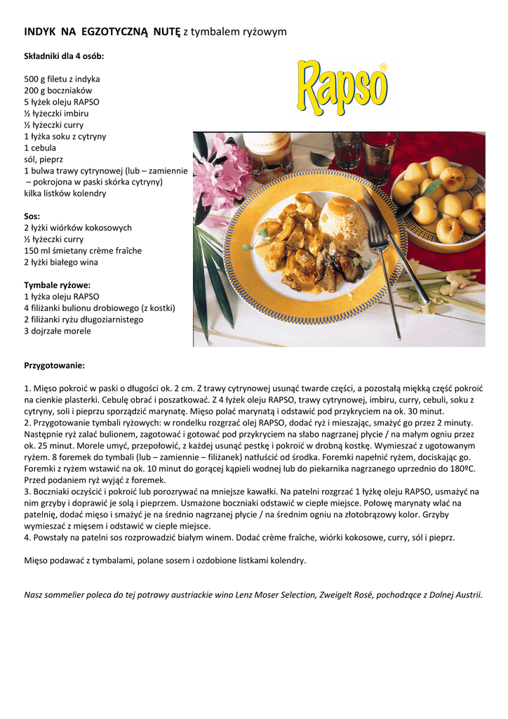 INDYK NA EGZOTYCZNĄ NUTĘ z tymbalem ryżowym Składniki dla 4 osób: 500 g filetu z indyka 200 g boczniaków 5 łyżek oleju RAPSO ½ łyżeczki imbiru ½ łyżeczki curry 1 łyżka soku z cytryny 1 cebula sól, pieprz 1 bulwa trawy cytrynowej (lub – zamiennie – pokrojona w paski skórka cytryny) kilka listków kolendry Sos: 2 łyżki wiórków kokosowych ½ łyżeczki curry 150 ml śmietany crème fraîche 2 łyżki białego wina Tymbale ryżowe: 1 łyżka oleju RAPSO 4 filiżanki bulionu drobiowego (z kostki) 2 filiżanki ryżu długoziarnistego 3 dojrzałe morele Przygotowanie: 1. Mięso pokroić w paski o długości ok. 2 cm. Z trawy cytrynowej usunąć twarde części, a pozostałą miękką część pokroić na cienkie plasterki. Cebulę obrać i poszatkować. Z 4 łyżek oleju RAPSO, trawy cytrynowej, imbiru, curry, cebuli, soku z cytryny, soli i pieprzu sporządzić marynatę. Mięso polać marynatą i odstawić pod przykryciem na ok. 30 minut. 2. Przygotowanie tymbali ryżowych: w rondelku rozgrzać olej RAPSO, dodać ryż i mieszając, smażyć go przez 2 minuty. Następnie ryż zalać bulionem, zagotować i gotować pod przykryciem na słabo nagrzanej płycie / na małym ogniu przez ok. 25 minut. Morele umyć, przepołowić, z każdej usunąć pestkę i pokroić w drobną kostkę. Wymieszać z ugotowanym ryżem. 8 foremek do tymbali (lub – zamiennie – filiżanek) natłuścić od środka. Foremki napełnić ryżem, dociskając go. Foremki z ryżem wstawić na ok. 10 minut do gorącej kąpieli wodnej lub do piekarnika nagrzanego uprzednio do 180ºC. Przed podaniem ryż wyjąć z foremek. 3. Boczniaki oczyścić i pokroić lub porozrywać na mniejsze kawałki. Na patelni rozgrzać 1 łyżkę oleju RAPSO, usmażyć na nim grzyby i doprawić je solą i pieprzem. Usmażone boczniaki odstawić w ciepłe miejsce. Połowę marynaty wlać na patelnię, dodać mięso i smażyć je na średnio nagrzanej płycie / na średnim ogniu na złotobrązowy kolor. Grzyby wymieszać z mięsem i odstawić w ciepłe miejsce. 4. Powstały na patelni sos rozprowadzić białym winem. Dodać crème fraîche, wiórki kokosowe, curry, sól i pieprz. Mięso podawać z tymbalami, polane sosem i ozdobione listkami kolendry. Nasz sommelier poleca do tej potrawy austriackie wino Lenz Moser Selection, Zweigelt Rosé, pochodzące z Dolnej Austrii.
