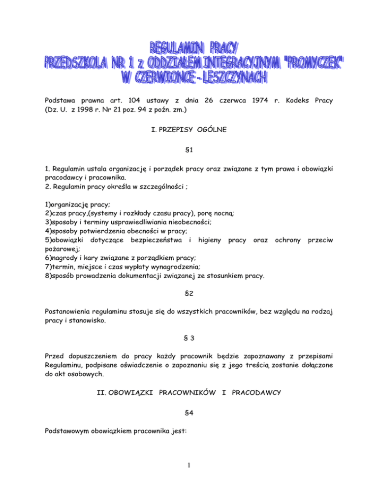 Podstawa prawna art. 104 ustawy z dnia 26 czerwca 1974 r. Kodeks Pracy (Dz. U. z 1998 r. Nr 21 poz. 94 z poźn. zm.) I. PRZEPISY OGÓLNE §1 1. Regulamin ustala organizację i porządek pracy oraz związane z tym prawa i obowiązki pracodawcy i pracownika. 2. Regulamin pracy określa w szczególności ; 1)organizację pracy; 2)czas pracy,(systemy i rozkłady czasu pracy), porę nocną; 3)sposoby i terminy usprawiedliwiania nieobecności; 4)sposoby potwierdzenia obecności w pracy; 5)obowiązki dotyczące bezpieczeństwa i higieny pracy oraz pożarowej; 6)nagrody i kary związane z porządkiem pracy; 7)termin, miejsce i czas wypłaty wynagrodzenia; 8)sposób prowadzenia dokumentacji związanej ze stosunkiem pracy. ochrony przeciw §2 Postanowienia regulaminu stosuje się do wszystkich pracowników, bez względu na rodzaj pracy i stanowisko. §3 Przed dopuszczeniem do pracy każdy pracownik będzie zapoznawany z przepisami Regulaminu, podpisane oświadczenie o zapoznaniu się z jego treścią zostanie dołączone do akt osobowych. II. OBOWIĄZKI PRACOWNIKÓW I PRACODAWCY §4 Podstawowym obowiązkiem pracownika jest: 1 1) rzetelnie i efektywnie wykonywać pracę; 2) stosować się do poleceń przełożonych, które dotyczą pracy, jeżeli nie są one sprzeczne z przepisami prawa lub umową o pracę; 3)przestrzegać czasu pracy ustalonego w zakładzie, w tym punktualne rozpoczynanie i kończenie pracy; 4)przestrzegać regulaminu pracy i ustalonego porządku; 5)przestrzegać przepisów BHP i p. poż. ; 6)podnosić kwalifikacje zawodowe; 7)dbać o dobro zakładu pracy i jego mienie ,zachowywać w tajemnicy informacje, których ujawnienie mogłoby narażać pracodawcę na szkodę, a w przypadku nauczyciela także tajemnicy posiedzeń Rady Pedagogicznej; 8) przestrzegać w zakładzie zasad współżycia społecznego; 9)dbać o czystość i porządek wokół stanowiska pracy; 10)w przypadku rozwiązania stosunku pracy – rozliczenie się ze zobowiązań wobec przedszkola przed ustaniem stosunku pracy; §5 Pracodawca jest zobowiązany w szczególności; 1)zapewnić pracownikom przydział pracy zgodny z treścią zawartej umowy o pracę; 2)wyposażyć pracownika w niezbędne materiały do wykonywania pracy na stanowisku; zaopatrzyć pracowników w ubranie robocze; pracowników obsługi zatrudnionych na stanowiskach, na których ubranie i obuwie może ulec zniszczeniu lub znacznemu uszkodzeniu w obuwie oraz ubranie robocze (fartuch ochronny), wyposażyć pracowników pedagogicznych w obuwie zmienne (robocze) do pracy; 3)zaznajomić pracownika podejmującego pracę z zakresem jego obowiązków oraz z jego uprawnieniami; 4)organizować pracę w sposób zapewniający pełne wykorzystanie czasu pracy i wysoką wydajność; 5)terminowo i prawidłowo wypłacać wynagrodzenie, prowadzić dokumentację wynagrodzeń i udostępniać ją na życzenie pracownika, 6)ułatwić pracownikom podnoszenie kwalifikacji zawodowych i stwarzać warunki do awansu zawodowego nauczycieli; 7)zaspokajać w miarę posiadanych środków socjalne potrzeby pracowników oraz dbać o ochronę zdrowia; 8)niezwłocznie wydać pracownikom świadectwo pracy w przypadku rozwiązania lub wygaśnięcia stosunku pracy; 9)prowadzić i należycie przechowywać akta osobowe pracowników; 10)stosować obiektywne i sprawiedliwe kryteria oceny pracowników; 11)stwarzać klimat współpracy i wpływać na kształtowanie właściwych zasad współżycia społecznego. 2 III. CZAS PRACY §6 Czas pracy – to czas , w którym pracownik pozostaje do dyspozycji pracodawcy w zakładzie pracy lub innym miejscu wyznaczonym do wykonywania pracy. §7 1. Czas pracy w pełnym wymiarze wynosi; 1)dla nauczycieli nie więcej niż 40 godzin tygodniowo, w tym liczba godzin zajęć dydaktycznych, wychowawczych, i opiekuńczych w art., 42, ust. 3 lub ust.2 a i 4 a Karty Nauczyciela; 2)dla pracowników nie będących nauczycielami czas pracy nie może przekraczać 8 godzin na dobę i przeciętnie 40 godzin w pięciodniowym tygodniu pracy, w przyjętym okresie rozliczeniowym nie przekraczającym 4 miesięcy. 2. Praca wykonywana ponad wymiar określona w; 1) ust. 1 pkt 1 stanowi pracę w godzinach ponadwymiarowych; 2) ust. 1 pkt 2 stanowi pracę w godzinach nadliczbowych; §8 1. Obecność w pracy pracownik nie będący nauczycielem potwierdza osobiście podpisem na liście obecności bezpośrednio po przyjściu do przedszkola. 2. Nauczyciel potwierdza obecność w pracy odpowiednim wpisem do dziennika zajęć. §9 1. Pracownik nie będący nauczycielem rozpoczyna pracę o godzinie 7:00 i kończy o 15:00 . Przedszkole może dla niektórych stanowisk pracy lub pracowników ustalić inny czas rozpoczynania i kończenia pracy, zależnie od potrzeb wynikających z realizacji bieżących zadań, jednak z zachowaniem obowiązującego czasu pracy. 2. Nauczyciel rozpoczyna i kończy zajęcia dydaktyczne, wychowawcze i opiekuńcze zgodnie z tygodniowym rozkładem zajęć. Pozostałe czynności i zajęcia związane z przydziałem zadań, nauczyciel realizuje w czasie określonym indywidualnie. 3. Pracownicy zamieszkali poza siedzibą przedszkola, ze względu na specyficzne warunki komunikacyjne, mogą wyjątkowo uzyskać pozwolenie na zmianę godzin pracy, wynikającą z opóźnienia przyjazdu do pracy. 4. Pora nocna trwa od godziny 22:00 do godziny 6:00. 3 IV. URLOPY I ZWOLNIENIA OD PRACY §10 1. Urlopu wypoczynkowego udziela się zgodnie z planem urlopów lub ustala jego termin w porozumieniu z pracownikiem. Plan urlopów ustala się biorąc pod uwagę wnioski pracowników i potrzeby wynikające z konieczności zapewnienia normalnego toku pracy. Pracodawca może odstąpić od ustalenia planu urlopów jeżeli zakładowa organizacja związkowa wyraziła na to zgodę. 2. Plan urlopów podaje się do wiadomości. O terminie urlopu zawiadamia się pracowników nie później niż na miesiąc przed dniem jego rozpoczęcia. 3. Pracownik może rozpocząć urlop wyłącznie po uzyskaniu