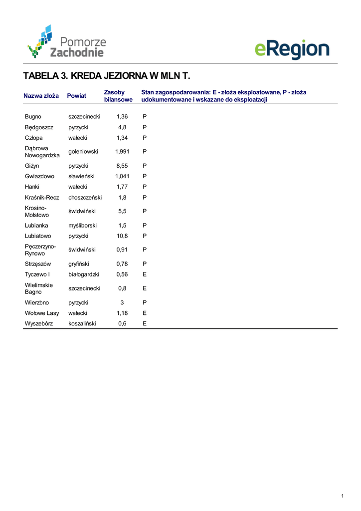 TABELA 3. KREDA JEZIORNA W MLN T. Zasoby bilansowe Stan zagospodarowania: E - złoża eksploatowane, P - złoża udokumentowane i wskazane do eksploatacji Nazwa złoża Powiat Bugno szczecinecki 1,36 P Będgoszcz pyrzycki 4,8 P Człopa wałecki 1,34 P Dąbrowa Nowogardzka goleniowski 1,991 P Giżyn pyrzycki 8,55 P Gwiazdowo sławieński 1,041 P Hanki wałecki 1,77 P Kraśnik-Recz choszczeński 1,8 P KrosinoMołstowo świdwiński 5,5 P Lubianka myśliborski 1,5 P Lubiatowo pyrzycki 10,8 P PęczerzynoRynowo świdwiński 0,91 P Strzęszów gryfiński 0,78 P Tyczewo I białogardzki 0,56 E Wielimskie Bagno szczecinecki 0,8 E Wierzbno pyrzycki 3 P Wołowe Lasy wałecki 1,18 E Wyszebórz koszaliński 0,6 E 1