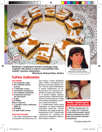 Testowała pis Przyślij prze redakcyjna kucharka Rodzinie i znajomym bardzo smakują moje wypieki. Na jedną z imprez wymyśliłam taki szybki i pyszny makowiec. Wiesława Dobrychłop, Golina Przepis przysłała Wiesława Dobrychłop Łatwy makowiec SKŁADNIKI ● 1,5 szklanki mąki ● 3/4 szklanki kaszy manny ● 1 szklanka cukru ● 1/2 kostki margaryny ● 1/2 szklanki śmietany ● 2 łyżeczki proszku do pieczenia ● 3 jaja ● 2 żółtka Masa makowa: ● 1 puszka masy makowej (850 g) ● 2 białka ● 2 łyżki bułki tartej PRZYGOTOWANIE 1. Do miski wsypujemy mąkę z proszkiem do pieczenia, ka- szę manną i cukier, dodajemy jajka, żółtka i roztopioną margarynę. Ucieramy gładkie ciasto. Trochę ciasta odkładamy, a resztę wykładamy na natłuszczoną lub wyłożoną papierem do pieczenia blachę. 2. Z dwóch białek ubijamy sztywną pianę. Delikatnie mieszamy z masą makową i bułką tartą. Masę wykładamy na ciasto i rozsmarowujemy. 3. Z odłożonego ciasta łyżką układamy na masie makowej cieniutkie paseczki. Ciasto wkładamy do rozgrzanego do temperatury 180 °C piekarnika i pieczemy ok. 1 godziny. Po upieczeniu makowiec dekorujemy białym lukrem. Rady redakcyjnej kucharki Krystyny ● Możemy zrezygnować z lu- kru, a upieczone i ostudzone ciasto obficie posypać cukrem pudrem (najlepiej przez sitko) albo oblać polewą czekoladową (gotową). Przyślij przepis 59 PP0109s5659.indd 59 15-12-08 12:30:46