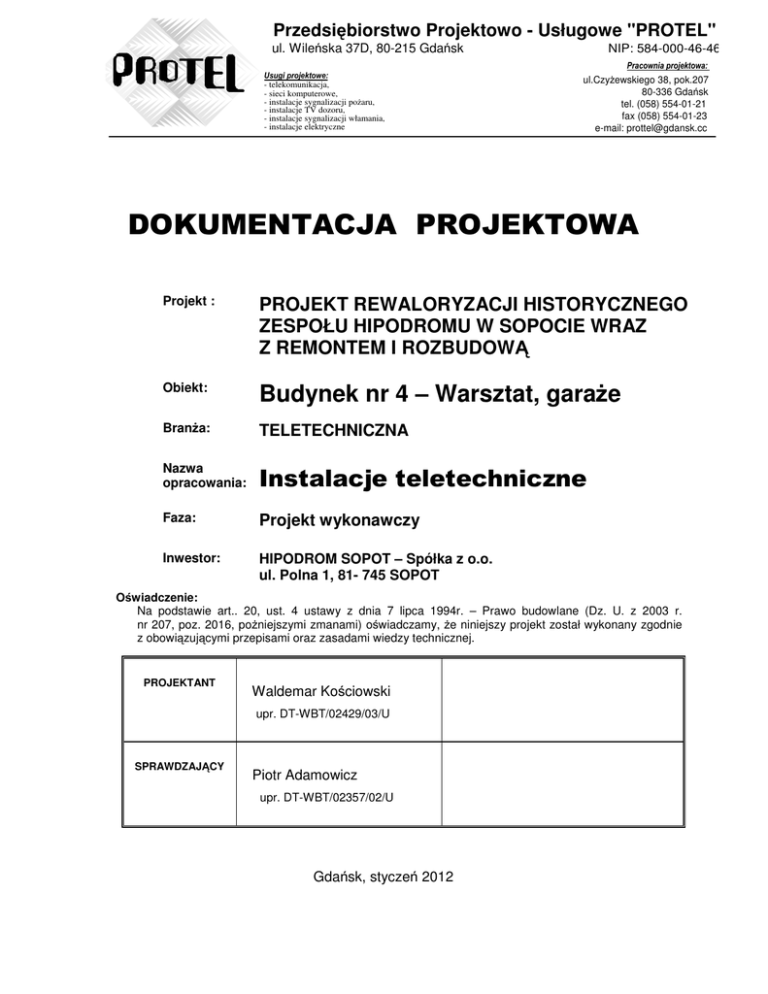Przedsiębiorstwo Projektowo - Usługowe "PROTEL" ul. Wileńska 37D, 80-215 Gdańsk NIP: 584-000-46-46 Pracownia projektowa: Usugi projektowe: - telekomunikacja, - sieci komputerowe, - instalacje sygnalizacji pożaru, - instalacje TV dozoru, - instalacje sygnalizacji włamania, - instalacje elektryczne ul.Czyżewskiego 38, pok.207 80-336 Gdańsk tel. (058) 554-01-21 fax (058) 554-01-23 e-mail: [email protected] DOKUMENTACJA PROJEKTOWA Projekt : PROJEKT REWALORYZACJI HISTORYCZNEGO ZESPOŁU HIPODROMU W SOPOCIE WRAZ Z REMONTEM I ROZBUDOWĄ Obiekt: Budynek nr 4 – Warsztat, garaże Branża: TELETECHNICZNA Nazwa opracowania: Instalacje teletechniczne Faza: Projekt wykonawczy Inwestor: HIPODROM SOPOT – Spółka z o.o. ul. Polna 1, 81- 745 SOPOT Oświadczenie: Na podstawie art.. 20, ust. 4 ustawy z dnia 7 lipca 1994r. – Prawo budowlane (Dz. U. z 2003 r. nr 207, poz. 2016, pożniejszymi zmanami) oświadczamy, że niniejszy projekt został wykonany zgodnie z obowiązującymi przepisami oraz zasadami wiedzy technicznej. PROJEKTANT Waldemar Kościowski upr. DT-WBT/02429/03/U SPRAWDZAJĄCY Piotr Adamowicz upr. DT-WBT/02357/02/U Gdańsk, styczeń 2012 Spis treści 1. 2. DANE OGÓLNE ......................................................................................................................................... 3 1.1. INFORMACJE OGÓLNE O INSTALACJACH TELETECHNICZNYCH NA TERENIE ZESPOŁU HIPODROMU ........ 3 1.2. PRZEDMIOT I ZAKRES OPRACOWANIA ................................................................................................... 4 1.3. PODSTAWA OPRACOWANIA ................................................................................................................... 5 1.4. PROJEKTY ZWIĄZANE............................................................................................................................ 5 1.5. UWAGI INSTALACYJNO – MONTAŻOWE:................................................................................................ 5 DANE OGÓLNE O BUDYNKU NR 4 – WARSZTAT, GARAŻE......................................................... 6 2.1. 3. 4. ZAKRES RZECZOWY .............................................................................................................................. 6 INSTALACJE TELETECHNICZNE........................................................................................................ 7 3.1. ZESTAWIENIE PRZEŁĄCZNIC ................................................................................................................. 7 3.2. ZESTAWIENIE MATERIAŁÓW ................................................................................................................. 7 SYSTEM SYGNALIZACJI POŻARU...................................................................................................... 7 4.1. CHARAKTERYSTYKA OBIEKTU .............................................................................................................. 7 4.2. PODSTAWA OPRACOWANIA PROJEKTU .................................................................................................. 8 4.3. ZAKRES ZABEZPIECZENIA INSTALACJĄ SAP ......................................................................................... 9 4.4. OPIS SYSTEMU SYGNALIZACJI POŻARU ................................................................................................. 9 4.5. STEROWANIE URZĄDZENIAMI ZEWNĘTRZNYMI ....................................................................................12 4.5.1. Sygnalizacja o zagrożeniu pożarem. ..............................................................................................14 4.5.2. Sterowanie systemem wentylacji bytowej .......................................................................................15 4.6. 4.6.1. Technologia wykonania..................................................................................................................15 4.6.2. Odbiór robót...................................................................................................................................17 4.7. 5. MONTAŻ URZĄDZEŃ I INSTALACJI........................................................................................................15 URZĄDZENIA I MATERIAŁY ..................................................................................................................17 UWAGI O ZASTOSOWANYCH MATERIAŁACH..............................................................................18 Spis rysunków TT1/1 Instalacje teletechniczne. Schemat okablowania w budynku nr 4. TT2/2 Instalacje teletechniczne. Plan instalacji telefonicznych. TP1/3 Instalacja systemu sygnalizacji pożaru. Schemat blokowy. TP2/4 Instalacja systemu sygnalizacji pożaru. Schemat rzut poziomu parteru. TP3/5 Instalacja systemu sygnalizacji pożaru. Schemat rzut poziomu piętra. 2 OPIS TECHNICZNY PROJEKT WYKONAWCZY Rewitalizacja historycznego zespołu hipodromu w Sopocie wraz z remontem i rozbudową Budynek nr 4. Warsztat, garaże Instalacje teletechniczne 1. Dane ogólne 1.1. Informacje ogólne o instalacjach teletechnicznych na terenie zespołu hipodromu Projektuje się rewaloryzację historycznego zespołu hipodromu w Sopocie wraz z remontem i rozbudową. Projektuje się wykonanie w poszczególnych obiektach zespołu hipodromu instalacji teletechnicznych według potrzeb technologicznych danego obiektu oraz zgodnie z obowiązującymi przepisami. Na terenie zespołu hipodromu zarządcą głównym będzie Hipodrom Sopot Sp. z o.o. Ponadto będą wydzieleni użytkownicy zespołu pensjonatów, lecznicy konia i budynku mieszkalnego. Budynki nr 11 – Hotel, Pawilon, nr 10 – Stara waga, nr 8 – Stare kasy będą odbudowane jako budynki dla potrzeb apartamentów pensjonatu. Budynek nr 5 – Lecznica konia i budynek nr 6 – Budynek mieszkalny będą budowane jako nowe. Wyżej wymienione budynki (nr 5, 6, 8, 10, 11) nie wchodzą w zakres niniejszego opracowania. Niniejszy Projekt wykonawczy obejmuje in