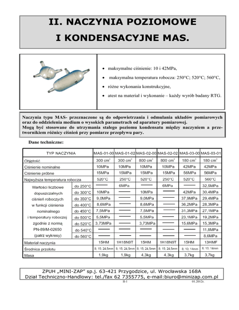 II. NACZYNIA POZIOMOWE I KONDENSACYJNE MAS. • maksymalne ciśnienie: 10 i 42MPa, • maksymalna temperatura robocza: 250°C; 520°C; 560°C, • róŜne wykonania konstrukcyjne, • atest na materiał i wykonanie – kaŜdy wyrób badany RTG. Naczynia typu MAS- przeznaczone są do odpowietrzania i odmulania układów pomiarowych oraz do oddzielenia medium o wysokich parametrach od aparatury pomiarowej. Mogą być stosowane do utrzymania stałego poziomu kondensatu między naczyniem a przetwornikiem róŜnicy ciśnień przy pomiarze przepływu pary. Dane techniczne: ZPUH „MINI-ZAP” sp.j. 63-421 Przygodzice, ul. Wrocławska 168A Dział Techniczno-Handlowy: tel./fax 62 7355775, e-mail:[email protected] II-1 01.2012r. NACZYNIA POZIOMOWE I KONDENSACYJNE 1. NACZYNIE MAS-01. Rysunek gabarytowy. Sposób zamawiania: MAS-01- Naczynie Kod 1 00/ 15HM 02/ 1H18N9T Rodzaj materiału wykonanie normalne wykonanie kwasoodporne Kod 2 1 ø31,8x3,6 2 ø21,3x2,9 3 ø14x2,5 Rodzaj króćca - A -wymiar Kod 3 Rodzaj króćca - B -wymiar -1 ø21,3x2,9 -2 ø14x2,5 -3 końcówka kulista B32-8 Kod 4 Rodzaj króćca - C -wymiar -0 bez króćca -1 ø21,3x2,9 -2 ø14x2,5 MAS-01- 02/ 3 -2 -3 Przykład oznaczenia naczynia ZPUH „MINI-ZAP” sp.j. 63-421 Przygodzice, ul. Wrocławska 168A Dział Techniczno-Handlowy: tel./fax 62 7355775, e-mail:[email protected] II-2 NACZYNIA POZIOMOWE I KONDENSACYJNE 2. NACZYNIE MAS-02. Rysunek gabarytowy. Sposób zamawiania: MAS-02- Naczynie Kod 1 00/ 15HM 02/ 1H18N9T Rodzaj materiału wykonanie normalne wykonanie kwasoodporne Kod 2 1 ø31,8x3,6 2 ø21,3x2,9 3 ø14x2,5 Rodzaj króćca - A -wymiar Kod 3 Rodzaj króćca - B -wymiar -1 ø21,3x2,9 -2 ø14x2,5 -3 końcówka kulista B32-8 Kod 4 Rodzaj króćca - C -wymiar -1 ø21,3x2,9 -2 ø14x2,5 -3 końcówka kulista B32-8 MAS-02- 00/ 3 -2 -3 Przykład oznaczenia naczynia ZPUH „MINI-ZAP” sp.j. 63-421 Przygodzice, ul. Wrocławska 168A Dział Techniczno-Handlowy: tel./fax 62 7355775, e-mail:[email protected] II-3 NACZYNIA POZIOMOWE I KONDENSACYJNE 3. NACZYNIE MAS-03. Rysunek gabarytowy. Sposób zamawiania: MAS-03- Naczynie Kod 1 00/ 15HM 01/ 13HMF Rodzaj materiału wykonanie normalne wykonanie normalne Kod 2 1 ø31,8x8,8 2 ø24x7,1 - Rodzaj króćca - A -wymiar Kod 3 -1 ø24x7,1 -2 ø14x2,5 - Rodzaj króćca - B -wymiar Kod 4 Rodzaj króćca - C -wymiar -0 bez króćca -1 ø24x7,1 -2 ø14x2,5 MAS-03- 00/ 2 -2 -0 Przykład oznaczenia naczynia ZPUH „MINI-ZAP” sp.j. 63-421 Przygodzice, ul. Wrocławska 168A Dział Techniczno-Handlowy: tel./fax 62 7355775, e-mail:[email protected] II-4 NACZYNIA POZIOMOWE I KONDENSACYJNE ZPUH „MINI-ZAP” sp.j. 63-421 Przygodzice, ul. Wrocławska 168A Dział Techniczno-Handlowy: tel./fax 62 7355775, e-mail:[email protected] II-5