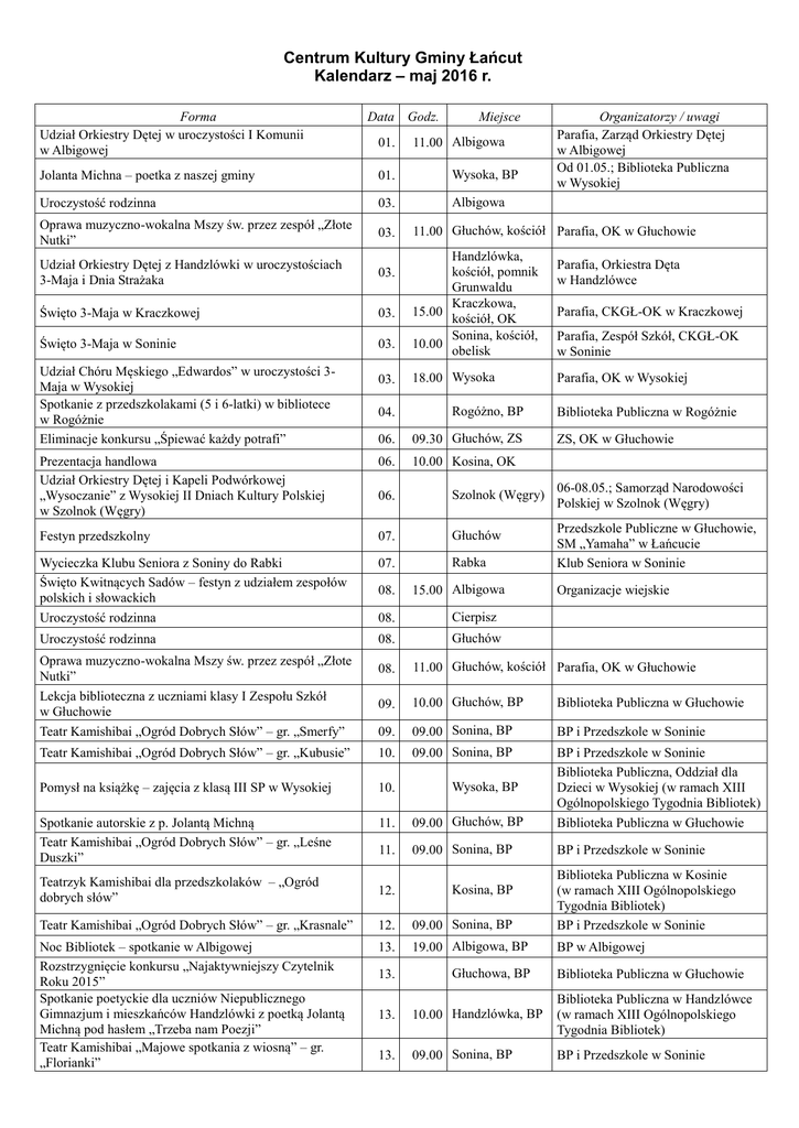 Centrum Kultury Gminy Łańcut Kalendarz – maj 2016 r. Forma Udział Orkiestry Dętej w uroczystości I Komunii w Albigowej Data Godz. 01. Miejsce 11.00 Albigowa Jolanta Michna – poetka z naszej gminy 01. Wysoka, BP Uroczystość rodzinna 03. Albigowa Oprawa muzyczno-wokalna Mszy św. przez zespół „Złote Nutki” 03. Udział Orkiestry Dętej z Handzlówki w uroczystościach 3-Maja i Dnia Strażaka 03. Święto 3-Maja w Kraczkowej 03. Święto 3-Maja w Soninie 03. Udział Chóru Męskiego „Edwardos” w uroczystości 3Maja w Wysokiej Spotkanie z przedszkolakami (5 i 6-latki) w bibliotece w Rogóżnie Eliminacje konkursu „Śpiewać każdy potrafi” 03. 11.00 Głuchów, kościół Parafia, OK w Głuchowie Handzlówka, kościół, pomnik Grunwaldu Kraczkowa, 15.00 kościół, OK Sonina, kościół, 10.00 obelisk 18.00 Wysoka 04. Rogóżno, BP 06. 09.30 Głuchów, ZS Prezentacja handlowa Udział Orkiestry Dętej i Kapeli Podwórkowej „Wysoczanie” z Wysokiej II Dniach Kultury Polskiej w Szolnok (Węgry) 06. 10.00 Kosina, OK 06. Szolnok (Węgry) Festyn przedszkolny 07. Głuchów Wycieczka Klubu Seniora z Soniny do Rabki Święto Kwitnących Sadów – festyn z udziałem zespołów polskich i słowackich Uroczystość rodzinna 07. Rabka 08. Cierpisz Uroczystość rodzinna 08. Głuchów Oprawa muzyczno-wokalna Mszy św. przez zespół „Złote Nutki” Lekcja biblioteczna z uczniami klasy I Zespołu Szkół w Głuchowie Teatr Kamishibai „Ogród Dobrych Słów” – gr. „Smerfy” 08. Organizatorzy / uwagi Parafia, Zarząd Orkiestry Dętej w Albigowej Od 01.05.; Biblioteka Publiczna w Wysokiej 15.00 Albigowa Parafia, Orkiestra Dęta w Handzlówce Parafia, CKGŁ-OK w Kraczkowej Parafia, Zespół Szkół, CKGŁ-OK w Soninie Parafia, OK w Wysokiej Biblioteka Publiczna w Rogóżnie ZS, OK w Głuchowie 06-08.05.; Samorząd Narodowości Polskiej w Szolnok (Węgry) Przedszkole Publiczne w Głuchowie, SM „Yamaha” w Łańcucie Klub Seniora w Soninie Organizacje wiejskie 08. 11.00 Głuchów, kościół Parafia, OK w Głuchowie 09. 10.00 Głuchów, BP Biblioteka Publiczna w Głuchowie 09. 09.00 Sonina, BP BP i Przedszkole w Soninie Teatr Kamishibai „Ogród Dobrych Słów” – gr. „Kubusie” 10. 09.00 Sonina, BP Pomysł na książkę – zajęcia z klasą III SP w Wysokiej 10. Spotkanie autorskie z p. Jolantą Michną Teatr Kamishibai „Ogród Dobrych Słów” – gr. „Leśne Duszki” 11. 09.00 Głuchów, BP BP i Przedszkole w Soninie Biblioteka Publiczna, Oddział dla Dzieci w Wysokiej (w ramach XIII Ogólnopolskiego Tygodnia Bibliotek) Biblioteka Publiczna w Głuchowie 11. 09.00 Sonina, BP BP i Przedszkole w Soninie Teatrzyk Kamishibai dla przedszkolaków – „Ogród dobrych słów” 12. Kosina, BP Teatr Kamishibai „Ogród Dobrych Słów” – gr. „Krasnale” 12. 09.00 Sonina, BP Biblioteka Publiczna w Kosinie (w ramach XIII Ogólnopolskiego Tygodnia Bibliotek) BP i Przedszkole w Soninie Noc Bibliotek – spotkanie w Albigowej Rozstrzygnięcie konkursu „Najaktywniejszy Czytelnik Roku 2015” Spotkanie poetyckie dla uczniów Niepublicznego Gimnazjum i mieszkańców Handzlówki z poetką Jolantą Michną pod hasłem „Trzeba nam Poezji” Teatr Kamishibai „Majowe spotkania z wiosną” – gr. „Florianki” 13. 19.00 Albigowa, BP BP w Albigowej 13. Głuchowa, BP Wysoka, BP Biblioteka Publiczna w Głuchowie 13. 10.00 Handzlówka, BP Biblioteka Publiczna w Handzlówce (w ramach XIII Ogólnopolskiego Tygodnia Bibliotek) 13. 09.00 Sonina, BP BP i Przedszkole w Soninie Majówka – spotkanie Klubu Seniora w Albigowej Spotkanie Koła Poetów Gminy Łańcut i Grupy Twórczej „Inspiratio” Uroczystość rodzinna Przygotowanie i przeprowadzenie konkursu “Handzlówka wczoraj i dziś“ podczas otwarcia solarnej trasy spaceroworowerowej w Handzlówce Turniej warcabów błyskawicznych podczas otwarcia solarnej trasy spacerowo-rowerowej w Handzlówce Udział Orkiestry Dętej w uroczystości I Komunii w Handzlówce 14. 18.00 Albigowa Zarząd Klubu Seniora, OK w Albigowej 14. 17.00 Cierpisz CKGŁ-BP w Cierpiszu 15. Głuchów 15. Handzlówka Biblioteka Publiczna w Handzlówce (w ramach XIII Ogólnopolskiego Tygodnia Bibliotek) 15. Handzlówka OK w Głuchowie, Stanisław Mazur Otwarcie solarnej trasy spacerowo-rowerowej w Handzlówce 15. Uroczystość rodzinna 15. Parafia, Orkiestra Dęta w Handzlówce HKS „Grom – SZIK”, Fundacja BZ Handzlówka, WBK, Wyciąg Narciarski „Staś”, 15.00 Wyciąg OSP, 12 WDH, CKGŁ – OK, BP Narciarski „Staś” w Handzlówce Kosina, OK XIII Smaki i Aromaty z Galicyjskiej Chaty 15. 15.00 Sonina, OK Udział zespołów „Hop Siup” z Albigowej i „Śwagry” z Soniny w Podkarpackim Festiwalu Zespołów Folkowych w Ulanowie 15. Ulanów Uroczystość rodzinna 21. VIII Przegląd Pieśni Maryjnej „Cześć Maryi” 22. Albigowa Cierpisz, obok 14.00 kościoła Parafia organizacje wiejskie, CKGŁOK, BP w Cierpiszu 22. 14.00 Markowa CK Markowa 24. 14.00 Cierpisz Rogóżno, Święte Jezioro BP w Cierpiszu Udział zespołów „Nasturcje” z Głuchowa, „Rogóżnianki” z Rogóżna i śpiewaczego seniorów z Wysokiej w Przeglądzie Pieśni Maryjnej w Markowej Piknik z książką Spotkanie Klubu Seniora z seniorami z ODK Tysiąclecia z Rzeszowa Dzień Mamy i Taty 15. 24. 10.30 Handzlówka, kościół Powiatowa Rada KGW w Łańcucie, KGW, CKGŁ-OK w Soninie GCK w Ulanowie, WDK w Rzeszowie Klub Seniora, OK w Rogóżnie godz. 10 i 13; Przedszkole w Albigowej 25. 10.00 Albigowa 26. 11.00 Głuchów, kościół Parafia, OK w Głuchowie 26. 10.30 Handzlówka Parafia, Orkiestra Dęta w Handzlówce 26. 10.30 Wysoka Parafia, OK w Wysokiej Festyn parafialny 29. 16.00 Festyn rodzinny „Parafiada” – impreza integrująca mieszkańców i organizacje 29. Udział Zespołu „Złote Nutki” w uroczystości Bożego Ciała w Głuchowie Udział Orkiestry Dętej w uroczystości Bożego Ciała w Handzlówce Udział Orkiestry Dętej i Chóru Męsk