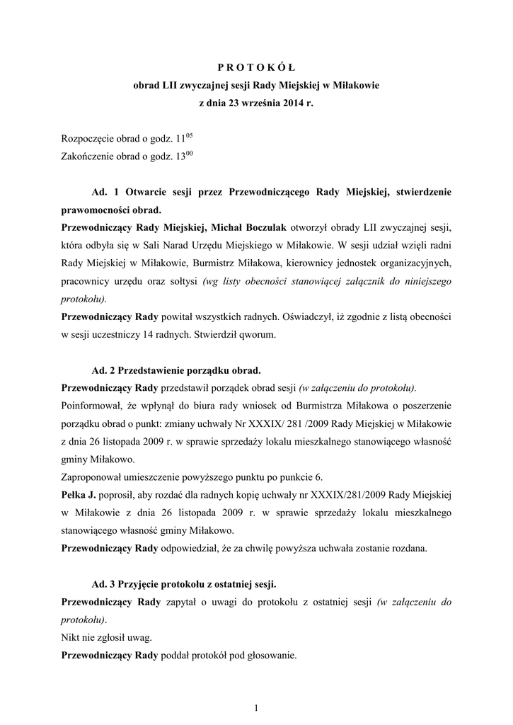 PROTOKÓŁ obrad LII zwyczajnej sesji Rady Miejskiej w Miłakowie z dnia 23 września 2014 r. Rozpoczęcie obrad o godz. 1105 Zakończenie obrad o godz. 1300 Ad. 1 Otwarcie sesji przez Przewodniczącego Rady Miejskiej, stwierdzenie prawomocności obrad. Przewodniczący Rady Miejskiej, Michał Boczulak otworzył obrady LII zwyczajnej sesji, która odbyła się w Sali Narad Urzędu Miejskiego w Miłakowie. W sesji udział wzięli radni Rady Miejskiej w Miłakowie, Burmistrz Miłakowa, kierownicy jednostek organizacyjnych, pracownicy urzędu oraz sołtysi (wg listy obecności stanowiącej załącznik do niniejszego protokołu). Przewodniczący Rady powitał wszystkich radnych. Oświadczył, iż zgodnie z listą obecności w sesji uczestniczy 14 radnych. Stwierdził qworum. Ad. 2 Przedstawienie porządku obrad. Przewodniczący Rady przedstawił porządek obrad sesji (w załączeniu do protokołu). Poinformował, że wpłynął do biura rady wniosek od Burmistrza Miłakowa o poszerzenie porządku obrad o punkt: zmiany uchwały Nr XXXIX/ 281 /2009 Rady Miejskiej w Miłakowie z dnia 26 listopada 2009 r. w sprawie sprzedaży lokalu mieszkalnego stanowiącego własność gminy Miłakowo. Zaproponował umieszczenie powyższego punktu po punkcie 6. Pełka J. poprosił, aby rozdać dla radnych kopię uchwały nr XXXIX/281/2009 Rady Miejskiej w Miłakowie z dnia 26 listopada 2009 r. w sprawie sprzedaży lokalu mieszkalnego stanowiącego własność gminy Miłakowo. Przewodniczący Rady odpowiedział, że za chwilę powyższa uchwała zostanie rozdana. Ad. 3 Przyjęcie protokołu z ostatniej sesji. Przewodniczący Rady zapytał o uwagi do protokołu z ostatniej sesji (w załączeniu do protokołu). Nikt nie zgłosił uwag. Przewodniczący Rady poddał protokół pod głosowanie. 1 W wyniku głosowania stosunkiem głosów 14-za, protokół z LI sesji nadzwyczajnej został przyjęty. Ad. 4 Informacja Burmistrza z pracy między sesjami. Przewodniczący Rady oddał głos dla Burmistrza Miłakowa. Burmistrz poinformował, że: 1. Odbyłem spotkanie z Sekretarzem Stanu w Ministerstwie Kultury i Dziedzictwa Narodowego, Panem Piotrem Żuchowskim. 2. Odbyło się robocze spotkanie z V-ce Ministrem Rolnictwa i Rozwoju Wsi, Panem Kazimierzem Plocke. Spotkanie odbyło się w Miłomłynie, a tematem spotkania było pozyskiwanie środków unijnych przez rolników w latach 2014-2020. Jest to dokument opracowany przez Ministerstwo Rolnictwa o dopłatach bezpośrednich i innych dopłatach, które będą obowiązywały w tym rozdaniu środków z UE. 3. Odbyłem spotkanie z Dyrektorem Zespołu Szkolno-Przedszkolnego im. Jana Pawła II w Miłakowie i Prezesem Klubu MGKS, Panem Arkadiuszem Sinoradzkim. Tematem spotkania były wypracowanie porozumienia w sprawie szkolenia młodzieży w piłkę nożną. Porozumienie te zostało podpisane, a do powyższych szkoleń będą wykorzystywani nauczyciele W-f, którzy mają przygotowania w zakresie szkoleń w piłkę nożną. 4. W dniach od 28 czerwca do 4 lipca 2014 r. zorganizowano w szkole międzynarodowe spotkanie młodzieży w ramach programu Dreams and Teams. W letnim kampusie wzięło udział 50 uczniów z Anglii, Rosji i Miłakowa. Głównym celem projektu było przygotowanie przez liderów turnieju w piłce nożnej dla dzieci z Gminy Miłakowo o puchar Burmistrza Miłakowa. W turnieju wzięło udział 48 zawodników. Uczestnicy turnieju otrzymali koszulki, medale, puchary. 5. Dnia 5 lipca 2014 roku w Parku Miejskim w Miłakowie odbyło się IX Spotkanie z Folklorem. Organizatorem przedsięwzięcia był Urząd Miejski w Miłakowie i Miłakowski Dom Kultury. Jak co roku impreza miała charakter konkursowy. W tegorocznym przeglądzie wzięło udział 11 zespołów ludowych z regionu warmińskomazurskiego. Nagrodę główną w konkursie tj. nagrodę Organizatora ufundowaną przez Burmistrza Miłakowa Pana Aleksandra Gawryluka zdobył zespół ludowy „Stokrotka” z Pieniężna. Dodatkową nagrodę ufundowaną przez Związek Gmin Warmińsko – Mazurskich zdobył zespół folklorystyczny „Warmianki” z Miłakowa. Wszystkie zespoły uczestniczące w Spotkaniu otrzymały statuetki za udział. W IX Spotkaniu z Folklorem – Miłakowo 2014 uczestniczyły zespoły: 2 Stokrotka – Pieniężno; Mozaika – Miłomłyn; Wrzosy- Dźwierzuty; Ton Lira –Braniewo; Tęcza Warmii – Braniewo; Braniewska Nuta – Braniewo; Antonówki – Małdyty; Wrzos – Braniewo; Jezioranie – Jeziorany; Ornecianie – Orneta; Warmianki – Miłakowo. 6. Zostali przeszkoleni pracownicy jednostek, w których znalazły się komputery zakupione w ramach projektu „Przeciwdziałanie wykluczeniu cyfrowemu w gminie Miłakowo w województwie warmińsko-mazurskim” (t.j. Zespół Szkolno-Przedszkolny w Miłakowie, Filia ZSz-P w Boguchwałach, świetlica w Książniku i Starych Bolitach, Biblioteka Publiczna oraz Miłakowski Dom Kultury. 7. Odbyło się szkolenie dla beneficjentów ostatecznych projektu „Przeciwdziałanie wykluczeniu cyfrowemu w gminie Miłakowo w województwie warmińsko-mazurskim”; 8. Uczestniczyłem w zebraniu z mieszkańcami Stolna w sprawie wyznaczenia drogi przebiegającej wzdłuż boiska oraz zagospodarowania terenu przy boisku. 9. Brałem udział w posiedzeniu Zarządu Ochotniczej Straży Pożarnej w Boguchwałach w sprawie rozbudowy remizy. 10. Odbyło się spotkanie z przedstawicielem ENERGA-Operator z Ostródy. 11. W dniach 06 - 15 lipca br. odbył się kampus z udziałem młodzieży z Mołdawii. Łącznie w projekcie wzięło udział 50 uczniów. Podczas spotkania odbywały się warsztaty mające na celu budowanie postaw obywatelskich wśród młodzieży z Mołdawii i Polski oraz lepsze poznanie kultur obydwu krajów. Grupa brała udział w wycieczkach, spływie kajakowym oraz warsztatach tanecznych. Odbyły się także spotkania w Urzędzie Miejskim w Miłakowie z młodzieżą z Anglii, Rosji i Mołdawii. 12. Odbyło się uroczyste jubileuszowe wręczenie medali w Urzę