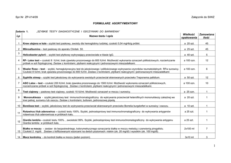 Spr.Nr ZP-I/14/09 Załącznik do SIWZ FORMULARZ ASORTYMENTOWY Zadanie 1. „SZYBKIE TESTY DIAGNOSTYCZNE I ODCZYNNIKI DO BARWIENIA” Lp Nazwa testu i opis Wielkość Zamawiana opakowania ilość 1 Krew utajona w kale - szybki test paskowy, swoisty dla hemoglobiny ludzkiej, czułość 0,04 mgHb/g próbki. a 20 szt. 45 2 Mikroalbumina – test paskowy do aparatu Clinitek 50. a 25 szt. 45 Helicobacter pylorii - szybki test płytkowy wykrywający przeciwciała w klasie IgG. a 40 szt. 5 4 RF- Latex test – czułość 8 IU/ml, brak zjawiska prozonowego do 800 IU/ml. Możliwość wykonania oznaczeń półilościowych, rozcieńczanie próbek w soli fizjologicznej. Zestaw z kontrolami, płytkami reakcyjnymi i jednorazowymi mieszadełkami. a 100 ozn. 12 5 Waaler Rose – test - szybki, hemaglutynacyjny test do jakościowego i półilościowego wykrywania czynników reumatoidalnych RFw surowicy. Czułość 8 IU/ml, brak zjawiska prozonowego do 800 IU/ml. Zestaw z kontrolami, płytkami reakcyjnymi i jednorazowymi mieszadełkami a 100 ozn. 6 6 Syphilis streep – szybki test jakościowy do wykrywania swoistych przeciwciał skierowanych przeciwko Treponema pallidium. a 50 szt. 12 7 ASO Latex – test – czułość 200 IU/ml, brak zjawiska prozonowego do 1500 IU/ml. Możliwość wykonania oznaczeń półilościowych, rozcieńczanie próbek w soli fizjologicznej. Zestaw z kontrolami, płytkami reakcyjnymi i jednorazowymi mieszadełkami. a 100 ozn. 10 Test ciążowy – paskowy test ciążowy, czułość 10 IU/ml. Możliwość oznaczeń w moczu i surowicy. a 25 ozn. 1 9 Mononukleoza - szybki,jakościowy test immunochromatograficzny do wykrywania przeciwciał heterofilnych mononukleozy zakaźnej we krwi pełnej, surowicu lub osoczu. Zestaw z kontrolami, buforem, jednorazową pipetą. a 20 szt. 1 10 Borelioza test – szybki, jakościowy test do wykrywania przeciwciał skierowanych przeciwko Borrelia burgdorferi w surowicy i osoczu. a 10 szt. 1 11 Rotawirus i/lub adenowirus – czułość testu 100%. Szybki, jednostopniowy test immunochromatograficzny do wykrywania antygenów rotawirusa i/lub adenowirusa w próbkach kału. a 25 szt. 1 12 Giardia lamblia - czułość testu 100%. , swoistość 99%. Szybki, jednostopniowy test immunochromatograficzny do wykrywania antygenu Giardia lamblia w próbkach kału. a 25 szt. 1 Białko w moczu – zestaw do bezpośredniego, kolorymetrycznego oznaczania białka w moczu metodą z czerwienią pirogallolu. Czułość 2 mg/dl. Zestaw z liofilizowanymi wzorcami na dwóch poziomach: niskim (ok. 20 mg/dl) i wysokim (ok. 100 mg/dl). 2x100 ml 7 13 14 Mocz kontrolny - do kontroli białka w moczu (jeden poziom). 3x10 ml 3 3 8 1 ODCZYNNIKI DO BARWIENIA 15 Odczynnik May-Grunwalda 1000 ml 9 16 Odczynnik Giemsy 1000 ml 15 17 Bufor do barwników 1000 ml 31 18 Płyn Lugola 100 ml 4 19 Sudan III 100 ml 1 20 Kwas octowy 100 ml 1 UWAGA: do każdego zestawu należy dołączyć instrukcję wykonania testu (w języku polskim). 2
