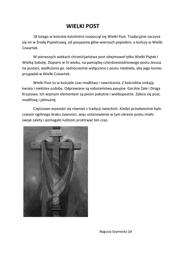 WIELKI POST 18 lutego w kościele katolickim rozpoczął się Wielki Post. Tradycyjnie zaczyna się on w Środę Popielcową, od posypania głów wiernych popiołem, a kooczy w Wielki Czwartek. W pierwszych wiekach chrześcijaostwa post obejmował tylko Wielki Piątek i Wielką Sobotę. Dopiero w IV wieku, na pamiątkę czterdziestodniowego postu Jezusa na pustyni, wydłużono go. Jednocześnie wyłączono z postu niedziele, aby jego koniec przypadał w Wielki Czwartek. Wielki Post to w kościele czas modlitwy i nawrócenia. Z kościołów znikają kwiaty i niektóre ozdoby. Odprawiane są nabożeostwa pasyjne: Gorzkie Żale i Droga Krzyżowa. Ich ważnym elementem są pieśni pokutne i wielkopostne. Zaleca się post, modlitwę i jałmużnę. Częściowo wywodzi się również z tradycji świeckich. Kiedyś przedwiośnie było czasem ogólnego braku żywności, więc ustanowienie w tym okresie postu miało swoje zalety i pomagało ludziom przetrwad ten czas. Bogusia Szymecka 2d