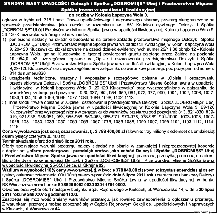 SYNDYK MASY UPADŁOŚCI Delczyk i Spółka „DOBROMIĘS” Ubój i Przetwórstwo Mięsne Spółka jawna w upadłości likwidacyjnej z siedzibą Kolonia Łapczyna Wola 9, ogłasza w trybie art. 316 i nast. Prawa upadłościowego i naprawczego pisemny przetarg nieograniczony na sprzedaż przedsiębiorstwa jako całości w rozumieniu art. 551 Kodeksu cywilnego Delczyk i Spółka „DOBROMIĘS” Ubój i Przetwórstwo Mięsne Spółka jawna w upadłości likwidacyjnej, Kolonia Łapczyna Wola 9, 29-120 Kluczewsko, w którego skład wchodzą: 1) poniesione nakłady na składniki budowlane na terenie zakładu przetwórstwa mięsnego Delczyk i Spółka „DOBROMIĘS” Ubój i Przetwórstwo Mięsne Spółka jawna w upadłości likwidacyjnej w Kolonii Łapczyna Wola 9, 29-120 Kluczewsko, zlokalizowane na części działek ewidencyjnych numer 29/1 i 30 obręb 12 – Kolonia Łapczyna Wola, gmina Kluczewsko o łącznej powierzchni gruntu zajętego przez Zakład na poziomie 10 054,0 m2, szczegółowo opisane w „Opisie i oszacowaniu przedsiębiorstwa Delczyk i Spółka „DOBROMIĘS” Ubój i Przetwórstwo Mięsne Spółka jawna w upadłości likwidacyjnej w Kolonii Łapczyna Wola 9, 29-120 Kluczewsko” oraz wyszczególnione w załączniku do warunków przetargu pod pozycjami od numeru 814 do numeru 820; 2) urządzenia techniczne, maszyny i wyposażenie szczegółowo opisane w „Opisie i oszacowaniu przedsiębiorstwa Delczyk i Spółka „DOBROMIĘS” Ubój i Przetwórstwo Mięsne Spółka jawna w upadłości likwidacyjnej w Kolonii Łapczyna Wola 9, 29-120 Kluczewsko” oraz wyszczególnione w załączniku do warunków przetargu pod pozycjami: 920, 937, 952, 954, 959, 964, 972, 977, 990, 1001, 1002, 1006, 1027-1030, 1034, 1058, 1059, 1066, 1077-1084, 1089, 1098, 1102, 1113; 3) inne środki trwałe opisane w „Opisie i oszacowaniu przedsiębiorstwa Delczyk i Spółka „DOBROMIĘS” Ubój i Przetwórstwo Mięsne Spółka jawna w upadłości likwidacyjnej w Kolonia Łapczyna Wola 9, 29-120 Kluczewsko” oraz wyszczególnione w załączniku do warunków przetargu pod pozycjami: 813, 821-830, 839-919, 921936, 938-951, 953, 955-958, 960-963, 965-971, 973-976, 978-989, 991-1000, 1003-1005, 1007-1026, 10311033, 1035-1057, 1060-1065, 1067-1076, 1085-1088, 1090-1097, 1099-1101, 1103-1112, 1114-1119. Cena wywoławcza jest ceną oszacowania, tj. 3 788 400,00 zł (słownie: trzy miliony siedemset osiemdziesiąt osiem tysięcy czterysta 00/100 zł). Termin składania ofert: do dnia 6 lipca 2011 roku. Oferty spełniające warunki przetargu należy składać na piśmie w zamkniętej i nieprzezroczystej kopercie z dopiskiem „oferta przetargowa – przedsiębiorstwo jako całość Delczyk i Spółka „DOBROMIĘS” Ubój i Przetwórstwo Mięsne Spółka jawna w upadłości likwidacyjnej” przesłaną przesyłką poleconą na adres: Biuro Syndyka masy upadłości Delczyk i Spółka „DOBROMIĘS” Ubój i Przetwórstwo Mięsne Spółka jawna w upadłości likwidacyjnej 25-650 Kielce, ul. Skrajna 82. Wadium w wysokości 10% ceny wywoławczej, tj. w kwocie 378 840,00 zł (słownie: trzysta siedemdziesiąt osiem tysięcy osiemset czterdzieści 00/100 zł) należy wpłacić do dnia 6 lipca 2011 roku na rachunek bankowy Delczyk i Spółka „DOBROMIĘS” Ubój i Przetwórstwo Mięsne Spółka jawna w upadłości likwidacyjnej w banku BS Włoszczowa nr rachunku: 89 8525 0002 0030 0301 1761 0002. Otwarcie oraz wybór ofert nastąpi w budynku Sądu Rejonowego w Kielcach, ul. Warszawska 44, w dniu 20 lipca 2011 roku w Sali XXV o godzinie 11.00. Zastrzega się możliwość zmiany warunków przetargu, jak również zawiadomienia o ogłoszeniu przetargu. Z warunkami przetargu można zapoznać się w Sądzie Rejonowym Sekcji ds. Upadłościowych i Naprawczych w Kielcach, ul. Warszawska 44.