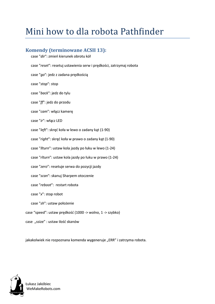 Mini how to dla robota Pathfinder Komendy (terminowane ACSII 13): case "dir": zmień kierunek obrotu kół case "reset": resetuj ustawienia serw i prędkości, zatrzymaj robota case "go": jedz z zadana prędkością case "stop": stop case "back": jedz do tylu case "ff": jedz do przodu case "cam": włącz kamerę case "ir": włącz LED case "left": skręć koła w lewo o zadany kąt (1-90) case "right": skręć koła w prawo o zadany kąt (1-90) case "llturn": ustaw kola jazdy po łuku w lewo (1-24) case "rlturn": ustaw kola jazdy po łuku w prawo (1-24) case "zero": resetuje serwa do pozycji jazdy case "scan": skanuj Sharpem otoczenie case "reboot": restart robota case "x": stop robot case "sh": ustaw położenie case “speed”: ustaw prędkość (1000 -> wolno, 1 -> szybko) case „ssize” : ustaw ilość skanów jakakolwiek nie rozpoznana komenda wygeneruje „ERR” i zatrzyma robota. Łukasz Jakóbiec WeMakeRobots.com Formaty odpowiedzi Odpowiedź na komendę „scan”: fdist|16|123|234|123|…|321| zakończone CRLF fdist – identyfikator pakietu 16 – ilość odczytów z pierwszego czujnika, w sumie 16 * 2 |123|244|…|239| - odczyty z Sharp’a w wartościach RAW, żeby przeliczyć należy zastosować wzór: Odpowiedź na komendę „sh”: Po komendzie „sh” należy wpisać pozycje Serwa czyli od ~30 do ~120 (wartości nie reprezentują kąta) sdist|432| sdist – identyfikator paketu 432 – wartość przetwornika ADC podłączonego do czujnika Sharp Odpowiedź na komendę „adcdump”: Komenda „adcdump” zwraca odczyty z przetwornika ADC tak długo dopóki nie wyślemy czegoś na port komunikacyjny. Odczytywane są 4 kanały ADC0…ADC3, dane zwracane są w formacie: ADC0:120 ADC1:299 ADC2:9 ADC3:999 Konwersja danych z czujnika odległości Dane odbierane z robota są reprezentacją wartości odczytanej z ADC. Wartości te nie są liniowe i nie odzwierciedlają realnej odległości. Aby przeliczyć taką wartość na CM należy zastosować wzór: cm = (6.18 * (odczyt_adc * odczyt_adc) * 0.0001) - (0.575 * odczyt_adc) + 155.5 Łukasz Jakóbiec WeMakeRobots.com Paramatry komunikacji: Prędkość : Bluetooth PIN: Nazwa Bluetooth: 115200,8,N,1 default sentinel lub basicBRA!NZ Rozpoczęcie komunikacji wymaga wpisania „init” +ASCII 13 poprawne rozpoczęcie komunikacji sygnalizuje pojawienie się: „Hello at basicBRA!NZ.” Jeżeli dostaniemy „ERR” oznacza to konieczność wysłania „reboot” + ASCII 13 i przejścia do wysyłania „init”. Dla komend posiadających parametr należy stosować format „komenda” ASCII 13 „parametr” ASCII 13 Łukasz Jakóbiec WeMakeRobots.com