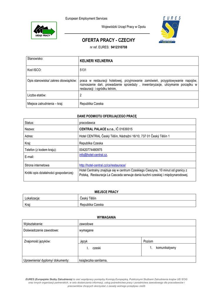 European Employment Services Wojewódzki Urząd Pracy w Opolu OFERTA PRACY - CZECHY nr ref. EURES: 9412310708 Stanowisko: Kod ISCO: KELNER/ KELNERKA 5131 Opis stanowiska/ zakres obowiązków: praca w restauracji hotelowej, przyjmowanie zamówień, przygotowywanie napojów, roznoszenie dań, prowadzenie sprzedaży , inwentaryzacje, utrzymanie porządku w restauracji i ogródku letnim, Liczba etatów: 2 Miejsce zatrudnienia – kraj: Republika Czeska DANE PODMIOTU OFERUJĄCEGO PRACĘ Status: pracodawca Nazwa: CENTRAL PALACE s.r.o., IČ 01639315 Adres: Hotel CENTRAL Český Těšín, Nádražní 16/10, 737 01 Český Těšín 1 Kraj: Republika Czeska Telefon (z kodem kraju): 00420774480975 [email protected], E-mail: Strona internetowa Krótki opis działalności gospodarczej: http://hotel-central.cz/cs/restaurace/ Hotel Centralny znajduje się w centrum Czeskiego Cieszyna, 10 minut od granicy z Polską. Restauracja La Cascada serwuje dania kuchni czeskiej i międzynarodowej. MIEJSCE PRACY Lokalizacja: Český Těšín Kraj: Republika Czeska WYMAGANIA Wykształcenie: zawodowe Doświadczenie zawodowe: wymagane Znajomość języków: Język 1. czeski Uprawnienia/ dyplomy/ dokumenty: Poziom 1. komunikatywny książeczka sanitarna, EURES (Europejskie Służby Zatrudnienia) to sieć współpracy pomiędzy Komisją Europejską, Publicznymi Służbami Zatrudnienia krajów UE/ EOG oraz innych organizacji partnerskich, w celu dostarczania informacji, usług pośrednictwa pracy i poradnictwa zawodowego dla pracodawców i pracowników chcących skorzystać z zasady wolnego przepływu osób Inne istotne wymagania: dyspozycyjność, mile widziana znajomość angielskiego lub niemieckiego WYNAGRODZENIE I WARUNKI ZATRUDNIENIA Wysokość pensji brutto: od 15 000 Wysokość pensji netto: http://www.vypocet.cz/cista-mzda Waluta, w jakiej wypłacana jest pensja: Korona czeska Rodzaj stawki wynagrodzenia: brutto Premie: Brak danych Dodatkowe świadczenia Zakwaterowanie: tak Wyżywienie: nie Podróż: nie Nazwa firmy, z którą zostanie podpisana umowa: CENTRAL PALACE s.r.o. Rodzaj umowy: umowa o pracę Wymiar czasu pracy pełen etat Czas trwania umowy: określony Liczba godzin tygodniowo: 40 Praca na zmiany: b.d. Data rozpoczęcia: Od zaraz SPOSÓB SKŁADANIA WNIOSKU Wymagane dokumenty: CV Język, w którym muszą być sporządzone przedkładane dokumenty: polski Do kogo należy wysłać dokumenty: pracodawca Gdzie należy wysłać dokumenty: Dane teleadresowe doradcy EURES lub przedstawiciela pracodawcy: [email protected] Anna Kabotová, +420774480975, [email protected] KOORDYNATOR Wojewódzki Urząd Pracy w Opolu WAŻNOŚĆ Data publikacji: 18.09.2015 Termin przedkładania podań o pracę / zakończenia ważności oferty: Do odwołania EURES (Europejskie Służby Zatrudnienia) to sieć współpracy pomiędzy Komisją Europejską, Publicznymi Służbami Zatrudnienia krajów UE/ EOG oraz innych organizacji partnerskich, w celu dostarczania informacji, usług pośrednictwa pracy i poradnictwa zawodowego dla pracodawców i pracowników chcących skorzystać z zasady wolnego przepływu osób Uprzejmie informujemy, że pracodawca skontaktuje się wyłącznie z wybranymi kandydatami. Urząd Pracy dokłada wszelkich starań, aby oferty pracy będące w zasobach urzędu, były rzetelne i wiarygodne. Ponieważ wszystkie oferty pracy pochodzą od osób trzecich Urząd Pracy zastrzega, że odpowiedzialność za ewentualne rozbieżności pomiędzy warunkami pracy zaprezentowanymi w niniejszej ofercie a warunkami zaproponowanymi przez potencjalnego pracodawcę ponosi pracodawca. Stosunek pracy z pracodawcą zagranicznym będzie zawarty w ramach prawa obowiązującego w kraju zatrudnienia. Oznacza to, że wszelkie roszczenie z tytułu nie wywiązywania się pracodawcy z warunków zawartych w umowie o pracę, dochodzić można wyłącznie w sądzie pracy w kraju zatrudnienia. W sytuacjach losowych pomoc polskich placówek konsularnych ogranicza się do ewentualnego udzielenia doraźnej pomocy (np. kredytu na zakup biletu powrotnego do Polski ). Na podstawie ustawy o ochronie danych osobowych z dnia 29 sierpnia 1997 r. (Dz. U. z 2014 r., poz.1182 ze zm.) informujemy, że administratorem danych osobowych wskazanych w dokumentach przekazanych w odpowiedzi na ofertę pracy jest pracodawca zagraniczny/ Wojewódzki Urząd Pracy w Opolu, ul. Głogowska 25C, 45-315 Opole Dane osobowe wskazane dobrowolnie w ww. dokumentach będą przetwarzane i udostępniane publicznym służbom zatrudnienia, pracodawcom lub podmiotom reprezentującym pracodawców do celów związanych z pośrednictwem pracy w ramach sieci EURES, na podstawie ustawy z dnia 20 kwietnia 2004 r. o promocji zatrudnienia i instytucjach rynku pracy (Dz. U. z 2015 r. , poz. 149 z póź. zm.) przez okres konieczny do osiągnięcia celu określonego w przedmiotowej ustawie. Osobie, której dane osobowe dotyczą przysługuje prawo dostępu do ich treści i prawo ich poprawiania. Więcej ofert pracy za granicą: www.eures.europa.eu www.eures.praca.gov.pl www.eures.wup.opole.pl EURES (Europejskie Służby Zatrudnienia) to sieć współpracy pomiędzy Komisją Europejską, Publicznymi Służbami Zatrudnienia krajów UE/ EOG oraz innych organizacji partnerskich, w celu dostarczania informacji, usług pośrednictwa pracy i poradnictwa zawodowego dla pracodawców i pracowników chcących skorzystać z zasady wolnego przepływu osób