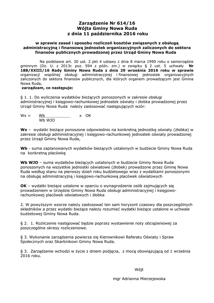 Zarządzenie Nr 614/16 Wójta Gminy Nowa Ruda z dnia 11 października 2016 roku w sprawie zasad i sposobu rozliczeń kosztów związanych z obsługą administracyjną i finansową jednostek organizacyjnych zaliczonych do sektora finansów publicznych prowadzonej przez Urząd Gminy Nowa Ruda Na podstawie art. 30 ust. 2 pkt 4 ustawy z dnia 8 marca 1990 roku o samorządzie gminnym (Dz. U. z 2013r. poz. 594 z późn. zm.) w związku § 2 ust. 5 uchwały Nr 188/XXIII/16 Rady Gminy Nowa Ruda z dnia 29 września 2016 roku w sprawie organizacji wspólnej obsługi administracyjnej i finansowej jednostek organizacyjnych zaliczonych do sektora finansów publicznych, dla których organem prowadzącym jest Gmina Nowa Ruda, zarządzam, co następuje: § 1. 1. Do wyliczenia wydatków bieżących ponoszonych w zakresie obsługi administracyjnej i księgowo-rachunkowej jednostek oświaty i żłobka prowadzonej przez Urząd Gminy Nowa Ruda należy zastosować następujących wzór: Wx = Wb Wb WJO x OK Wx – wydatki bieżące ponoszone odpowiednio na konkretną jednostkę oświaty (żłobka) w zakresie obsługi administracyjnej i księgowo-rachunkowej jednostek oświaty prowadzonej przez Urząd Gminy Nowa Ruda, Wb - suma zaplanowanych wydatków bieżących ustalonych w budżecie Gminy Nowa Ruda na konkretną placówkę Wb WJO – suma wydatków bieżących ustalonych w budżecie Gminy Nowa Ruda ponoszonych na wszystkie jednostki oświatowe (żłobek) prowadzone przez Gminę Nowa Ruda według stanu na pierwszy dzień roku budżetowego wraz z wydatkami ponoszonymi na obsługę administracyjną i księgowo-rachunkową placówek oświatowych OK – wydatki bieżące ustalone w oparciu o wynagrodzenie osób zajmujących się prowadzeniem w Urzędzie Gminy Nowa Ruda obsługi administracyjnej i księgoworachunkowej placówek oświatowych i żłobka 2. W powyższym wzorze należy zastosować ten sam horyzont czasowy dla poszczególnych składników a przez wydatki bieżące należy rozumieć wydatki bieżące ustalone w uchwale budżetowej Gminy Nowa Ruda. § 2. 1. Rozliczenie następować będzie poprzez wystawienie noty obciążeniowej za poszczególne okresy rozliczeniowe. § 3. Wykonanie zarządzenia powierza się Kierownikowi Referatu Oświaty i Spraw Społecznych oraz Skarbnikowi Gminy Nowa Ruda. § 3. Zarządzenie wchodzi w życie z dniem podjęcia, z mocą obowiązującą od 1 września 2016 roku. Wójt mgr Adrianna Mierzejewska