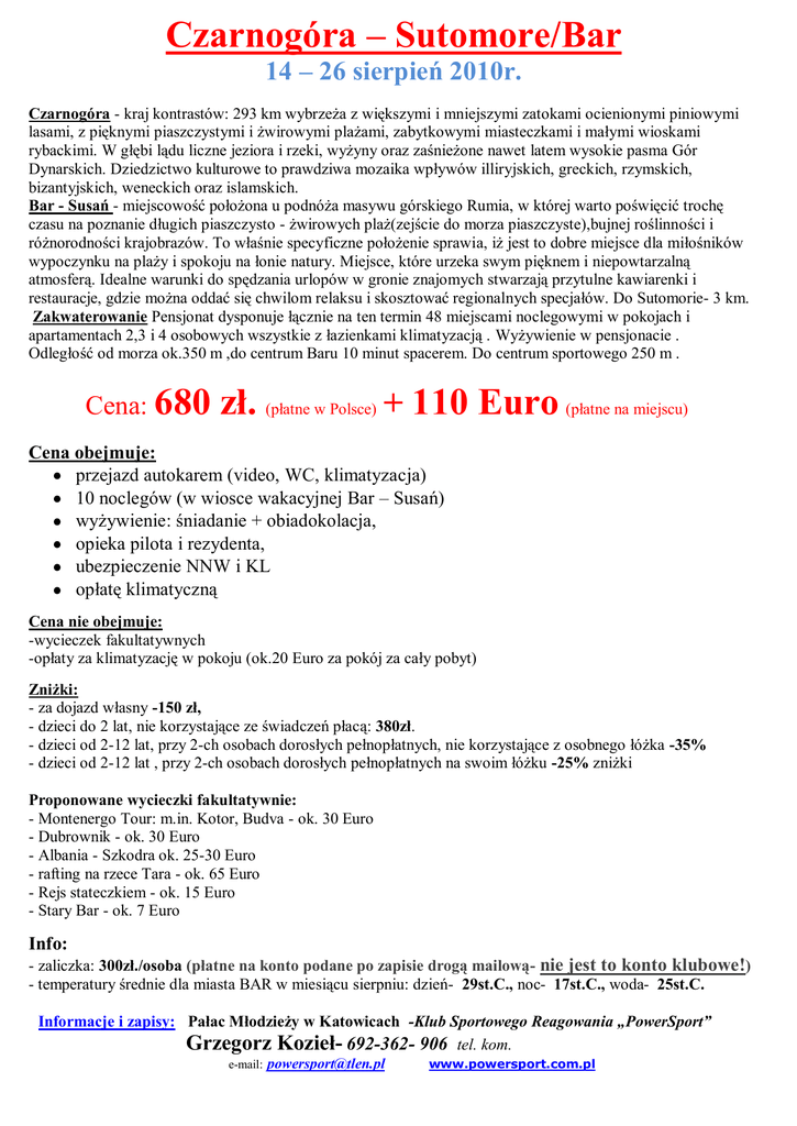 Czarnogóra – Sutomore/Bar 14 – 26 sierpień 2010r. Czarnogóra - kraj kontrastów: 293 km wybrzeża z większymi i mniejszymi zatokami ocienionymi piniowymi lasami, z pięknymi piaszczystymi i żwirowymi plażami, zabytkowymi miasteczkami i małymi wioskami rybackimi. W głębi lądu liczne jeziora i rzeki, wyżyny oraz zaśnieżone nawet latem wysokie pasma Gór Dynarskich. Dziedzictwo kulturowe to prawdziwa mozaika wpływów illiryjskich, greckich, rzymskich, bizantyjskich, weneckich oraz islamskich. Bar - Susań - miejscowość położona u podnóża masywu górskiego Rumia, w której warto poświęcić trochę czasu na poznanie długich piaszczysto - żwirowych plaż(zejście do morza piaszczyste),bujnej roślinności i różnorodności krajobrazów. To właśnie specyficzne położenie sprawia, iż jest to dobre miejsce dla miłośników wypoczynku na plaży i spokoju na łonie natury. Miejsce, które urzeka swym pięknem i niepowtarzalną atmosferą. Idealne warunki do spędzania urlopów w gronie znajomych stwarzają przytulne kawiarenki i restauracje, gdzie można oddać się chwilom relaksu i skosztować regionalnych specjałów. Do Sutomorie- 3 km. Zakwaterowanie Pensjonat dysponuje łącznie na ten termin 48 miejscami noclegowymi w pokojach i apartamentach 2,3 i 4 osobowych wszystkie z łazienkami klimatyzacją . Wyżywienie w pensjonacie . Odległość od morza ok.350 m ,do centrum Baru 10 minut spacerem. Do centrum sportowego 250 m . Cena: 680 zł. (płatne w Polsce) + 110 Euro (płatne na miejscu) Cena obejmuje: przejazd autokarem (video, WC, klimatyzacja) 10 noclegów (w wiosce wakacyjnej Bar – Susań) wyżywienie: śniadanie + obiadokolacja, opieka pilota i rezydenta, ubezpieczenie NNW i KL opłatę klimatyczną Cena nie obejmuje: -wycieczek fakultatywnych -opłaty za klimatyzację w pokoju (ok.20 Euro za pokój za cały pobyt) Zniżki: - za dojazd własny -150 zł, - dzieci do 2 lat, nie korzystające ze świadczeń płacą: 380zł. - dzieci od 2-12 lat, przy 2-ch osobach dorosłych pełnopłatnych, nie korzystające z osobnego łóżka -35% - dzieci od 2-12 lat , przy 2-ch osobach dorosłych pełnopłatnych na swoim łóżku -25% zniżki Proponowane wycieczki fakultatywnie: - Montenergo Tour: m.in. Kotor, Budva - ok. 30 Euro - Dubrownik - ok. 30 Euro - Albania - Szkodra ok. 25-30 Euro - rafting na rzece Tara - ok. 65 Euro - Rejs stateczkiem - ok. 15 Euro - Stary Bar - ok. 7 Euro Info: - zaliczka: 300zł./osoba (płatne na konto podane po zapisie drogą mailową- nie jest to konto klubowe!) - temperatury średnie dla miasta BAR w miesiącu sierpniu: dzień- 29st.C., noc- 17st.C., woda- 25st.C. Informacje i zapisy: Pałac Młodzieży w Katowicach -Klub Sportowego Reagowania „PowerSport” Grzegorz Kozieł- 692-362- 906 tel. kom. e-mail: [email protected] www.powersport.com.pl
