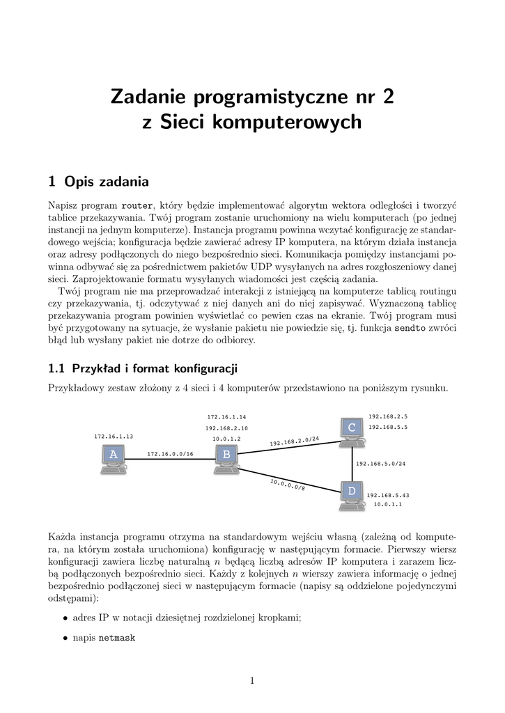 Zadanie programistyczne nr 2 z Sieci komputerowych 1 Opis zadania Napisz program router, który będzie implementować algorytm wektora odległości i tworzyć tablice przekazywania. Twój program zostanie uruchomiony na wielu komputerach (po jednej instancji na jednym komputerze). Instancja programu powinna wczytać konfigurację ze standardowego wejścia; konfiguracja będzie zawierać adresy IP komputera, na którym działa instancja oraz adresy podłączonych do niego bezpośrednio sieci. Komunikacja pomiędzy instancjami powinna odbywać się za pośrednictwem pakietów UDP wysyłanych na adres rozgłoszeniowy danej sieci. Zaprojektowanie formatu wysyłanych wiadomości jest częścią zadania. Twój program nie ma przeprowadzać interakcji z istniejącą na komputerze tablicą routingu czy przekazywania, tj. odczytywać z niej danych ani do niej zapisywać. Wyznaczoną tablicę przekazywania program powinien wyświetlać co pewien czas na ekranie. Twój program musi być przygotowany na sytuacje, że wysłanie pakietu nie powiedzie się, tj. funkcja sendto zwróci błąd lub wysłany pakiet nie dotrze do odbiorcy. 1.1 Przykład i format konfiguracji Przykładowy zestaw złożony z 4 sieci i 4 komputerów przedstawiono na poniższym rysunku. 192.168.2.5 172.16.1.14 C 192.168.2.10 172.16.1.13 A 10.0.1.2 172.16.0.0/16 192.168 192.168.5.5 .2.0/24 B 192.168.5.0/24 10.0 .0.0 /8 D 192.168.5.43 10.0.1.1 Każda instancja programu otrzyma na standardowym wejściu własną (zależną od komputera, na którym została uruchomiona) konfigurację w następującym formacie. Pierwszy wiersz konfiguracji zawiera liczbę naturalną n będącą liczbą adresów IP komputera i zarazem liczbą podłączonych bezpośrednio sieci. Każdy z kolejnych n wierszy zawiera informację o jednej bezpośrednio podłączonej sieci w następującym formacie (napisy są oddzielone pojedynczymi odstępami): • adres IP w notacji dziesiętnej rozdzielonej kropkami; • napis netmask 1 • maskę sieci w formacie /xx • napis distance • odległość do tej sieci (jest to odległość do każdego innego komputera w tej sieci). Możesz założyć, ze konfiguracja będzie w powyższym formacie i nie musisz tego sprawdzac. Przykładowo instancja programu uruchomiona na komputerze D na standardowym wejściu otrzyma konfigurację 2 10.0.1.1 netmask /8 distance 3 192.168.5.43 netmask /24 distance 2 1.2 Działanie programu Każda instancja programu router powinna implementować następujące cechy. 1. Co pewien zdefiniowany w programie czas (10-30 sekund, nazywany turą) powinna wysyłać cały swój aktualny wektor odległości (pary składające się z sieci i odległości do nich) na adresy rozgłoszeniowe wszystkich sąsiadujących z nią sieci. Dane powinny być wysyłane w jednym lub większej liczbie pakietów UDP. 2. Nasłuchiwać na ustalonym porcie i odbierać rozsyłane wektory odległości. 3. Utrzymywać bieżący wektor odległości i tablicę przekazywania, w której trasy obliczane są jako najkrótsze znane ścieżki do danych sieci. Tablica powinna być wyświetlana co turę na przykład w poniższym formacie: 10.0.0.0/8 unreachable 192.168.5.0/24 distance 2 connected directly 192.168.2.0/24 distance 4 via 192.168.5.5 172.16.0.0/16 distance 6 via 192.168.5.5 4. Reagować na nieosiągalność sąsiadów: (a) Błąd zwrócony przez funkcję sendto powinien skutkować wpisaniem do wektora odległości nieskończonej do sąsiadującej sieci. (b) Brak wiadomości przez kilka tur od komputera (znajdującego się w sąsiedniej sieci), który w tablicy przekazywania jest pierwszym komputerem na trasie do sieci A powinien skutkować wpisaniem w wektorze odległości do sieci A odległości nieskończonej. 5. Rozgłaszać wpisy wektora z odległościami nieskończonymi przez kilka kolejnych tur (w takim samym trybie jak inne wpisy), a następnie usuwać je z wektora odległości i tablicy przekazywania. 6. Reagować poprawnie jeśli osiągalność sąsiadującej bezpośrednio sieci lub sąsiedniego komputera zostanie przywrócona (np. jeśli otrzymamy wektor odległości od innego komputera z tej sieci). Twój program nie musi implementować dodatkowych rozszerzeń algorytmu wektora odległości takich jak przyspieszone uaktualnienia czy zatruwanie wsteczne. Twoja specyfikacja powinna natomiast definiować (niezbyt dużą) wartość graniczną, powyżej której odległość w sieci jest uznawana za nieskończoną, co umożliwi rozwiązywanie problemu zliczania do nieskończoności. 2 1.3 Specyfikacja komunikacji W osobnym pliku tekstowym spec.txt opisz szczegóły komunikacji. W szczególności powinna znaleźć się tam odpowiedź na następujące pytania: • Na jakim porcie nasłuchuje instancja programu router? • Jaki jest format przesyłanych wiadomości? Ile elementów wektora odległości może maksymalnie zmieścić się w pakiecie? • Jaka jest długość tury w sekundach? Po jakim czasie trasy zostają oznaczone jako nieosiągalne, a po jakim czasie nieosiągalne trasy będą wyrzucane z tablicy? • Jaką odległość uznajemy za nieskończoną? Uwaga: ten plik może być wspólny ale dla maksymalnie trzech osób (ich nazwiska powinny się pojawić w tym pliku). W takim przypadku testowanie powinno obejmować uruchamianie w jednej sieci programów różnych autorów. 2 Uwagi techniczne Pliki Swojemu ćwiczeniowcowi należy dostarczyć jeden spakowany plik zawierający katalog z programem. Katalog powinien zawierać: • Kod źródłowy w C lub C++, czyli pliki *.c i *.h lub pliki *.cpp i *.h. Każdy plik *.c i *.cpp na początku powinien zawierać w komentarzu imię, nazwisko i numer indeksu autora. • Plik Makefile pozwalający na kompilację programu po uruchomieniu make. • Plik spec.txt zawierający szczegółowy opis komunikacji. • Ewentualnie plik README. W katalogu tym nie powinno być żadnych innych plików, w szczególności skompilowanego programu, obiektów *.o, czy plików źródłowy