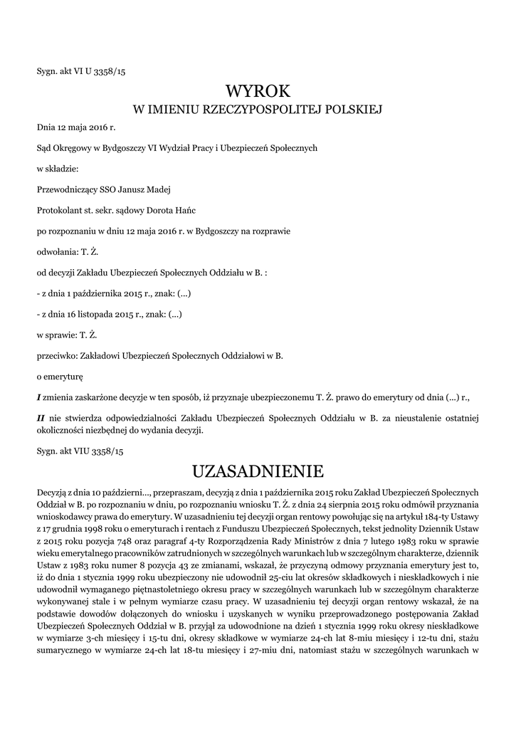Sygn. akt VI U 3358/15 WYROK W IMIENIU RZECZYPOSPOLITEJ POLSKIEJ Dnia 12 maja 2016 r. Sąd Okręgowy w Bydgoszczy VI Wydział Pracy i Ubezpieczeń Społecznych w składzie: Przewodniczący SSO Janusz Madej Protokolant st. sekr. sądowy Dorota Hańc po rozpoznaniu w dniu 12 maja 2016 r. w Bydgoszczy na rozprawie odwołania: T. Ż. od decyzji Zakładu Ubezpieczeń Społecznych Oddziału w B. : - z dnia 1 października 2015 r., znak: (...) - z dnia 16 listopada 2015 r., znak: (...) w sprawie: T. Ż. przeciwko: Zakładowi Ubezpieczeń Społecznych Oddziałowi w B. o emeryturę I zmienia zaskarżone decyzje w ten sposób, iż przyznaje ubezpieczonemu T. Ż. prawo do emerytury od dnia (...) r., II nie stwierdza odpowiedzialności Zakładu Ubezpieczeń Społecznych Oddziału w B. za nieustalenie ostatniej okoliczności niezbędnej do wydania decyzji. Sygn. akt VIU 3358/15 UZASADNIENIE Decyzją z dnia 10 październi..., przepraszam, decyzją z dnia 1 października 2015 roku Zakład Ubezpieczeń Społecznych Oddział w B. po rozpoznaniu w dniu, po rozpoznaniu wniosku T. Ż. z dnia 24 sierpnia 2015 roku odmówił przyznania wnioskodawcy prawa do emerytury. W uzasadnieniu tej decyzji organ rentowy powołując się na artykuł 184-ty Ustawy z 17 grudnia 1998 roku o emeryturach i rentach z Funduszu Ubezpieczeń Społecznych, tekst jednolity Dziennik Ustaw z 2015 roku pozycja 748 oraz paragraf 4-ty Rozporządzenia Rady Ministrów z dnia 7 lutego 1983 roku w sprawie wieku emerytalnego pracowników zatrudnionych w szczególnych warunkach lub w szczególnym charakterze, dziennik Ustaw z 1983 roku numer 8 pozycja 43 ze zmianami, wskazał, że przyczyną odmowy przyznania emerytury jest to, iż do dnia 1 stycznia 1999 roku ubezpieczony nie udowodnił 25-ciu lat okresów składkowych i nieskładkowych i nie udowodnił wymaganego piętnastoletniego okresu pracy w szczególnych warunkach lub w szczególnym charakterze wykonywanej stale i w pełnym wymiarze czasu pracy. W uzasadnieniu tej decyzji organ rentowy wskazał, że na podstawie dowodów dołączonych do wniosku i uzyskanych w wyniku przeprowadzonego postępowania Zakład Ubezpieczeń Społecznych Oddział w B. przyjął za udowodnione na dzień 1 stycznia 1999 roku okresy nieskładkowe w wymiarze 3-ch miesięcy i 15-tu dni, okresy składkowe w wymiarze 24-ch lat 8-miu miesięcy i 12-tu dni, stażu sumarycznego w wymiarze 24-ch lat 18-tu miesięcy i 27-miu dni, natomiast stażu w szczególnych warunkach w wymiarze 13 lat 6 miesięcy i 0 dni. Odwołanie od tej decyzji wniósł ubezpieczony domagając się jej zmiany i przyznania prawa do emerytury. W swoim odwołaniu ubezpieczony wskazywał, że nie zgadza się z decyzją, gdyż wbrew ustaleniom z..., organu rentowego na dzień 1 stycznia 1999 roku posiada on zarówno 15 lat pracy w szczególnych warunkach, jak i 25 lat stażu ogólnego. Powoływał się na swoje zatrudnienie w za..., od 1 lutego 1978 roku do 31 stycznia 1991 roku w Zakładzie Rolnym (...) na stanowisku traktorzysty, jak również na swoje zatrudnienie w (...) R. jak podawał ubezpieczony w okresie od 3 września 1973 roku do trzy..., jak również na swoje zatrudnienie w (...) w S. od 3 września 1973 roku do 30 stycznia 1978 roku, gdzie także pracował jako traktorzysta. W odpowiedzi na odwołanie organ rentowy wnosił o jego oddalenie powołując argumentację przedstawioną w uzasadnieniu zaskarżonej decyzji i wyjaśniając, że nie uwzględnił do pracy w szczególnych warunkach okresu zatrudnienia ubezpieczonego w (...) w S. od 3 września 1973 roku do 30 stycznia 1998 roku. Po wniesieniu odwołania organ rentowy Zakład Ubezpieczeń Społecznych Oddział w B. wydał jeszcze jedną decyzję z dnia 16 listopada 2015 roku także odmawiającą ubezpieczonemu prawa do emerytury z tą modyfikacją, iż jako jedyną przyczynę nieprzyznania ubezpieczonemu emerytury organ rentowy wskazał nieudowodnienie przez ubezpieczonego do dnia 1 stycznia 1999 roku co najmniej piętnastoletniego okresu pracy w szczególnych warunkach lub w szczególnym charakterze. Natomiast jeśli chodzi o staż sumaryczny wymagany do nabycia prawa do emerytury, to organ rentowy w tej decyzji ustalił, iż ubezpieczony spełnia wymóg legitymowania się co najmniej dwudziestopięcioletnim okresem składkowym i nieskładkowym wymaganym do emerytury. Dokładnie ustalił organ rentowy, iż ubezpieczony posiada 25 lat 1 miesiąc i 1 dzień tych okresów. Także od tej decyzji ubezpieczony wniósł odwołanie w odrębnej sprawie o sygnaturze akt VI U 3636/15, która to sprawa Zarządzeniem z dnia 13 stycznia 2016 roku została połączona do wspólnego rozpoznania i rozstrzygnięcia ze sprawą niniejszą. Sąd Okręgowy ustalił i rozważył co następuje. Ubezpieczony T. Ż. urodzony (...) w dniu 24 sierpnia 2015 roku złożył wniosek o przyznanie mu emerytury. We wniosku tym ubezpieczony podał, że nie jest członkiem Otwartego Funduszu Emerytalnego, a okoliczność ta w toku procesu nie była między stronami sporna. 60 lat ubezpieczony T. Ż. kończy, skończył (...)roku. Spór w niniejszej sprawie dotyczył tego, czy okres zatrudnienia ubezpieczonego w (...)w S. od 3 września 1973 roku do 30 stycznia 1978 roku może zostać zaliczony ubezpieczonemu do pracy w szczególnych warunkach. T. Ż. nie złożył bowiem świadectwa wykonywania pracy w szczególnych warunkach za ten okres albo świadectwa pracy, w którym wskazywanoby, że pracował w szczególnych warunkach. Na podstawie dowodów z zeznań świadków E. S., Z. P. oraz dowodu z przesłuchania ubezpieczonego, jak również dowodów z dokumentów zebranych w aktach osobowych ubezpieczonego, dotyczących okresu jego zatrudnienia w (...) w S. od 3 września 1973 do 30 stycznia 1978, Sąd Okręgowy ustalił, że ubezpieczony pracował jako kierowca ciągnika stale i w pełnym wymiarze czasu pracy w powyższym okresie w tej spółdzielni. Wykonywał on prace polowe, prace związane z rozwożeniem nawozów, j