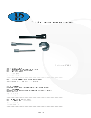 ZUP HP s.c. - Bytom, Telefon: +48 32 280 43 66 Nr katalogowy: 907 180 00 Silniki Silniki Silniki Silniki 2.5 2.5 2.8 2.8 D o kodach: 8144.76 TD o kodach 8140.27 ; 8140.47R ; 8144.21 ; 8144.97Y D oraz 2.8 TD o kodach 8140.43 ; 8140.63 JTD o kodach 8140.43S Fiat Croma ( 1993-1997 ) Fiat Ducato (1987-2006 ) ====================================================================== Silniki 2.8 D ; 2.8 TDi ; 2.8 HDi o kodach: 8140.63 ; 9140.43 ; 8140.43s CITROEN / PEUGEOT - Jumper ( 2001-2002 ) ; Boxer ( 2000-2006 ) ====================================================================== Silniki 2.5 D oraz 2.5 DT Kody silników: 8140.07 ; 8140.27S ; 8140.47R ; 8140.97 ; 8140.2 ; 8140.47 ; 8140.67F Silniki 2.8 D oraz 2.8 JTD Kody silników: 8140.23 ; 8140.43N ; 8140.63 ; 8140.43B ; 8140.43R ; 8140.23.27 ; 8140.43C 8140.43S ; 8140.43.37 IVECO Daily ( 1987-2006 ) IVECO Turbo Daily( 1987-2006 ) ====================================================================== Silniki 2.5D - S8U 770 / 772 - z paskiem rozrzadu Silniki 2.8 D - S9W 700 / 702 - z paskiem rozrzadu OPEL Arena ( 1997-2001 ) OPEL Movano ( 1998-2003 ) ====================================================================== Strona 1 z 2 Silniki Silniki Silniki Silniki 2.5 2.5 2.8 2.8 D - S8U 720 / 722 / 730 / 731 / 742 / 748 / 750 / 752 / 770 / 772 / 780 / 782 D Turbo - S9U 700 / 702 / 704 / 714 / 740 dTi - S9W 700 / 702 dCi - S9W 206/ 208 / 212 RENAULT Trafi c ( 1988-2000 ) RENAULT Master ( 1980-2008 ) RENAULT Mascot ( 1998-2007 ) Strona 2 z 2