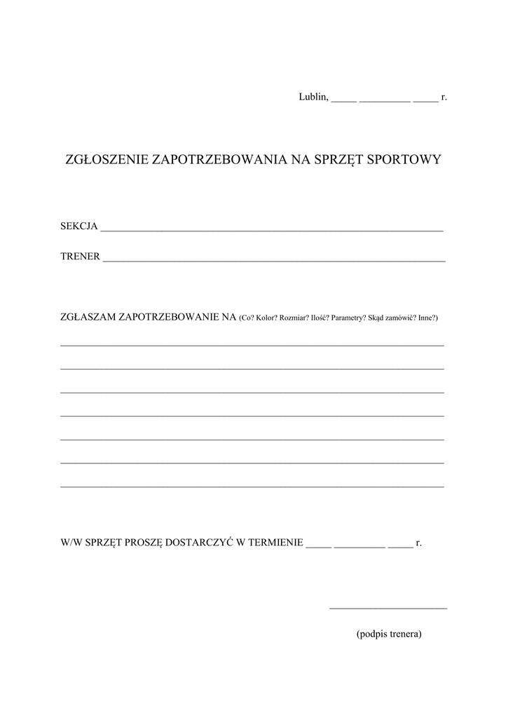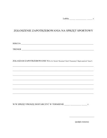 Lublin, _____ __________ _____ r. ZGŁOSZENIE ZAPOTRZEBOWANIA NA SPRZĘT SPORTOWY SEKCJA ___________________________________________________________________ TRENER ___________________________________________________________________ ZGŁASZAM ZAPOTRZEBOWANIE NA (Co? Kolor? Rozmiar? Ilość? Parametry? Skąd zamówić? Inne?) ___________________________________________________________________________ ___________________________________________________________________________ ___________________________________________________________________________ ___________________________________________________________________________ ___________________________________________________________________________ ___________________________________________________________________________ ___________________________________________________________________________ W/W SPRZĘT PROSZĘ DOSTARCZYĆ W TERMIENIE _____ __________ _____ r. _______________________ (podpis trenera)