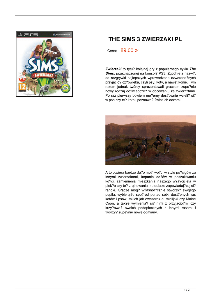 THE SIMS 3 ZWIERZAKI PL Cena: 89.00 zł Zwierzaki to tytu? kolejnej gry z popularnego cyklu The Sims, przeznaczonej na konsol? PS3. Zgodnie z nazw?, do rozgrywki najlepszych wprowadzono czworono?nych przyjació? cz?owieka, czyli psy, koty, a nawet konie. Tym razem jednak twórcy sprezentowali graczom zupe?nie nowy rodzaj do?wiadcze? w obcowaniu ze zwierz?tami. Po raz pierwszy bowiem mo?emy dos?ownie wcieli? si? w psa czy te? kota i poznawa? ?wiat ich oczami. A to otwiera bardzo du?o mo?liwo?ci w stylu po?cigów za innymi zwierzakami, kopania do?ów w poszukiwaniu ko?ci, zamienienia mieszkania naszego w?a?ciciela w piek?o czy te? zrujnowania mu dobrze zapowiadaj?cej si? randki. Gracze mog? w?asnor?cznie stworzy? swojego pupila, wybieraj?c spo?ród ponad setki dost?pnych ras kotów i psów, takich jak owczarek australijski czy Maine Coon, a tak?e wymienia? si? nimi z przyjació?mi czy krzy?owa? swoich podopiecznych z innymi rasami i tworzy? zupe?nie nowe odmiany. 1/2 W grze pojawi?y si? nowe lokacje bezpo?rednio zwi?zane ze zwierz?tami, m.in. psie parki, „kocie d?ungle” czy rancza, gdzie mo?na opiekowa? si? ko?mi. Nasz Sim jest w stanie nauczy? swojego zwierzaka ró?nych przydatnych umiej?tno?ci w rodzaju polowa? czy znajdowania ró?nych przedmiotów (psy) b?d? te? wy?cigów i skoków przez przeszkody (konie). Oczywi?cie pod warunkiem, i? nie trafili?my na znerwicowany b?d? te? ma?o inteligentny egzemplarz, bo i tak mo?e si? zdarzy?. Wszystko zale?y od naszego post?powania ze zwierzakiem i jego poprawnego wychowania. Zobacz wideo: Szczegóły wersja językowa POLSKA 2/2 Powered by TCPDF (www.tcpdf.org)