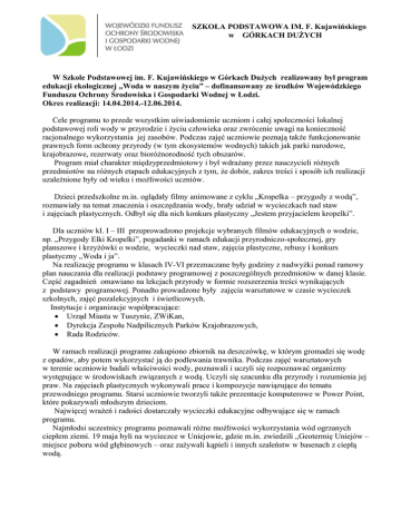 SZKOŁA PODSTAWOWA IM. F. Kujawińskiego w GÓRKACH DUŻYCH W Szkole Podstawowej im. F. Kujawińskiego w Górkach Dużych realizowany był program edukacji ekologicznej „Woda w naszym życiu” – dofinansowany ze środków Wojewódzkiego Funduszu Ochrony Środowiska i Gospodarki Wodnej w Łodzi. Okres realizacji: 14.04.2014.-12.06.2014. Cele programu to przede wszystkim uświadomienie uczniom i całej społeczności lokalnej podstawowej roli wody w przyrodzie i życiu człowieka oraz zwrócenie uwagi na konieczność racjonalnego wykorzystania jej zasobów. Podczas zajęć uczniowie poznają także funkcjonowanie prawnych form ochrony przyrody (w tym ekosystemów wodnych) takich jak parki narodowe, krajobrazowe, rezerwaty oraz bioróżnorodność tych obszarów. Program miał charakter międzyprzedmiotowy i był wdrażany przez nauczycieli różnych przedmiotów na różnych etapach edukacyjnych z tym, że dobór, zakres treści i sposób ich realizacji uzależnione były od wieku i możliwości uczniów. Dzieci przedszkolne m.in. oglądały filmy animowane z cyklu „Kropelka – przygody z wodą”, rozmawiały na temat znaczenia i oszczędzania wody, brały udział w wycieczkach nad staw i zajęciach plastycznych. Odbył się dla nich konkurs plastyczny „Jestem przyjacielem kropelki”. Dla uczniów kl. I – III przeprowadzono projekcje wybranych filmów edukacyjnych o wodzie, np. „Przygody Elki Kropelki”, pogadanki w ramach edukacji przyrodniczo-społecznej, gry planszowe i krzyżówki o wodzie, wycieczki nad staw, zajęcia plastyczne, rebusy i konkurs plastyczny „Woda i ja”. Na realizację programu w klasach IV-VI przeznaczane były godziny z nadwyżki ponad ramowy plan nauczania dla realizacji podstawy programowej z poszczególnych przedmiotów w danej klasie. Część zagadnień omawiano na lekcjach przyrody w formie rozszerzenia treści wynikających z podstawy programowej. Ponadto prowadzone były zajęcia warsztatowe w czasie wycieczek szkolnych, zajęć pozalekcyjnych i świetlicowych. Instytucje i organizacje współpracujące: Urząd Miasta w Tuszynie, ZWiKan, Dyrekcja Zespołu Nadpilicznych Parków Krajobrazowych, Rada Rodziców. W ramach realizacji programu zakupiono zbiornik na deszczówkę, w którym gromadzi się wodę z opadów, aby potem wykorzystać ją do podlewania trawnika. Podczas zajęć warsztatowych w terenie uczniowie badali właściwości wody, poznawali i uczyli się rozpoznawać organizmy występujące w środowiskach związanych z wodą. Uczyli się szacunku dla przyrody i rozumienia jej praw. Na zajęciach plastycznych wykonywali prace i kompozycje nawiązujące do tematu przewodniego programu. Starsi uczniowie tworzyli także prezentacje komputerowe w Power Point, które pokazywali młodszym dzieciom. Najwięcej wrażeń i radości dostarczały wycieczki edukacyjne odbywające się w ramach programu. Najmłodsi uczestnicy programu poznawali różne możliwości wykorzystania wód ogrzanych ciepłem ziemi. 19 maja byli na wycieczce w Uniejowie, gdzie m.in. zwiedzili „Geotermię Uniejów – miejsce poboru wód głębinowych – oraz zażywali kąpieli i innych szaleństw w basenach z ciepłą wodą. SZKOŁA PODSTAWOWA IM. F. Kujawińskiego w GÓRKACH DUŻYCH 21 maja uczniowie kl. IV-VI szukali źródeł Wolbórki w Rezerwacie „Wolbórka”, zapoznali się z tajnikami działania oczyszczalni ścieków i dowiedzieli się, skąd się bierze woda w kranie zobaczyli, jak działają studnie głębinowe czerpiące wodę dla gminnych wodociągów. Kolejna wycieczka odbyła się 27 maja. Tym razem zwracano uwagę na znaczenie rzek w przyrodzie i w życiu człowieka. Byliśmy m.in. na tamie w Smardzewicach, skąd roztacza się widok na Zalew Sulejowski i Pilicę, odwiedziliśmy zbója Madeja w grotach nagórzyckich. Potem zajęcia nt. odnawialnych źródeł energii w Skansenie Rzeki Pilicy i szukanie źródeł krasowych w rezerwacie Niebieskie Źródła. Następnie Spała, w której „wszystko zaczęło się od wody”, bo początkiem dzisiejszego kurortu był młyn wodny Bartosza Spały. W towarzystwie dyrektora Zespołu Nadpilicznych Parków Krajobrazowych, który zgodził się być naszym przewodnikiem, poznawaliśmy uroki Rezerwatu Gać i różnorodność roślin na ścieżce dydaktycznej w zaroślach łęgowych nad Pilicą. O strategicznej roli rzeki uczestnicy wycieczki mogli się przekonać, oglądając m.in. kościół św. Idziego i zamek w Inowłodzu oraz położenie zabudowań opactwa cystersów w Sulejowie-Podklasztorzu. W dn. 9-10 czerwca uczniowie kl. IV-VI wzięli udział w wycieczce do Biebrzańskiego i Narwiańskiego Parku Narodowego. Oprócz zwiedzania parków dzieci uczestniczyły w zajęciach edukacyjnych i warsztatach nt. bioróżnorodności bagien oraz wód Narwi i Biebrzy. Zwiedzaliśmy także Białystok i obiekty na św. Górze Grabarka. Na zakończenie programu odbyły się konkursy podsumowujące całość przeprowadzonych działań. Były wspaniałe nagrody – oczywiście związane z wodą!!! Koszt całkowity zadania wynosił 15 429,00zł z czego dotacja NFOŚiGW w Łodzi 13 680,00zł.