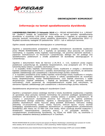 OBOWIĄZKOWY KOMUNIKAT Informacja na temat opodatkowania dywidendy LUKSEMBURG/ZNOJMO (3 listopada 2010 r.) – PEGAS NONWOVENS S.A. („PEGAS” lub „Spółka”) podaje do wiadomości informacje na temat sposobu opodatkowania dywidendy w wysokości 0,95 EUR na akcję, wypłacanej z kapitału ze sprzedaży akcji powyżej wartości nominalnej (dzień ustalenia uprawnienia: 22 października 2010 r.). Wypłata dywidendy nastąpiła 29 października 2010 r. lub w zbliżonym terminie. Ogólne zasady opodatkowania obowiązujace w Luksemburgu Zgodnie z luksemburskimi przepisami o podatku dochodowym dywidenda wypłacona przez PEGAS NONWOVENS S.A. z kapitału ze sprzedaży akcji powyżej ich wartości nominalnej, w wypadku braku kapitału rezerwowego, nie powinna stanowić dochodu z papierów wartościowych na terytorium Luksemburga; dlatego też nie podlega ona opodatkowaniu pobieranym u źródła podatkiem od dywidendy obowiązującym w Luksemburgu. Zgodnie z dokumentem Note de Service L.I.R./N.S. n. 113, wydanym przez organy podatkowe Luksemburga ds. podatków bezpośrednich, oraz przepisami art. 97 § 3(b) luksemburskiej Ustawy o podatku dochodowym: 1. w wypadku braku kapitału rezerwowego kwoty wypłacane w związku z obniżeniem kapitału zakładowego są zwolnione z podatku dochodowego pod warunkiem, że obniżenie kapitału zakładowego jest uzasadnione z ekonomicznego punktu widzenia; 2. w wypadku posiadania przez spółkę kapitału rezerwowego kwoty wypłacane w związku z obniżeniem kapitału zakładowego są zawsze w całości opodatkowane do wysokości kwoty skapitalizowanej; kwota nieskapitalizowana, czyli kapitał utworzony z wpłat akcjonariuszy (kapitał zakładowy i kapitał ze sprzedaży akcji powyżej wartości nominalnej), może uprawniać do nieopodatkowanych wypłat pod warunkiem, że obniżenie kapitału zakładowego jest uzasadnione z ekonomicznego punktu widzenia. Opodatkowanie akcjonariuszy będących rezydentami Czech Zgodnie z przepisami prawa czeskiego dochód z tytułu dywidendy wypłacanej z kapitału ze sprzedaży akcji powyżej wartości nominalnej nie powinien podlegać opodatkowaniu podatkiem od dywidendy w rozumieniu czeskiej Ustawy o podatku dochodowym. W związku z powyższym dywidenda powinna być wliczana do ogólnej podstawy opodatkowania danego podatnika. Zgodnie z obowiązującymi przepisami prawa o podatku dochodowym osoby fizyczne płacą podatek dochodowy naliczany według jednolitej 15-procentowej stawki. Osoby fizyczne, których łączny roczny dochód podlegający opodatkowaniu podatkiem dochodowym (z uwzględnieniem przedmiotowej dywidendy) jest niższy niż 15 000 CZK i/lub osoby, które uzyskują dochód wyłącznie z działalności niesamodzielnej (stosunku pracy), a ich pozostałe dochody, z uwzględnieniem przedmiotowej dywidendy, są niższe niż 6000 CZK, są zwolnione z obowiązku składania deklaracji podatkowych w Czechach. 1 PEGAS NONWOVENS SA (société anonyme) jest wpisana do Rejestru Handlowego Luksemburga pod numerem B 112.044. Adres siedziby: 68-70, boulevard de la Pétrusse, L-2320 Luksemburg, Wielkie Księstwo Luksemburga a Spółka zarejestrowana przez luksemburską Komisję Nadzoru Sektora Finansowego (CSSF) pod numerem E-0043. Osoby prawne podlegają opodatkowaniu podatkiem dochodowym od osób prawnych, naliczanym według stawki 19% od podstawy opodatkowania (zysku) (z uwzględnieniem przedmiotowej dywidendy), chyba że Czeskie Standardy Rachunkowości pozwalają uznać wypłatę dywidendy z kapitału ze sprzedaży akcji powyżej wartości nominalnej jako zmniejszenie wartości inwestycji. Opodatkowanie akcjonariuszy będących rezydentami Polski Jeżeli zgodnie z polskimi przepisami prawa przedmiotowy dochód stanowi wypłatę z kapitału ze sprzedaży akcji powyżej wartości nominalnej, wówczas taka wypłata otrzymywana przez polskich akcjonariuszy powinna być – dla celów polskiej Ustawy o podatku dochodowym od osób prawnych i polskiej Ustawy o podatku dochodowym od osób fizycznych – klasyfikowana jako „przychody z tytułu udziału w zysku“ zagranicznych osób prawnych i podlegać opodatkowaniu: • • zryczałtowanym 19-procentowym podatkiem dochodowym od osób prawnych (bez możliwości odliczenia kosztów uzyskania przychodu), z wyjątkiem sytuacji, gdzie ma zastosowanie zwolnienie podatkowe dotyczące udziału w kapitale (akcjonariusz powinien m.in. posiadać bezpośrednio co najmniej 10% akcji Spółki); zryczałtowanym 19-procentowym podatkiem dochodowym od osób fizycznych (bez możliwości odliczenia kosztów uzyskania przychodu). Spółka nie powinna podlegać obowiązkowi pobierania u źródła podatku dochodowego od osób prawnych lub podatku dochodowego od osób fizycznych z tytułu dywidendy wypłacanej ze środków uzyskanych z emisji akcji powyżej ich wartości nominalnej. Powyższy opis sposobu opodatkowania dywidendy zgodnie z luksemburskim, czeskim i polskim prawem podatkowym ma jedynie ogólny charakter. Inwestorzy mający wątpliwości co do swojego statusu podatkowego na terytorium Luksemburga i/lub kraju rezydencji podatkowej, lub poszukujący określonej porady prawnej, powinni skorzystać z usług swoich profesjonalnych doradców. Informacje przekazane w niniejszym komunikacie opracowano na podstawie przepisów prawa i przepisów wykonawczych obowiązujących na dzień jego publikacji. Spółka nie ponosi odpowiedzialności za jakiekolwiek zmiany przepisów prawa, które mogą zostać wprowadzone po dacie publikacji niniejszego komunikatu. Informacje zawarte w niniejszym komunikacie nie są wiążące dla organów podatkowych w Luksemburgu, Czechach i Polsce. Tym samym nie można mieć pewności, że organy te nie zajmą stanowiska odmiennego od przedstawionego w komunikacie. Omówione powyżej zasady opodatkowania zostały opracowane na podstawie opinii doradcy podatkowego PEGAS NONWOVENS S.A. i nie zostały zweryfikowane przez organy podatkowe poszczególnych krajów. 2 PEGAS N