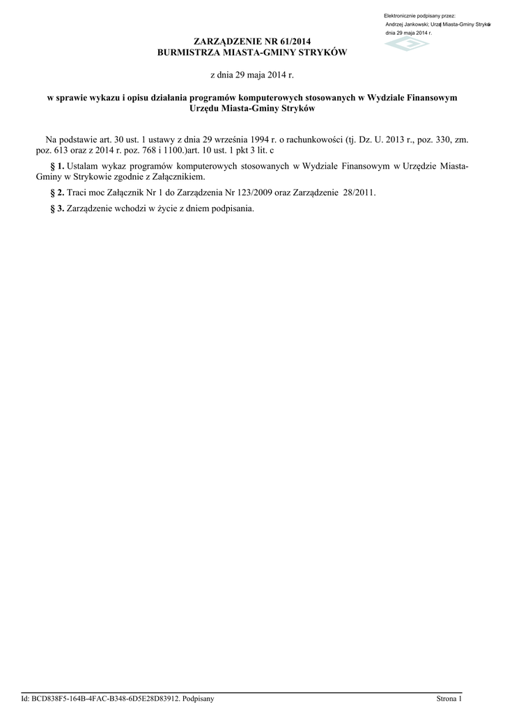 Elektronicznie podpisany przez: Andrzej Jankowski; Urząd Miasta-Gminy Stryków dnia 29 maja 2014 r. ZARZĄDZENIE NR 61/2014 BURMISTRZA MIASTA-GMINY STRYKÓW z dnia 29 maja 2014 r. w sprawie wykazu i opisu działania programów komputerowych stosowanych w Wydziale Finansowym Urzędu Miasta-Gminy Stryków Na podstawie art. 30 ust. 1 ustawy z dnia 29 września 1994 r. o rachunkowości (tj. Dz. U. 2013 r., poz. 330, zm. poz. 613 oraz z 2014 r. poz. 768 i 1100.)art. 10 ust. 1 pkt 3 lit. c § 1. Ustalam wykaz programów komputerowych stosowanych w Wydziale Finansowym w Urzędzie MiastaGminy w Strykowie zgodnie z Załącznikiem. § 2. Traci moc Załącznik Nr 1 do Zarządzenia Nr 123/2009 oraz Zarządzenie 28/2011. § 3. Zarządzenie wchodzi w życie z dniem podpisania. Id: BCD838F5-164B-4FAC-B348-6D5E28D83912. Podpisany Strona 1 Załącznik do Zarządzenia Nr 61/2014 Burmistrza Miasta-Gminy Stryków z dnia 29 maja 2014 r. Wykaz i opis działania programów komputerowych stosowanych przez Wydział Finansowy LP 1 2 3 4 5 6 7 8 Nazwa Programu System Kadry i Płace UPK System Księgowość Zobowiązań System Podatki (+JGU) System Kasa System Auta System Budżet System Opłaty Lokalne Producent Wersja U.I.INFO-SYSTEM Roman i Tadeusz Groszek sp.j. 2014.2.22.8.929 Data rozpoczęcia eksploatacji. 03.01.2006 r. 2014.1.1.3.616 24.07.2013 r. 2014.4.11.1023.111 3 03.01.2006 r. 2014.0.0.1.17 03.01.2006 r. 2014.1.3.429.429 03.01.2006 r. 2014.1.4.1.1117 03.01.2006 r. 2014.14.1029.14.10. 29 15.02.2006 r. 2014.1.4.0.20 30.05.2014 ul. Marsz. Józefa Piłsudskiego 31 lok.240 05-120 Legionowo U.I.INFO-SYSTEM Roman i Tadeusz Groszek sp.j. ul. Marsz. Józefa Piłsudskiego 31 lok.240 05-120 Legionowo U.I.INFO-SYSTEM Roman i Tadeusz Groszek sp.j. ul. Marsz. Józefa Piłsudskiego 31 lok.240 05-120 Legionowo U.I.INFO-SYSTEM Roman i Tadeusz Groszek sp.j. ul. Marsz. Józefa Piłsudskiego 31 lok.240 05-120 Legionowo U.I.INFO-SYSTEM Roman i Tadeusz Groszek sp.j. ul. Marsz. Józefa Piłsudskiego 31 lok.240 05-120 Legionowo U.I.INFO-SYSTEM Roman i Tadeusz Groszek sp.j. ul. Marsz. Józefa Piłsudskiego 31 lok.240 05-120 Legionowo U.I.INFO-SYSTEM Roman i Tadeusz Groszek sp.j. ul. Marsz. Józefa Piłsudskiego 31 lok.240 05-120 Legionowo U.I.INFO-SYSTEM Roman i Tadeusz Groszek sp.j. ul. Marsz. Józefa Piłsudskiego 31 lok.240 05-120 Legionowo Id: BCD838F5-164B-4FAC-B348-6D5E28D83912. Podpisany Strona 1 Program Budżet Pro 9 Sputnik Software Sp. z o.o. 4.0 23.06.2003 r. 2.6.800 23.06.2003 r. 10.0.1 02.01.2005 r. 9.0.15 01.10.2008 r. 9.01.001 A 01.01.2000 r. 3.02.016.06 01.05.2006 r. 1.2.2 01.08.2003 r. ul. Górecka 30, 60-201 Poznań 10 Program Środki Trwałe Sputnik Software Sp. z o.o. ul. Górecka 30, 60-201 Poznań 11 Program Świadczenia Rodzinne Top-Team TT Sp. z o.o. ul. Owczarska 7, 01-351 Warszawa 12 Program „Fundusz Alimentacyjny” Top-Team TT Sp. z o.o. ul. Owczarska 7, 01-351 Warszawa 13 Program Płatnik Asseco Poland S.A. ul. Olchowa 14 35-322 Rzeszów 14 Program Besti@ Sputnik Software Sp. z o.o. ul. Górecka 30, 60-201 Poznań 15 Program e-PFRON2 Państwowy Fundusz Rehabilitacji Osób Niepełnosprawnych Al. Jana Pawła II 13, 00-828 Warszawa 1) System kadrowo – płacowy „Kadry i Płace” umożliwia prowadzenie rozbudowanej kartoteki pracowników, zawierającej szczegółowy i rozbudowany zestaw danych. Dane kadrowe, oprócz podstawowych danych osobowych zawierają m.in. informacje o historii zatrudnienia, ewidencję czasu pracy, dane o urlopach i zwolnieniach, badaniach lekarskich, klasyfikacji dochodów, itd. Przechowywane są też specyficzne informacje, ułatwiające obsługę wynagrodzeń dla oświaty. Kartoteka płacowa obejmuje szczegółowo konfigurowalne składniki płacowe, a każdy pracownik posiada ich dowolną liczbę. W każdym miesiącu można przygotować dowolną liczbę list płac, a każda z nich może obejmować różne składniki. Specjalne funkcje ułatwiają przeglądanie danych kadrowych i płacowych, gwarantując szybki i wygodny dostęp do potrzebnej informacji. Program zapewnia przygotowanie szerokiej dokumentacji kadrowo – płacowej, m.in.: a) listy obecności, b) ewidencja czasu pracy, c) zestawienia GUS, d) zestawienia sprawozdawcze dla oświaty, e) zestawienia dodatków stażowych i jubileuszowych, Id: BCD838F5-164B-4FAC-B348-6D5E28D83912. Podpisany Strona 2 f) listy płac, g) zestawienia zbiorcze, h) wykazy zasiłków i potrąceń, i) karty płacowe i zasiłkowe, j) zbiorcze i imienne wykazy składników płacowych, k) paski wypłat i RMUA, l) eksport danych do Programu Płatnika, m) przygotowanie deklaracji podatkowych. PODSTAWOWE FUNKCJE: a) specjalne kalkulatory do obliczania zasiłku chorobowego, godzin nadliczbowych i średnich feryjnych dla nauczycieli, ryczałtów i stypendiów, kalkulator do obliczania średnich wynagrodzeń, b) funkcje szybkiego, uproszczonego wprowadzania składników płacowych dla grup pracowników, m.in. „trzynastki”, c) naliczanie korekt zaksięgowanych list płac, d) podgląd wyliczenia wynagrodzenia bez naliczania listy płac, e) elastyczne przygotowywanie przelewów z wynagrodzeniem do systemów bankowości elektronicznej, f) szerokie możliwości konfiguracyjnych umożliwiające dostosowywanie specyficznych potrzeb (m.in. dowolnych składników płacowych i list płac), programu do własnych g) specjalne zestawienia kadrowo – płacowe dla oświaty, h) mnogość zestawień kadrowych indywidualnych potrzeb, i płacowych uzupełniony dodatkowo o generator zestawień wg i) przydzielanie uprawnień użytkownikom na dostęp do wszystkich bądź wybranych funkcji systemu j) dziennik zdarzeń rejestrujący wszystkie wykonane w systemie prace, k) możliwości współpracy z systemem księgowym – przygotowanie szczegółowego raportu płacowego wg kont i klasyfikacji, l) wyszukiwanie danych wg specyficznych cech i kryteriów, m) szybki dostęp do informacji archiwalnej z lat poprzednich. 2) Uniwersalny Program Księgujący jest narzędziem 