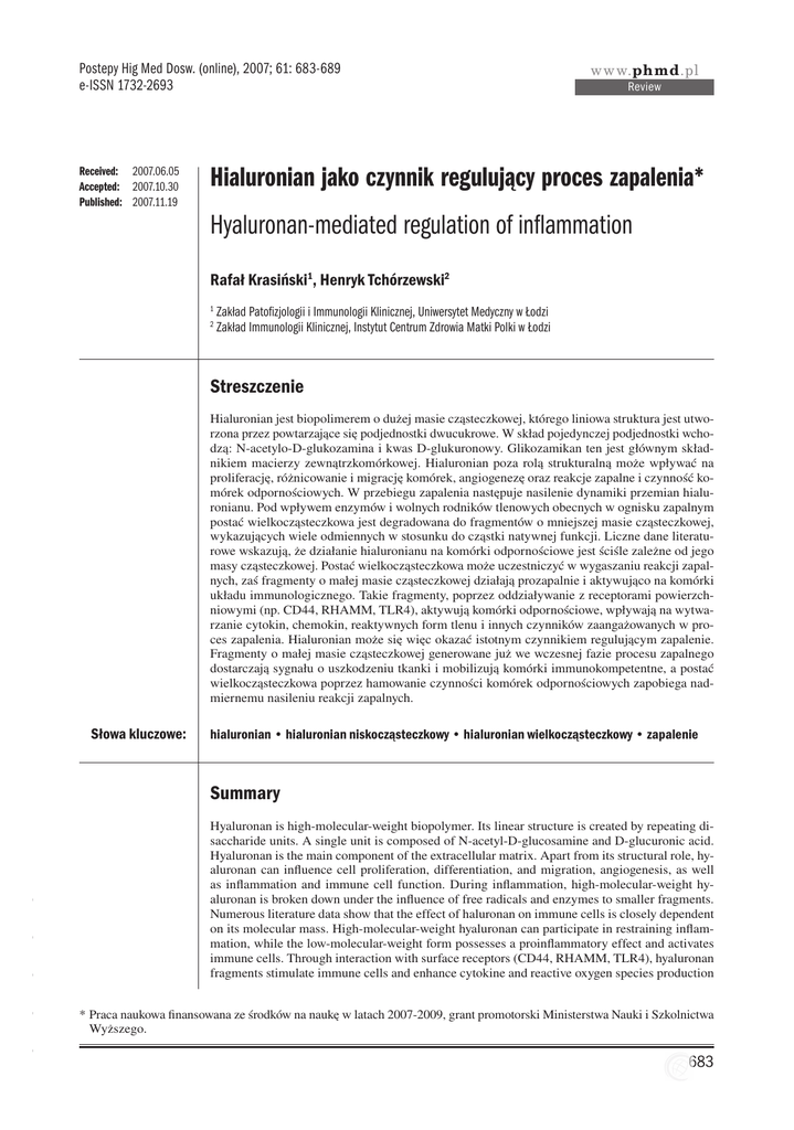 Postepy Hig Med Dosw. (online), 2007; 61: 683-689 e-ISSN 1732-2693 Received: 2007.06.05 Accepted: 2007.10.30 Published: 2007.11.19 www.phmd.pl Review Hialuronian jako czynnik regulujący proces zapalenia* Hyaluronan-mediated regulation of inflammation Rafał Krasiński1, Henryk Tchórzewski2 1 2 Zakład Patofizjologii i Immunologii Klinicznej, Uniwersytet Medyczny w Łodzi Zakład Immunologii Klinicznej, Instytut Centrum Zdrowia Matki Polki w Łodzi Streszczenie Hialuronian jest biopolimerem o dużej masie cząsteczkowej, którego liniowa struktura jest utworzona przez powtarzające się podjednostki dwucukrowe. W skład pojedynczej podjednostki wchodzą: N-acetylo-D-glukozamina i kwas D-glukuronowy. Glikozamikan ten jest głównym składnikiem macierzy zewnątrzkomórkowej. Hialuronian poza rolą strukturalną może wpływać na proliferację, różnicowanie i migrację komórek, angiogenezę oraz reakcje zapalne i czynność komórek odpornościowych. W przebiegu zapalenia następuje nasilenie dynamiki przemian hialuronianu. Pod wpływem enzymów i wolnych rodników tlenowych obecnych w ognisku zapalnym postać wielkocząsteczkowa jest degradowana do fragmentów o mniejszej masie cząsteczkowej, wykazujących wiele odmiennych w stosunku do cząstki natywnej funkcji. Liczne dane literaturowe wskazują, że działanie hialuronianu na komórki odpornościowe jest ściśle zależne od jego masy cząsteczkowej. Postać wielkocząsteczkowa może uczestniczyć w wygaszaniu reakcji zapalnych, zaś fragmenty o małej masie cząsteczkowej działają prozapalnie i aktywująco na komórki układu immunologicznego. Takie fragmenty, poprzez oddziaływanie z receptorami powierzchniowymi (np. CD44, RHAMM, TLR4), aktywują komórki odpornościowe, wpływają na wytwarzanie cytokin, chemokin, reaktywnych form tlenu i innych czynników zaangażowanych w proces zapalenia. Hialuronian może się więc okazać istotnym czynnikiem regulującym zapalenie. Fragmenty o małej masie cząsteczkowej generowane już we wczesnej fazie procesu zapalnego dostarczają sygnału o uszkodzeniu tkanki i mobilizują komórki immunokompetentne, a postać wielkocząsteczkowa poprzez hamowanie czynności komórek odpornościowych zapobiega nadmiernemu nasileniu reakcji zapalnych. Słowa kluczowe: hialuronian • hialuronian niskocząsteczkowy • hialuronian wielkocząsteczkowy • zapalenie Hyaluronan is high-molecular-weight biopolymer. Its linear structure is created by repeating disaccharide units. A single unit is composed of N-acetyl-D-glucosamine and D-glucuronic acid. Hyaluronan is the main component of the extracellular matrix. Apart from its structural role, hyaluronan can influence cell proliferation, differentiation, and migration, angiogenesis, as well as inflammation and immune cell function. During inflammation, high-molecular-weight hyaluronan is broken down under the influence of free radicals and enzymes to smaller fragments. Numerous literature data show that the effect of haluronan on immune cells is closely dependent on its molecular mass. High-molecular-weight hyaluronan can participate in restraining inflammation, while the low-molecular-weight form possesses a proinflammatory effect and activates immune cells. Through interaction with surface receptors (CD44, RHAMM, TLR4), hyaluronan fragments stimulate immune cells and enhance cytokine and reactive oxygen species production * Praca naukowa finansowana ze środków na naukę w latach 2007-2009, grant promotorski Ministerstwa Nauki i Szkolnictwa Wyższego. - - - - - Summary 683 Postepy Hig Med Dosw (online), 2007; tom 61: 683-689 as well as other factors participating in inflammation. Hyaluronate can thus be an important regulator of the inflammatory process. Low-molecular-weight fragments deliver signal about tissue damage and mobilize immune cells, while the high-molecular-form suppresses immune cell function and prevents excessive exacerbation of inflammation. Key words: Full-text PDF: Word count: Tables: Figures: References: Adres autora: Wykaz skrótów: hyaluronan • high-molecular-weight hyaluronan • low-molecular-weight hyaluronan • inflammation http://www.phmd.pl/pub/phmd/vol_61/11508.pdf 2439 1 1 52 mgr Rafał Krasiński, Zakład Immunologii Klinicznej, Instytut Centrum Zdrowia Matki Polki, ul. Rzgowska 281/289, 93-338 Łódź; e-mail: [email protected] HA – hialuronian; HAS – syntaza hialuronianowa; HMWH – hialuronian wielkocząsteczkowy; LMWH – hialuronian niskocząsteczkowy; PMNL – leukocyty wielojądrzaste; TLR – receptor toll-podobny (toll-like receptor). WSTĘP Hialuronian (HA) – glikozaminoglikan będący głównym składnikiem macierzy zewnątrzkomórkowej - jest biopolimerem o liniowej, nierozgałęzionej cząsteczce, zbudowanym z powtarzających się podjednostek dwucukrowych. W skład pojedynczej podjednostki wchodzą: N-acetylo-D-glukozamina i kwas D-glukuronowy [20]. W odróżnieniu od innych glikozaminoglikanów (siarczan heparyny, siarczan chondroityny, siarczan dermatanu) jest syntetyzowany nie we wnętrzu komórki a na wewnętrznej powierzchni błony komórkowej [33] z udziałem enzymów – syntaz hialuronianowych HAS1, HAS2, HAS3 [50], a powstająca de novo cząsteczka ulega translokacji do przestrzeni zewnątrzkomórkowej w miarę wydłużania łańcucha [33]. HA występuje fizjologicznie jako polimer o dużej masie cząsteczkowej (>106 Da). go, rak jajnika, wytwarza zwiększone ilości HA. Wykazano, że HA sprzyja proliferacji komórek nowotworowych i rozwojowi guza [14], a także może tworzyć fizyczną barierę chroniącą guz przed wpływem układu odpornościowego [46] i wpływać na czynność komórek odpornościowych [18]. Pewne nowotwory, jak np. rak pęcherza moczowego czy rak prostaty, wytwarzają hialuronidazę degradującą HA [21]. Powstające oligosacharydy HA sprzyjają rozwojowi nowotworu poprzez stymulację angiogenezy [39] i nasilenie migracji komórek nowotworowych [40]. Liczne dane li