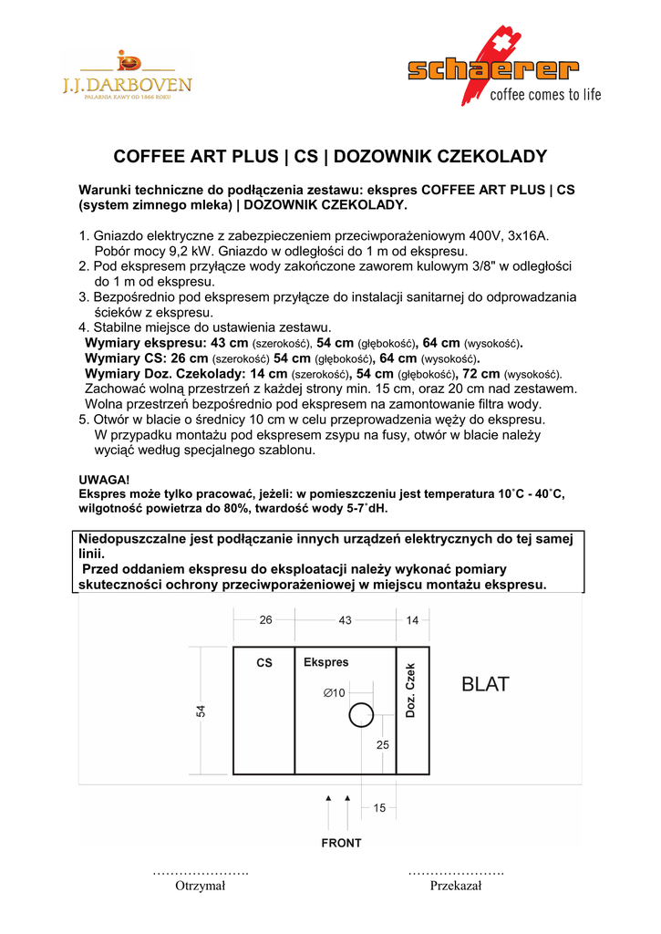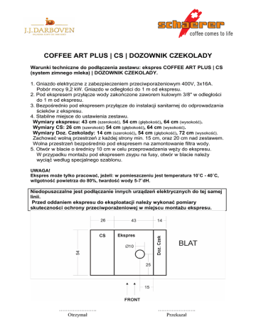 COFFEE ART PLUS | CS | DOZOWNIK CZEKOLADY Warunki techniczne do podłączenia zestawu: ekspres COFFEE ART PLUS | CS (system zimnego mleka) | DOZOWNIK CZEKOLADY. 1. Gniazdo elektryczne z zabezpieczeniem przeciwporażeniowym 400V, 3x16A. Pobór mocy 9,2 kW. Gniazdo w odległości do 1 m od ekspresu. 2. Pod ekspresem przyłącze wody zakończone zaworem kulowym 3/8" w odległości do 1 m od ekspresu. 3. Bezpośrednio pod ekspresem przyłącze do instalacji sanitarnej do odprowadzania ścieków z ekspresu. 4. Stabilne miejsce do ustawienia zestawu. Wymiary ekspresu: 43 cm (szerokość), 54 cm (głębokość), 64 cm (wysokość). Wymiary CS: 26 cm (szerokość) 54 cm (głębokość), 64 cm (wysokość). Wymiary Doz. Czekolady: 14 cm (szerokość), 54 cm (głębokość), 72 cm (wysokość). Zachować wolną przestrzeń z każdej strony min. 15 cm, oraz 20 cm nad zestawem. Wolna przestrzeń bezpośrednio pod ekspresem na zamontowanie filtra wody. 5. Otwór w blacie o średnicy 10 cm w celu przeprowadzenia węży do ekspresu. W przypadku montażu pod ekspresem zsypu na fusy, otwór w blacie należy wyciąć według specjalnego szablonu. UWAGA! Ekspres może tylko pracować, jeżeli: w pomieszczeniu jest temperatura 10˚C - 40˚C, wilgotność powietrza do 80%, twardość wody 5-7˚dH. Niedopuszczalne jest podłączanie innych urządzeń elektrycznych do tej samej linii. Przed oddaniem ekspresu do eksploatacji należy wykonać pomiary skuteczności ochrony przeciwporażeniowej w miejscu montażu ekspresu. …………………. Otrzymał …………………. Przekazał