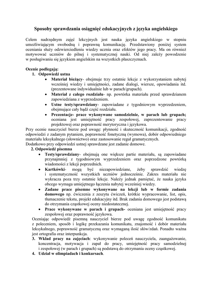 Sposoby sprawdzania osiągnięć edukacyjnych z języka angielskiego Celem nadrzędnym zajęć lekcyjnych jest nauka języka angielskiego w stopniu umożliwiającym swobodną i poprawną komunikację. Przedstawiony poniżej system oceniania służy odzwierciedleniu wiedzy ucznia oraz efektów jego pracy. Ma on również motywować uczniów do pilnej i systematycznej nauki. Od niej zależy powodzenie w posługiwaniu się językiem angielskim na wszystkich płaszczyznach. Ocenie podlegają: 1. Odpowiedź ustna Materiał bieżący- obejmuje trzy ostatnie lekcje z wykorzystaniem nabytej wcześniej wiedzy i umiejętności, zadane dialogi, wiersze, opowiadania itd. (prezentowane indywidualnie lub w parach/grupach). Materiał z całego rozdziału- np. powtórka materiału przed sprawdzianem zapowiedziana z wyprzedzeniem. Ustne testy/sprawdziany- zapowiadane z tygodniowym wyprzedzeniem, obejmujące cały bądź część rozdziału. Prezentacje- prace wykonywane samodzielnie, w parach lub grupach; oceniana jest umiejętność pracy zespołowej, zaprezentowanie pracy projektowej oraz poprawność merytoryczna i językowa. Przy ocenie nauczyciel bierze pod uwagę: płynność i skuteczność komunikacji, zgodność odpowiedzi z zadanym pytaniem, poprawność fonetyczną (wymowa), dobór odpowiedniego materiału leksykalnego (słownictwo) oraz zastosowanie reguł gramatycznych. Dodatkowo przy odpowiedzi ustnej sprawdzane jest zadanie domowe. 2. Odpowiedź pisemna Testy/sprawdziany- obejmują one większe partie materiału, są zapowiadane przynajmniej z tygodniowym wyprzedzeniem oraz poprzedzone powtórką wiadomości z lekcji poprzednich. Kartkówki- mogą być niezapowiedziane, żeby sprawdzić wiedzę i systematyczność wszystkich uczniów jednocześnie. Zakres materiału nie wykracza poza trzy ostatnie lekcje. Należy jednak pamiętać, że nauka języka obcego wymaga umiejętnego łączenia nabytej wcześniej wiedzy. Zadane prace pisemne wykonywane na lekcji lub w formie zadania domowego np. ćwiczenia z zeszytu ćwiczeń, krótkie wypracowanie, list, opis, tłumaczenie tekstu, projekt edukacyjny itd. Brak zadania domowego jest podstawą do otrzymania cząstkowej oceny niedostatecznej. Prace wykonywane w parach i grupach- oceniana jest umiejętność pracy zespołowej oraz poprawność językowa. Oceniając odpowiedź pisemną nauczyciel bierze pod uwagę zgodność komunikatu z poleceniem, sposób i logikę przekazania komunikatu, znajomość i dobór materiału leksykalnego, poprawność gramatyczną oraz wymaganą ilość słów/zdań. Ponadto ważna jest ortografia oraz interpunkcja. 3. Wkład pracy na zajęciach: wykonywanie poleceń nauczyciela, zaangażowanie, koncentracja, motywacja i zapał do pracy, umiejętność pracy samodzielnej i zespołowej (w parach i grupach) są podstawą do otrzymania oceny cząstkowej. 4. Udział w olimpiadach i konkursach. Kontrakt z uczniami Ocenę niedostateczną ze sprawdzianiu/testu należy poprawić w ciągu tygodnia od dnia jej otrzymania w terminie uzgodnionym z nauczycielem. Poprawa pozostałych ocen cząstkowych odbywa się w formie i termine ustalonym z nauczycielem, nie dłuższym niż 1 tydzień od dnia otrzymania oceny, chyba że nauczyciel zdecyduje inaczej ze względu na indywidualne potrzeby edukacyjne ucznia. Poprawa oceny niedostatecznej jest jednorazowa! Testy i sprawdziany są obowiązkowe! W razie nieobecności uczeń musi napisać lub zaliczyć ustnie (dotyczy ustnych testów) zaległy sprawdzian/test w ciągu kolejnego tygodnia od daty powrotu do szkoły. Termin ustala nauczyciel. W przypadku dłuższej usprawiedliwionej nieobecności w szkole nauczyciel poinformuje o konsultacjach w celu nadrobienia zaległości i wywiązania się z obowiązków. W razie nieprzystąpienia do napisania zaległego sprawdzianu/testu nieobecność traktowana jest na równi z oceną niedostateczną. Testy/sprawdziany są oceniane w ciągu dwóch tygodni od ich napisania. W przypadku zdarzeń losowych/choroby nauczyciela czas poprawy może się wydłużyć. Prace pisemne muszą być oddane nauczycielowi po ich omówieniu na zajęciach. Są one do wglądu rodziców i opiekunów. W przypadku nieobecności ucznia na kartkówce nauczyciel ma prawo sprawdzić wiedzę ucznia na kolejnej lekcji. Nie dotyczy dłuższych nieobecności. W przypadku uczniów ze stwierdzoną dysfunkcją, a w szczególności dysleksją rozwojową nauczyciel może poprosić ucznia o udzielenie odpowiedzi ustnej z materiału obejmującego pracę pisemną, chyba że uczeń nie wyrazi takiej zgody. Wtedy praca pisemna ucznia będzie oceniana jak praca ucznia z rozpoznaną dysleksją. Osoba, która w czasie pisania kartkówki, sprawdzianu lub innej pracy pisemnej lub odpowiedzi ustnej będzie zaglądać do kartki kolegi/ koleżanki lub korzystać z innych niedozwolonych form pomocy (ściąg), otrzyma ocenę niedostateczną bez możliwości jej poprawy. Nauczyciel może również przerwać sprawdzian całej klasie, jeżeli praca uczniów jest nieuczciwa i nie gwarantuje samodzielności. Oceny z poszczególnych form wypowiedzi mają różną wagę i wartość. Najważniejsze są oceny z prac kontrolnych: testów i sprawdzianów. Oceny śródroczna i roczna nie są średnią arytmetyczną ocen bieżących. Uczeń, który uzyskał niedostateczną ocenę śródroczną zobowiązany jest nadrobić zaległości i przystąpić do poprawy oceny w terminie uzgodnionym z nauczycielem, nie dłuższym niż miesiąc od zakończenia pierwszego półrocza. Wszystkie oceny są jawne. Uczeń zawsze uzyskuje informacje o otrzymanej ocenie. Uczeń musi być przygotowany do zajęć lekcyjnych i mieć odrobione zadanie domowe. Obowiązkiem ucznia jest posiadanie i przynoszenie na każdą lekcję języka angielskiego podręcznika, zeszytu ćwiczeń i notatnika. Obowiązkiem ucznia jest aktywny udział w lekcji, monitorowanie jej przebiegu i sporządzanie notatek. W ciągu półrocza uczeń może zgłosić jedno 