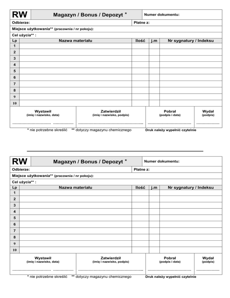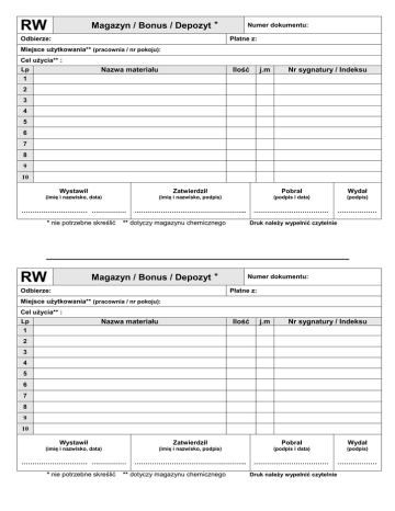 RW Magazyn / Bonus / Depozyt * Odbierze: Numer dokumentu: Płatne z: Miejsce uŜytkowania** (pracownia / nr pokoju): Cel uŜycia** : Nazwa materiału Lp Ilość j.m Nr sygnatury / Indeksu 1 2 3 4 5 6 7 8 9 10 Wystawił Zatwierdził Pobrał Wydał (imię i nazwisko, data) (imię i nazwisko, podpis) (podpis i data) (podpis) ………………………… ….………… …………………………………………... ……………………………. ……………… * nie potrzebne skreślić RW ** dotyczy magazynu chemicznego Druk naleŜy wypełnić czytelnie Magazyn / Bonus / Depozyt * Odbierze: Numer dokumentu: Płatne z: Miejsce uŜytkowania** (pracownia / nr pokoju): Cel uŜycia** : Nazwa materiału Lp Ilość j.m Nr sygnatury / Indeksu 1 2 3 4 5 6 7 8 9 10 Wystawił Zatwierdził Pobrał Wydał (imię i nazwisko, data) (imię i nazwisko, podpis) (podpis i data) (podpis) ………………………… ….………… …………………………………………... ……………………………. ……………… * nie potrzebne skreślić ** dotyczy magazynu chemicznego Druk naleŜy wypełnić czytelnie