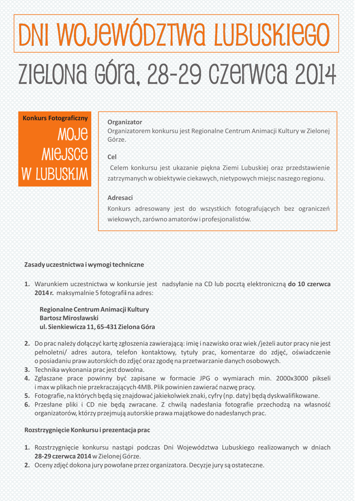 DNI WOJEWÓDZTWA LUBUSKIEGO Zielona Góra, 28-29 czerwca 2014 Konkurs Fotograficzny MOJE MIEJSCE W LUBUSKIM Organizator Organizatorem konkursu jest Regionalne Centrum Animacji Kultury w Zielonej Górze. Cel Celem konkursu jest ukazanie piękna Ziemi Lubuskiej oraz przedstawienie zatrzymanych w obiektywie ciekawych, nietypowych miejsc naszego regionu. Adresaci Konkurs adresowany jest do wszystkich fotografujących bez ograniczeń wiekowych, zarówno amatorów i profesjonalistów. Zasady uczestnictwa i wymogi techniczne 1. Warunkiem uczestnictwa w konkursie jest nadsyłanie na CD lub pocztą elektroniczną do 10 czerwca 2014 r. maksymalnie 5 fotografii na adres: Regionalne Centrum Animacji Kultury Bartosz Mirosławski ul. Sienkiewicza 11, 65-431 Zielona Góra 2. Do prac należy dołączyć kartę zgłoszenia zawierającą: imię i nazwisko oraz wiek /jeżeli autor pracy nie jest pełnoletni/ adres autora, telefon kontaktowy, tytuły prac, komentarze do zdjęć, oświadczenie o posiadaniu praw autorskich do zdjęć oraz zgodę na przetwarzanie danych osobowych. 3. Technika wykonania prac jest dowolna. 4. Zgłaszane prace powinny być zapisane w formacie JPG o wymiarach min. 2000x3000 pikseli i max w plikach nie przekraczających 4MB. Plik powinien zawierać nazwę pracy. 5. Fotografie, na których będą się znajdować jakiekolwiek znaki, cyfry (np. daty) będą dyskwalifikowane. 6. Przesłane pliki i CD nie będą zwracane. Z chwilą nadesłania fotografie przechodzą na własność organizatorów, którzy przejmują autorskie prawa majątkowe do nadesłanych prac. Rozstrzygnięcie Konkursu i prezentacja prac 1. Rozstrzygnięcie konkursu nastąpi podczas Dni Województwa Lubuskiego realizowanych w dniach 28-29 czerwca 2014 w Zielonej Górze. 2. Oceny zdjęć dokona jury powołane przez organizatora. Decyzje jury są ostateczne. 3. Wszyscy laureaci zostaną powiadomieni o werdykcie jury oraz dacie i godzinie wręczenia nagród drogą mailową lub telefoniczną do 20 czerwca. 4. Prace laureatów i wyróżnionych zostaną wystawione w galerii zielonogórskiej palmiarni podczas Dni Województwa Lubuskiego. 5. Organizator zastrzega sobie prawo do zmiany miejsca ekspozycji. 6. Nagrodzone prace zostaną opublikowane na stronie internetowej Regionalnego Centrum Animacji Kultury w Zielonej Górze . Nagrody 1. Organizatorzy przewidują nagrody rzeczowe za I, II i III miejsce oraz 2 wyróżnienia. Nagrody rzeczowe nie podlegają zamianie na inne ani zamianie na ekwiwalent pieniężny. 2. Nagrody zostaną wręczone podczas Dni Województwa Lubuskiego lub zostaną przesłane laureatom na koszt organizatorów w ciągu 10 dni od daty ogłoszenia wyników konkursu. Postanowienia końcowe 1. Udział w konkursie jest jednoznaczny z udzieleniem prawa do nieodpłatnego wykorzystywania prac na następujących polach eksploatacji: druku w dowolnej liczbie publikacji i w dowolnym nakładzie, używania ich w internecie oraz w innych formach utrwaleń, nadających się do rozpowszechniania w ramach działań Regionalnego Centrum Animacji Kultury. 2. Nadesłanie prac jest jednoznaczne z przystąpieniem do konkursu, akceptację warunków konkursu i regulaminu. W przypadku sporu dot. interpretacji postanowień regulaminu, interpretacja postanowień regulaminu należy do jury konkursu. Odwołania dot. oceny prac przez jury i innych decyzji jury nie będą rozpatrywane. 3. Udział w konkursie jest równoznaczny z wyrażeniem przez osoby uczestniczące zgody na przetwarzanie przez organizatora ich danych osobowych na potrzeby konkursu oraz w celach marketingowych organizatora /ustawa o ochronie danych osobowych z dn. 29.08.1997 r. Dz.U. Nr 133 poz. 833 z póz. zm./. Osoby uczestniczące w konkursie potwierdzają swoją zgodę na powyższe w formie przesłania do organizatora karty zgłoszenia stanowiącej załącznik do niniejszego regulaminu. 4. Za uczestników konkursu, którzy nie są pełnoletni, oświadczenia związane z ich udziałem w konkursie składają uczestnicy konkursu oraz ich prawni opiekunowie. 5. Organizator zastrzega sobie prawo do przerwania lub odwołania konkursu w każdym czasie, jednakże nie później niż po terminie nadsyłania prac