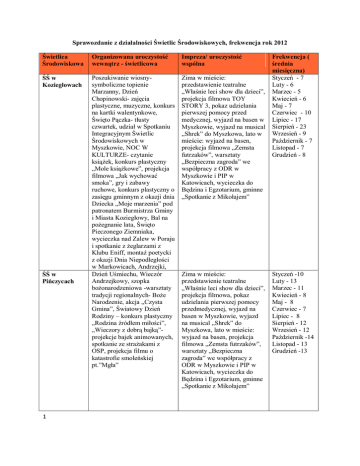 Sprawozdanie z działalności Świetlic Środowiskowych, frekwencja rok 2012 Świetlica Środowiskowa Organizowana uroczystość wewnątrz - świetlicowa Impreza/ uroczystość wspólna ŚŚ w Koziegłowach Poszukiwanie wiosnysymboliczne topienie Marzanny, Dzień Chopinowski- zajęcia plastyczne, muzyczne, konkurs na kartki walentynkowe, Święto Pączka- tłusty czwartek, udział w Spotkaniu Integracyjnym Świetlic Środowiskowych w Myszkowie, NOC W KULTURZE- czytanie książek, konkurs plastyczny „Mole książkowe”, projekcja filmowa „Jak wychować smoka”, gry i zabawy ruchowe, konkurs plastyczny o zasięgu gminnym z okazji dnia Dziecka „Moje marzenia” pod patronatem Burmistrza Gminy i Miasta Koziegłowy, Bal na pożegnanie lata, Święto Pieczonego Ziemniaka, wycieczka nad Zalew w Poraju i spotkanie z żeglarzami z Klubu Eniff, montaż poetycki z okazji Dnia Niepodległości w Markowicach, Andrzejki, Dzień Uśmiechu, Wieczór Andrzejkowy, szopka bożonarodzeniowa -warsztaty tradycji regionalnych- Boże Narodzenie, akcja „Czysta Gmina”, Światowy Dzień Rodziny – konkurs plastyczny „Rodzina źródłem miłości”, „Wieczory z dobrą bajką”projekcje bajek animowanych, spotkanie ze strażakami z OSP, projekcja filmu o katastrofie smoleńskiej pt.”Mgła” Zima w mieście: przedstawienie teatralne „Właśnie leci show dla dzieci”, projekcja filmowa TOY STORY 3, pokaz udzielania pierwszej pomocy przed medycznej, wyjazd na basen w Myszkowie, wyjazd na musical „Shrek” do Myszkowa, lato w mieście: wyjazd na basen, projekcja filmowa „Zemsta futrzaków”, warsztaty „Bezpieczna zagroda” we współpracy z ODR w Myszkowie i PIP w Katowicach, wycieczka do Będzina i Egzotarium, gminne „Spotkanie z Mikołajem” ŚŚ w Pińczycach 1 Zima w mieście: przedstawienie teatralne „Właśnie leci show dla dzieci”, projekcja filmowa, pokaz udzielania pierwszej pomocy przedmedycznej, wyjazd na basen w Myszkowie, wyjazd na musical „Shrek” do Myszkowa, lato w mieście: wyjazd na basen, projekcja filmowa „Zemsta futrzaków”, warsztaty „Bezpieczna zagroda” we współpracy z ODR w Myszkowie i PIP w Katowicach, wycieczka do Będzina i Egzotarium, gminne „Spotkanie z Mikołajem” Frekwencja ( średnia miesięczna) Styczeń - 7 Luty - 6 Marzec - 5 Kwiecień - 6 Maj - 7 Czerwiec - 10 Lipiec - 17 Sierpień - 23 Wrzesień - 9 Październik - 7 Listopad - 7 Grudzień - 8 Styczeń -10 Luty - 13 Marzec - 11 Kwiecień - 8 Maj - 8 Czerwiec - 7 Lipiec - 8 Sierpień - 12 Wrzesień - 12 Październik -14 Listopad - 13 Grudzień -13 ŚŚ w Wojsławicach Organizowanie zabawy karnawałowej, powitanie wakacji- ognisko i dyskoteka, noc na świetlicy- pieczonki, noc filmowa,, wyjazd do Aqaparku w Tarnowskich Górach”, „ Przegląd talentów”, Wigilia. Zima w mieście: przedstawienie teatralne „Właśnie leci show dla dzieci”, projekcja filmowa, pokaz udzielania pierwszej pomocy przedmedycznej, wyjazd na basen w Myszkowie, udział w „Nocy w kulturze” w Koziegłowach, wyjazd na musical „Shrek” do Myszkowa, Gminny Dzień Dziecka, lato w mieście: wyjazd na basen, projekcja filmowa „Zemsta futrzaków”, warsztaty „Bezpieczna zagroda” we współpracy z ODR w Myszkowie i PIP w Katowicach, wycieczka do Będzina i Egzotarium, piesza wycieczka do Czarnego Lasuognisko, gminne „Spotkanie z Mikołajem” Styczeń - 7 Luty - 6 Marzec - 6 Kwiecień - 9 Maj 13 Czerwiec - 7 Lipiec - 6 Sierpień - 9 Wrzesień - 6 Październik - 7 Listopad - 4 Grudzień - 5 ŚŚ w Mzykach Ognisko na pożegnanie lata, Święto pieczonego Ziemniaka – rozgrywki sportowe Szkoły Podstawowej w Gniazdowie, dyskoteka dla młodzieży, Andrzejki- wieczór poetycki, wycieczka rowerowaposzukiwanie wiosny, ognisko na powitanie lata, „Tydzień bajek”- wspólne czytanie ulubionych utworów, Jasełka parafialne. Styczeń - 9 Luty - 9 Marzec - 9 Kwiecień - 10 Maj - 7 Czerwiec - 8 Lipiec - 8 Sierpień - 11 Wrzesień - 10 Październik - 7 Listopad - 7 Grudzień - 4 ŚŚ w Gniazdowie Spotkanie ze strażakiem, dyskoteka walentynkowa, Dzień Kobiet- zabawa taneczna, Powitanie wiosnyportret Marzanny- konkurs plastyczny, Majówka – Udział w WOŚP, Zima w mieście: przedstawienie teatralne „Właśnie leci show dla dzieci”, projekcja filmowa, pokaz udzielania pierwszej pomocy przedmedycznej, wyjazd na basen w Myszkowie, udział w Balu Integracyjnym Świetlic Środowiskowych w Myszkowie, wyjazd na musical „Shrek” do Myszkowa, Gminny Dzień Dziecka, lato w mieście: wyjazd na basen, projekcja filmowa „Zemsta futrzaków”, warsztaty „Bezpieczna zagroda” we współpracy z ODR w Myszkowie i PIP w Katowicach, wycieczka do Będzina i Egzotarium, piesza wycieczka do Czarnego Lasuognisko, gminne „Spotkanie z Mikołajem” Udział w WOŚP, Zima w mieście: przedstawienie teatralne „Właśnie leci show dla dzieci”, projekcja filmowa, pokaz udzielania pierwszej pomocy przedmedycznej, 2 Styczeń - 7 Luty - 11 Marzec- 17 Kwiecień - 18 Maj - 18 Czerwiec - 16 pieczonki, podchody w plenerze, ognisko na pożegnanie lata, Dzień Chłopaka, Andrzejki, konkurs plastyczny – „Mój święty Mikołaj”, Wigilia, ŚŚ w Lgocie Górnej Walentynki, Topienie Marzanny, dzień Dziecka połączony z Dniem Matki (2.06), Święto pieczonego ziemniaka, spacer na cmentarz i porządkowanie grobów, plener malarski w Bobolicach, wycieczka do leśniczówki w Lgocie Górnej, ŚŚ w Cynkowie Udział w WOŚP, Biesiada Noworoczna, Dzień Babci i Dziadka, współpraca ze szkołą w ramach Comeniusa, tydzień bajkowy (konkursy plastyczne, opowiadanie bajek), wycieczka szkolna i świetlicowa do Zawoi, wyjazd do Aquaparku w Tarnowskich Górach, montaż poetycki z okazji Dnia Niepodległości, 3 wyjazd na basen w Myszkowie, udział w Balu Integracyjnym Świetlic Środowiskowych w Myszkowie, wyjazd na musical „Shrek” do Myszkowa, Gminny Dzień Dziecka, lato w mieście: wyjazd na basen, projekcja filmowa „Zems