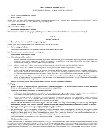 SKRÓT PROSPEKTU INFORMACYJNEGO PKO STRATEGICZNEJ ALOKACJI - FUNDUSZ INWESTYCYJNY OTWARTY 1. Nazwa Funduszu, siedziba i kraj siedziby. 1.1. Nazwa Funduszu. Fundusz działa pod nazwą „PKO Strategicznej Alokacji - fundusz inwestycyjny otwarty” i w dalszej części prospektu zwany jest „Funduszem”. Fundusz może używać zamiennie skróconej nazwy „PKO Strategicznej Alokacji – fio”. 1.2. Siedziba i kraj siedziby. ul. Puławska 15, 02-515 Warszawa, Polska. 2. Towarzystwo będące organem Funduszu. PKO Towarzystwo Funduszy Inwestycyjnych Spółka Akcyjna, 02-515 Warszawa, ul. Puławska 15, strona internetowa: www.pkotfi.pl. Rozdział I DANE O FUNDUSZU 1. Data wpisu Funduszu do rejestru funduszy inwestycyjnych. Fundusz został wpisany do rejestru funduszy inwestycyjnych w dniu 30 marca 2007 r. 2. Cel inwestycyjny Funduszu. 2.1. Celem Funduszu jest wzrost wartości Aktywów Funduszu w wyniku wzrostu wartości lokat. 2.2. Fundusz nie gwarantuje osiągnięcia celu inwestycyjnego. 3. Zasady polityki inwestycyjnej Funduszu. 3.1. Główne kategorie lokat Funduszu. 3.1.1. Proporcja pomiędzy poszczególnymi rodzajami lokat będzie uzależniona od decyzji Towarzystwa popartych analizami dokonanymi przez Towarzystwo oraz danymi otrzymanymi ze źródeł zewnętrznych, z uwzględnieniem zasad dywersyfikacji lokat oraz innych ograniczeń inwestycyjnych określonych w Ustawie, a także następujących zasad: 3.1.1.1. całkowita wartość lokat Funduszu w Instrumenty Udziałowe, może wynosić do 100% Wartości Aktywów Netto Funduszu. 3.1.1.2. całkowita wartość lokat Funduszu w Instrumenty Dłużne może wynosić do 100% Wartości Aktywów Netto Funduszu. 3.1.2. Fundusz może zawierać umowy mające za przedmiot instrumenty pochodne będące przedmiotem obrotu na rynku regulowanym w Rzeczypospolitej Polskiej lub państwie członkowskim, na rynku zorganizowanym niebędącym rynkiem regulowanym w Rzeczypospolitej Polskiej lub innym państwie członkowskim, lub na Innych Rynkach Zorganizowanych, a także niewystandaryzowane instrumenty pochodne. 3.1.3. Fundusz może lokować Aktywa na zasadach określonych w Ustawie w jednostki uczestnictwa funduszy inwestycyjnych otwartych mających siedzibę na obszarze Rzeczypospolitej Polskiej, a także w tytuły uczestnictwa emitowane przez fundusze zagraniczne oraz instytucje wspólnego inwestowania mające siedzibę za granicą. 3.2. Informacja o odzwierciedlaniu składu uznanego indeksu akcji lub dłużnych papierów wartościowych. Nie dotyczy. 3.3. Fundusz nie stosuje szczególnych strategii inwestycyjnych w odniesieniu do inwestycji na określonym obszarze geograficznym, w określonej branży lub sektorze gospodarczym albo w odniesieniu do określonej kategorii lokat. 3.4. Zawieranie umów, których przedmiotem są instrumenty pochodne. 3.4.1. Fundusz może zawierać umowy mające za przedmiot instrumenty pochodne, w tym niewystandaryzowane instrumenty pochodne, zarówno w celu ograniczenia ryzyka inwestycyjnego, jak i w celu zapewnienia sprawnego zarządzania portfelem Funduszu. 3.4.2. Zawarcie umowy mającej za przedmiot niewystandaryzowane instrumenty pochodne może powodować ryzyko kontrahenta - polegające na tym, że w przypadku, gdy wartość transakcji na danym instrumencie jest pozytywna dla Funduszu, zachodzi prawdopodobieństwo niewywiązania się przez kontrahenta z tej transakcji. 4. Wartość Jednostki Uczestnictwa w momencie jej zbycia i odkupienia przez Fundusz zależy od wartości Aktywów Funduszu i jego zobowiązań, w związku z czym Uczestnik może, w wyniku odkupienia Jednostek Uczestnictwa, otrzymać mniejszą kwotę niż kwota, którą wpłacił do Funduszu. 5. Opis ryzyka inwestycyjnego związanego z przyjętą polityką inwestycyjną Funduszu. 5.1. Do najważniejszych ryzyk, które powinni uwzględniać Uczestnicy Funduszu należą: ryzyko rynkowe, ryzyko stóp procentowych, ryzyko kredytowe, ryzyko rozliczenia, ryzyko płynności, ryzyko walutowe, ryzyko związane z przechowywaniem aktywów, ryzyko związane z koncentracją aktywów lub rynków, ryzyko makroekonomiczne, ryzyko sytuacji politycznej, ryzyko nie uzyskania statusu spółki publicznej lub niedopuszczenia do obrotu na rynku regulowanym, a także ryzyka specyficzne dla emitenta. 5.2. Szczegółowe informacje o wszystkich ryzykach wymienionych w pkt 5.1. są zawarte w Prospekcie. 6. Określenie profilu inwestora. Fundusz skierowany jest do inwestorów o średniej skłonności do ryzyka, chcących inwestować swoje oszczędności w sposób alternatywny do lokat bankowych, akceptujących politykę inwestycyjną Funduszu oraz ryzyko wynikające z przyjętej polityki inwestycyjnej. W szczególności, zważywszy, że Fundusz stosuje politykę inwestycyjną zmiennej alokacji, kierowany jest do inwestorów akceptujących ryzyko podwyższonej alokacji większej części aktywów Funduszu na rynku akcji, w tym także na zagranicznych rynkach akcji. Rekomendowany okres inwestowania w Fundusz wynosi minimum 4 lata. 7. Informacja o obowiązkach podatkowych. 7.1. Informacje o obowiązkach podatkowych Uczestników Funduszu są zawarte w Prospekcie. 7.2. Ze względu na fakt, że obowiązki podatkowe zależą od indywidualnej sytuacji Uczestnika Funduszu i miejsca dokonywania inwestycji, w celu ustalenia obowiązków podatkowych wskazane jest zasięgnięcie porady doradcy podatkowego lub prawnego. 8. Opłaty i prowizje związane z uczestnictwem w Funduszu. 8.1. Wartość Współczynnika Kosztów Całkowitych, zwanego dalej „wskaźnikiem WKC”. Współczynnik Kosztów Całkowitych (wskaźnik WKC) za rok 2011 wynosi: Dla Jednostek Uczestnictwa kategorii A, C – 4,67%. Na dzień 31.12.2011 Fundusz nie wyemitował Jednostek Uczestnictwa kategorii A1, B, B1, C1, E oraz I. 8.2. Opłaty manipulacyjne z tytułu zbycia lub odkupienia Jednostki Uczestnictwa oraz inne opłaty uiszczane bezpośrednio przez Uczestnika. 8.2.1. Uczestnik nabywając od Funduszu Jednostki Uczestnictwa kate