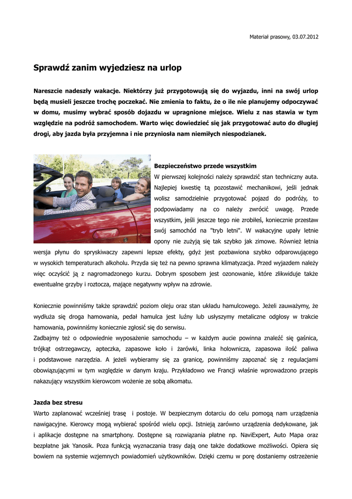 Materiał prasowy, 03.07.2012 Sprawdź zanim wyjedziesz na urlop Nareszcie nadeszły wakacje. Niektórzy już przygotowują się do wyjazdu, inni na swój urlop będą musieli jeszcze trochę poczekać. Nie zmienia to faktu, że o ile nie planujemy odpoczywać w domu, musimy wybrać sposób dojazdu w upragnione miejsce. Wielu z nas stawia w tym względzie na podróż samochodem. Warto więc dowiedzieć się jak przygotować auto do długiej drogi, aby jazda była przyjemna i nie przyniosła nam niemiłych niespodzianek. Bezpieczeństwo przede wszystkim W pierwszej kolejności należy sprawdzić stan techniczny auta. Najlepiej kwestię tą pozostawić mechanikowi, jeśli jednak wolisz samodzielnie przygotować pojazd do podróży, to podpowiadamy na co należy zwrócić uwagę. Przede wszystkim, jeśli jeszcze tego nie zrobiłeś, koniecznie przestaw swój samochód na "tryb letni". W wakacyjne upały letnie opony nie zużyją się tak szybko jak zimowe. Również letnia wersja płynu do spryskiwaczy zapewni lepsze efekty, gdyż jest pozbawiona szybko odparowującego w wysokich temperaturach alkoholu. Przyda się też na pewno sprawna klimatyzacja. Przed wyjazdem należy więc oczyścić ją z nagromadzonego kurzu. Dobrym sposobem jest ozonowanie, które zlikwiduje także ewentualne grzyby i roztocza, mające negatywny wpływ na zdrowie. Koniecznie powinniśmy także sprawdzić poziom oleju oraz stan układu hamulcowego. Jeżeli zauważymy, że wydłuża się droga hamowania, pedał hamulca jest luźny lub usłyszymy metaliczne odgłosy w trakcie hamowania, powinniśmy koniecznie zgłosić się do serwisu. Zadbajmy też o odpowiednie wyposażenie samochodu – w każdym aucie powinna znaleźć się gaśnica, trójkąt ostrzegawczy, apteczka, zapasowe koło i żarówki, linka holownicza, zapasowa ilość paliwa i podstawowe narzędzia. A jeżeli wybieramy się za granicę, powinniśmy zapoznać się z regulacjami obowiązującymi w tym względzie w danym kraju. Przykładowo we Francji właśnie wprowadzono przepis nakazujący wszystkim kierowcom wożenie ze sobą alkomatu. Jazda bez stresu Warto zaplanować wcześniej trasę i postoje. W bezpiecznym dotarciu do celu pomogą nam urządzenia nawigacyjne. Kierowcy mogą wybierać spośród wielu opcji. Istnieją zarówno urządzenia dedykowane, jak i aplikacje dostępne na smartphony. Dostępne są rozwiązania płatne np. NaviExpert, Auto Mapa oraz bezpłatne jak Yanosik. Poza funkcją wyznaczania trasy dają one także dodatkowe możliwości. Opiera się bowiem na systemie wzjemnych powiadomień użytkowników. Dzięki czemu w porę dostaniemy ostrzeżenie o wypadku, który zdarzył się na naszej trasie, a także o kontrolach policyjnych i fotoradarach. Pozwoli to na uniknięcie ewentualnego mandatu, który mógłby zepsuć nasz wakacyjny nastrój. Podróż będzie także mniej stresująca jeśli będziemy zaopatrzeni w odpowiednie ubezpieczenie.W Polsce każdy kierowca musi mieć obowiązkowo wykupione ubezpieczenie OC. Jest ono wystarczające w większości krajów europejskich, jednak w niektórych (jak w np.: Turcji) wymagana jest Zielona Karta czyli Międzynarodowy Certyfikat Ubezpieczeniowy. Istnieje też możliwosć wykupienia dodatkowego pakietu assistance. Dzięki temu, w zależności od oferty danego ubezpieczyciela, uzyskamy pomoc w zakresie holowania pojazdu, opieki medycznej czy zakwaterowania w hotelu w przypadku awarii samochodu. Dystrybucja materiałów: Magda Zglińska [email protected] kom./+48/ 519-181-900