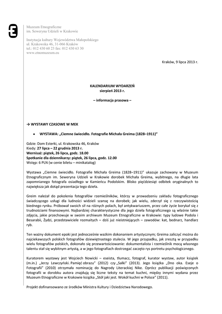 Kraków, 9 lipca 2013 r. KALENDARIUM WYDARZEO sierpieo 2013