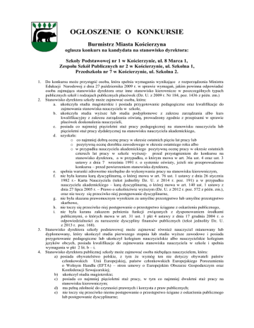 OGŁOSZENIE O KONKURSIE Burmistrz Miasta Kościerzyna ogłasza konkurs na kandydata na stanowisko dyrektora: Szkoły Podstawowej nr 1 w Kościerzynie, ul. 8 Marca 1, Zespołu Szkół Publicznych nr 2 w Kościerzynie, ul. Szkolna 1, Przedszkola nr 7 w Kościerzynie, ul. Szkolna 2. 1. Do konkursu może przystąpić osoba, która spełnia wymagania wynikające z rozporządzenia Ministra Edukacji Narodowej z dnia 27 października 2009 r. w sprawie wymagań, jakim powinna odpowiadać osoba zajmująca stanowisko dyrektora oraz inne stanowisko kierownicze w poszczególnych typach publicznych szkół i rodzajach publicznych placówek (Dz. U. z 2009 r. Nr 184, poz. 1436 z późn. zm.) 2. Stanowisko dyrektora szkoły może zajmować osoba, która: a. ukończyła studia magisterskie i posiada przygotowanie pedagogiczne oraz kwalifikacje do zajmowania stanowiska nauczyciela w szkole, b. ukończyła studia wyższe lub studia podyplomowe z zakresu zarządzania albo kurs kwalifikacyjny z zakresu zarządzania oświatą, prowadzony zgodnie z przepisami w sprawie placówek doskonalenia nauczycieli, c. posiada co najmniej pięcioletni staż pracy pedagogicznej na stanowisku nauczyciela lub pięcioletni staż pracy dydaktycznej na stanowisku nauczyciela akademickiego, d. uzyskała: o co najmniej dobrą ocenę pracy w okresie ostatnich pięciu lat pracy lub o pozytywną ocenę dorobku zawodowego w okresie ostatniego roku albo o w przypadku nauczyciela akademickiego pozytywną ocenę pracy w okresie ostatnich czterech lat pracy w szkole wyższej- przed przystąpieniem do konkursu na stanowisko dyrektora, a w przypadku, o którym mowa w art. 36a ust. 4 oraz ust. 3 ustawy z dnia 7 września 1991 r. o systemie oświaty, jeżeli nie przeprowadzono konkursu – przed powierzeniem stanowiska dyrektora, e. spełnia warunki zdrowotne niezbędne do wykonywania pracy na stanowisku kierowniczym, f. nie była karana karą dyscyplinarną, o której mowa w art. 76 ust. 1 ustawy z dnia 26 stycznia 1982 r.- Karta Nauczyciela (tekst jednolity Dz. U. z 2014 r. poz. 191) a w przypadku nauczyciela akademickiego – karą dyscyplinarną, o której mowa w art. 140 ust. 1 ustawy z dnia 27 lipca 2005 r. – Prawo o szkolnictwie wyższym (Dz. U. z 2012 r. poz. 572 z późn. zm.), oraz nie toczy się przeciwko niej postępowanie dyscyplinarne, g. nie była skazana prawomocnym wyrokiem za umyślne przestępstwo lub umyślne przestępstwo skarbowe, h. nie toczy się przeciwko niej postępowanie o przestępstwo ściągane z oskarżenia publicznego, i. nie była karana zakazem pełnienia funkcji związanych z dysponowaniem środkami publicznymi, o których mowa w art. 31 ust. 1 pkt 4 ustawy z dnia 17 grudnia 2004 r. o odpowiedzialności za naruszenie dyscypliny finansów publicznych (tekst jednolity Dz. U. z 2013 r. poz. 168). 3. Stanowisko dyrektora szkoły podstawowej może zajmować również nauczyciel mianowany lub dyplomowany, który ukończył studia pierwszego stopnia lub studia wyższe zawodowe i posiada przygotowanie pedagogiczne lub ukończył kolegium nauczycielskie albo nauczycielskie kolegium języków obcych, posiada kwalifikacje do zajmowania stanowiska nauczyciela w szkole i spełnia wymagania w pkt 2 lit. b – i. 4. Stanowisko dyrektora publicznej szkoły może zajmować osoba niebędąca nauczycielem, która: a) posiada obywatelstwo polskie, z tym że wymóg ten nie dotyczy obywateli państw członkowskich Unii Europejskiej, państw członkowskich Europejskiego Porozumienia o Wolnym Handlu (EFTA) – stron umowy o Europejskim Obszarze Gospodarczym oraz Konfederacji Szwajcarskiej; b) ukończył studia magisterskie; c) posiada co najmniej pięcioletni staż pracy, w tym co najmniej dwuletni staż pracy na stanowisku kierowniczym; d) ma pełną zdolność do czynności prawnych i korzysta z praw publicznych; e) nie toczy się przeciwko niemu postępowanie o przestępstwo ścigane z oskarżenia publicznego lub postępowanie dyscyplinarne; 5. Oferta osoby przystępującej do konkursu powinna zawierać: a. uzasadnienie przystąpienia do konkursu oraz koncepcję funkcjonowania i rozwoju szkoły, b. poświadczoną przez kandydata za zgodność z oryginałem kopię dowodu osobistego lub innego dokumentu potwierdzającego tożsamość oraz poświadczającego obywatelstwo kandydata, c. życiorys z opisem przebiegu pracy zawodowej, zawierający w szczególności informację o: - stażu pracy pedagogicznej - w przypadku nauczyciela albo - stażu pracy dydaktycznej - w przypadku nauczyciela akademickiego, - stażu pracy, w tym stażu pracy na stanowisku kierowniczym- w przypadku osoby niebędącej nauczycielem, d. oryginały lub poświadczone przez kandydata za zgodność z oryginałem kopie dokumentów potwierdzających posiadanie wymaganego stażu pracy, o którym mowa w lit. c, e. oryginały lub poświadczone przez kandydata za zgodność z oryginałem kopie dokumentów potwierdzających posiadanie wymaganego wykształcenia, w tym dyplomu ukończenia studiów wyższych lub świadectwa ukończenia studiów podyplomowych z zakresu zarządzania albo świadectwo ukończenia kursu kwalifikacyjnego z zakresu zarządzania oświatą, f. zaświadczenie lekarskie o braku przeciwwskazań zdrowotnych do wykonywania pracy na stanowisku kierowniczym, g. oświadczenie, że przeciwko kandydatowi nie toczy się postępowanie o przestępstwo ściągane z oskarżenia publicznego lub postępowanie dyscyplinarne, h. oświadczenie, że kandydat nie był skazany prawomocnym wyrokiem za umyślne przestępstwo lub umyślne przestępstwo skarbowe, i. oświadczenie, że kandydat nie był karany zakazem pełnienia funkcji związanych z dysponowaniem środkami publicznymi, o których mowa w art. 31 ust. 1 pkt 4 ustawy z dnia 17 grudnia 2004 r. o odpowiedzialności za naruszenie dyscypliny finansów publicznych (tekst jednolity Dz. U. z 2013 r. poz. 168), j. oświadczenie o dopełnieniu obowiązku, o którym mowa w art. 7 ust. 1 i ust. 3a ustawy z dnia 18 pa