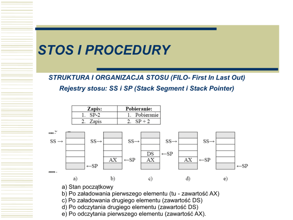 STOS I PROCEDURY STRUKTURA I ORGANIZACJA STOSU (FILO- First In Last Out) Rejestry stosu: SS i SP (Stack Segment i Stack Pointer) a) Stan początkowy b) Po załadowania pierwszego elementu (tu - zawartość AX) c) Po załadowania drugiego elementu (zawartość DS) d) Po odczytania drugiego elementu (zawartość DS) e) Po odczytania pierwszego elementu (zawartość AX). INSTRUKCJE STOSU 1 push operand16/32 (reg/mem) push ax push bh Push cf ;Nie! ; Nie! TABLICA dw 2000 dup (1234h) LICZBA dw ? push TABLICA[bx][si] ;wstaw na stos zawartość odpowiednie komórki pam push LICZBA ;wstaw na stos wartość zmiennej LICZBA push 0 ;zapisz zero na stosie push 20abh ;zapisz 20abh na stosie INSTRUKCJE STOSU 2 pop operand16/32 (reg/mem) TABLICA dw 1000 dup(?) LICZBA dw ? pop TABLICA[bx] ;zdejmij ze stosu wartość i wstaw do tablicy w miejsce ;skazane przez rejestr bx pop LICZBA ;zdejmij ze stosu wartość i wstaw do zmiennej LICZBA popa, popad pushf, pushfd/popf. popfd Procedury Deklaracja procedury: Nazwa PROC [typ]; tresc Ret Nazwa ENDP typ: NEAR (skok wewnętrzny/domyślny), FAR (skok między segmentami) Przykład: MOJA_PROCEDUURA PROC NEAR MOV AX,........ MOV .............. .................................... RET MOJA_PROCEDUURA ENDP !!! Wywołanie procedury: call Nazwa Przekazywanie parametrów Przez rejestry ➢Przykład..... Przez stos ➢przykład..... .model small .stack .data text db 'Ten tekst jest wyświetlany dzięki procedurze, która dostaje sw˘j parametr poprzez rejestr (DX)$' .code MOV ax, @data MOV ds, ax ;to chyba jasne MOV dx, offset text CALL drukuj MOV ah, 4ch ; no to chyba teľ jasne - koäcz© program INT 21h drukuj PROC MOV ah,9 INT 21h ; urochamiam funkcję... RET drukuj ENDP END .model small .stack .data text db 'Ten tekst jest wyświetlany dzięki procedurze, która dostaje swoj parametr poprzez STOS$' .code MOV ax, @data MOV ds, ax ;to chyba jasne push offset text; CALL drukuj MOV ah, 4ch ; no to chyba też jasne - kończę program INT 21h drukuj PROC mov bp, sp mov dx, [bp+2]; MOV ah,9 INT 21h drukuj ENDP END Zerowanie rejestrów /CIEKAWIE W CZYM RÓŹNICA?.../ mov ax,0 ;wpisanie wartości bezpośredniej, instrukcja zajmuje 5 bajtów xor ax,ax ;wykonanie instrukcji xor na dwu identycznych liczbach bitowych, w wyniku otrzymamy zero, instrukcja zajmuje 2 bajty sub ax,ax ;odjęcie ax od ax, w wyniku otrzymamy zero, instrukcja zajmuje 2 bajty and ax,0 ;iloczyn logiczny ax i 0, w wyniku otrzymamy zero, instrukcja zajmuje 3 bajty Procedury (dodatkowe) Pełna deklaracja procedury: Nazwa PROC [atrybuty] [Uses lista rejestrów] [,] [parametry [: definicja typu]...]; Atrybuty: Typ (dystans) (NEARDOMYŚLNE, FAR) Typ języka (STDSYSDOMYŚLNE, STDCALL, Pascal,C) Widoczność (PRIVATEDOMYŚLNE, PUBLIC) Lista rejestrów (Uses R1 R2 R3) Parametry (ARG A1 A2 A3) Przekazywanie parametrów 2 Przez globalne zmienny Dyrektywa ARG Przez globalne zmienny 1 .model small .data text db ‘Tekst po raz kolejny...$' .code MOV ax, @data MOV ds, ax MOV dx, offset text CALL drukuj MOV ah, 4ch INT 21h drukuj PROC MOV DX, OFFSET text MOV ah,9 INT 21h RET drukuj ENDP END Przez globalne zmienny 2 JAK PISAĆ WIELOMODUŁOWE PROGRAMY Main.asm >> main.obj Lib.asm >> lib.obj tlink main lib [, nazwa aplikacji] >> XXX.exe ;********* BIBLIOTEKA NASZA****** .model small kod segment public assume cs:kod, ds:dane ;************************************* ; MODUL GŁÓWNY PROGRAMU ;*********************************** .model small kod segment public assume cs:kod extrn druk: proc, bierz: proc, koniec:proc, znak:byte start: call bierz mov dl, znak call druk call koniec kod ends public druk,bierz,koniec, znak druk proc mov ah,2 int 21h ret druk endp bierz proc mov ah,1 int 21h mov znak,al ret bierz endp koniec proc mov ah, 4ch int 21h koniec endp end dane segment znak db ? dane ends kod ends end ;*********************************** ;********* BIBLIOTEKA NASZA****** ;*********************************** .model small .data znak db ? ;************************************* ; MODUL GŁÓWNY PROGRAMU ;*********************************** .model small .code extrn druk: proc, bierz: proc, koniec:proc, znak:byte start: call bierz mov dl, 13 call druk mov dl,10 call druk mov dl, znak call druk call koniec end .code public druk,bierz,koniec, znak druk proc mov ah,2 int 21h ret druk endp bierz proc mov ax, @data mov ds, ax mov ah,1 int 21h mov znak,al ret bierz endp koniec proc mov ah, 4ch int 21h ret koniec endp end Przekazywanie parametrów przez ARG Nazwa PROC [atrybuty] [Uses lista rejestrów] [,] [parametry [: definicja typu]...]; .MODEL SMALL TST PROC pascal ARG X:word, Z:DWORD Y:WORD, .STACK .CODE MOV AX,X MOV CX,1 mov bx,y MOV DX,2 mov cx, word ptr z PUSH CX DX 1234H 5678H mov dx, word ptr z+2 CALL TST RET ADD SP,2 TST ENDP CALL TST END MOV AH, 4CH INT 21H