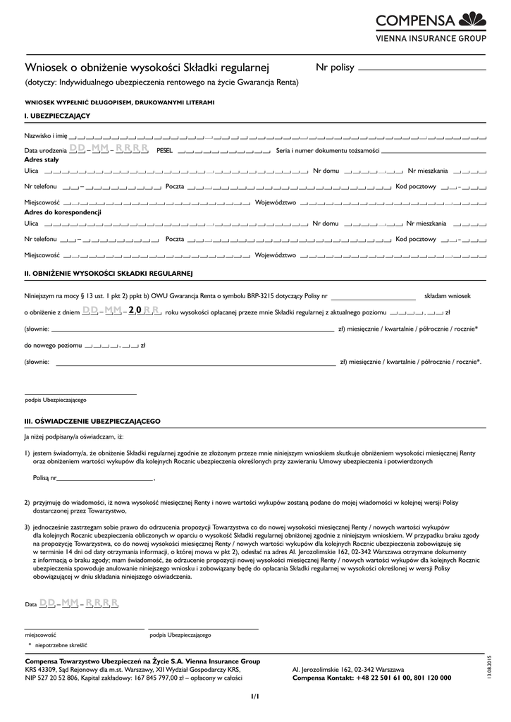 Wniosek o obniżenie wysokości Składki regularnej Nr polisy (dotyczy: Indywidualnego ubezpieczenia rentowego na życie Gwarancja Renta) WNIOSEK WYPE¸NIĆ D¸UGOPISEM, DRUKOWANYMI LITERAMI I. UBEZPIECZAJĄCY Nazwisko i imię Data urodzenia Adres sta∏y D D MM R R R R Seria i numer dokumentu tożsamości PESEL Ulica Nr mieszkania Nr domu Nr telefonu Poczta Miejscowość Adres do korespondencji Kod pocztowy Województwo Nr mieszkania Nr domu Ulica Nr telefonu Kod pocztowy Poczta Miejscowość Województwo II. OBNIŻENIE WYSOKOŚCI SKŁADKI REGULARNEJ Niniejszym na mocy § 13 ust. 1 pkt 2) ppkt b) OWU Gwarancja Renta o symbolu BRP-3215 dotyczący Polisy nr o obniżenie z dniem D D MM 2 0 R R roku wysokości opłacanej przeze mnie Składki regularnej z aktualnego poziomu (słownie: do nowego poziomu składam wniosek , zł zł) miesięcznie / kwartalnie / półrocznie / rocznie* , zł (słownie: zł) miesięcznie / kwartalnie / półrocznie / rocznie*. podpis Ubezpieczającego III. OŚWIADCZENIE UBEZPIECZAJĄCEGO Ja niżej podpisany/a oświadczam, iż: 1) jestem świadomy/a, że obniżenie Składki regularnej zgodnie ze złożonym przeze mnie niniejszym wnioskiem skutkuje obniżeniem wysokości miesięcznej Renty oraz obniżeniem wartości wykupów dla kolejnych Rocznic ubezpieczenia określonych przy zawieraniu Umowy ubezpieczenia i potwierdzonych Polisą nr , 2) przyjmuję do wiadomości, iż nowa wysokość miesięcznej Renty i nowe wartości wykupów zostaną podane do mojej wiadomości w kolejnej wersji Polisy dostarczonej przez Towarzystwo, 3) jednocześnie zastrzegam sobie prawo do odrzucenia propozycji Towarzystwa co do nowej wysokości miesięcznej Renty / nowych wartości wykupów dla kolejnych Rocznic ubezpieczenia obliczonych w oparciu o wysokość Składki regularnej obniżonej zgodnie z niniejszym wnioskiem. W przypadku braku zgody na propozycję Towarzystwa, co do nowej wysokości miesięcznej Renty / nowych wartości wykupów dla kolejnych Rocznic ubezpieczenia zobowiązuję się w terminie 14 dni od daty otrzymania informacji, o której mowa w pkt 2), odesłać na adres Al. Jerozolimskie 162, 02-342 Warszawa otrzymane dokumenty z informacją o braku zgody; mam świadomość, że odrzucenie propozycji nowej wysokości miesięcznej Renty / nowych wartości wykupów dla kolejnych Rocznic ubezpieczenia spowoduje anulowanie niniejszego wniosku i zobowiązany będę do opłacania Składki regularnej w wysokości określonej w wersji Polisy obowiązującej w dniu składania niniejszego oświadczenia. Data D D MM R R R R miejscowość podpis Ubezpieczającego Compensa Towarzystwo Ubezpieczeń na Życie S.A. Vienna Insurance Group KRS 43309, Sąd Rejonowy dla m.st. Warszawy, XII Wydzia∏ Gospodarczy KRS, NIP 527 20 52 806, Kapita∏ zak∏adowy: 167 845 797,00 zł – op∏acony w ca∏ości 1/1 Al. Jerozolimskie 162, 02-342 Warszawa Compensa Kontakt: +48 22 501 61 00, 801 120 000 13.08.2015 * niepotrzebne skreślić