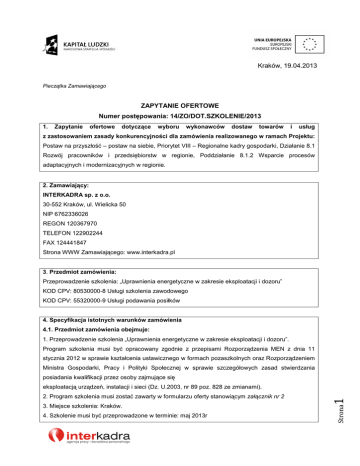 Kraków, 19.04.2013 Pieczątka Zamawiającego ZAPYTANIE OFERTOWE Numer postępowania: 14/ZO/DOT.SZKOLENIE/2013 1. Zapytanie ofertowe dotyczące wyboru wykonawców dostaw towarów i usług z zastosowaniem zasady konkurencyjności dla zamówienia realizowanego w ramach Projektu: Postaw na przyszłość – postaw na siebie, Priorytet VIII – Regionalne kadry gospodarki, Działanie 8.1 Rozwój pracowników i przedsiębiorstw w regionie, Poddziałanie 8.1.2 Wsparcie procesów adaptacyjnych i modernizacyjnych w regionie. 2. Zamawiający: INTERKADRA sp. z o.o. 30-552 Kraków, ul. Wielicka 50 NIP 6762336026 REGON 120367970 TELEFON 122902244 FAX 124441847 Strona WWW Zamawiającego: www.interkadra.pl 3. Przedmiot zamówienia: Przeprowadzenie szkolenia: „Uprawnienia energetyczne w zakresie eksploatacji i dozoru” KOD CPV: 80530000-8 Usługi szkolenia zawodowego KOD CPV: 55320000-9 Usługi podawania posiłków 4. Specyfikacja istotnych warunków zamówienia 4.1. Przedmiot zamówienia obejmuje: 1. Przeprowadzenie szkolenia „Uprawnienia energetyczne w zakresie eksploatacji i dozoru”. Program szkolenia musi być opracowany zgodnie z przepisami Rozporządzenia MEN z dnia 11 stycznia 2012 w sprawie kształcenia ustawicznego w formach pozaszkolnych oraz Rozporządzeniem Ministra Gospodarki, Pracy i Polityki Społecznej w sprawie szczegółowych zasad stwierdzania posiadania kwalifikacji przez osoby zajmujące się 3. Miejsce szkolenia: Kraków. 4. Szkolenie musi być przeprowadzone w terminie: maj 2013r Strona 2. Program szkolenia musi zostać zawarty w formularzu oferty stanowiącym załącznik nr 2 1 eksploatacją urządzeń, instalacji i sieci (Dz. U.2003, nr 89 poz. 828 ze zmianami). 5. Wykonawca, w ramach realizacji niniejszego zamówienia, zobowiązany będzie do zorganizowania i przeprowadzenia w trakcie szkolenia egzaminu wewnętrznego, kończącego szkolenie, niezbędnego do otrzymania zaświadczenia o ukończeniu szkolenia, potwierdzającego zakres przeszkolenia i nabycia kwalifikacji uprawniających do pracy w zakresie objętym szkoleniem, zgodnie z Rozporządzeniem Ministra Edukacji Narodowej z dnia 11 stycznia 2012 r. w sprawie kształcenia ustawicznego w formach pozaszkolnych oraz do zorganizowania zewnętrznego egzaminu na Uprawnienia energetyczne w zakresie Eksploatacji i Dozoru. 7. Wykonawca, w ramach realizacji niniejszego zamówienia, zobowiązany będzie do zapewnienia uczestnikom szkolenia odpowiednich warunków lokalowych i technicznych. 8. Wykonawca zobowiązany jest do oznaczania pomieszczeń szkoleniowych zgodnie z aktualnymi „Wytycznymi dotyczącymi oznaczania projektów w ramach Programu Operacyjnego Kapitał Ludzki”. 9. Wykonawca zobowiązany będzie zapewnić Uczestnikom szkolenia materiały szkoleniowe, które staną się własnością kursantów, takie jak: skrypty lub podręczniki odpowiednie do tematyki szkolenia, oznaczone zgodnie z aktualnymi „Wytycznymi dotyczącymi oznaczania projektów w ramach Programu Operacyjnego Kapitał Ludzki”, notatnik, długopis. 10. Wykonawca w ramach realizacji niniejszego zamówienia, zobowiązany będzie do zapewnienia Uczestnikom szkoleń wyżywienia w trakcie każdego dnia zajęć szkoleniowych w postaci przerwy kawowej (kawa, herbata, woda mineralna) i lunchu składającego się z jednego dania gorącego i napojów (kawa, herbata, woda mineralna). 11. Wykonawca zobowiązany jest do ubezpieczenia Uczestników szkoleń od następstw nieszczęśliwych wypadków przez cały okres trwania szkolenia. 12. Wymagania dotyczące kadry dydaktycznej: • Zajęcia muszą być prowadzone przez osoby z wykształceniem kierunkowym, posiadające uprawnienia do prowadzenia praktycznej nauki zawodu odpowiadającymi zakresowi szkolenia lub posiadające wykształcenie wyższe kierunkowe z uprawnieniami do prowadzenia wykładów z zakresu przedmiotów zawodowych, które posiadają doświadczenie w prowadzeniu zajęć o tematyce tożsamej z przedmiotem zamówienia. 13. Wykonawca zobowiązany jest prowadzić szczegółową dokumentację prowadzonych zajęć, w tym • dzienniki zajęć (wymiar godzin i tematy edukacyjne), • listy obecności z własnoręcznym podpisem każdego Uczestnika • rejestry wydanych zaświadczeń, potwierdzających ukończenie kursu i zdobycie kwalifikacji • protokół z przeprowadzonego egzaminu wewnętrznego. 14. Kserokopie wymienionych w pkt. 13 dokumentów zostaną przekazane Zamawiającemu wraz 4.3. Zamawiający zastrzega, iż ostateczna liczba osób – Uczestników szkolenia, zostanie Strona 4.2. Zamawiający nie dopuszcza składania ofert częściowych ani wariantowych. 2 z fakturą po zakończeniu szkolenia podana Wykonawcy nie później niż na 5 dni roboczych przed planowanym rozpoczęciem szkolenia. 4.4. W przypadku szkoleń indywidualnych ( zamówienia dla 1 osoby) koszt jednostkowy osoby szkolonej powinien zostać skalkulowany przy założeniu, że zostanie ona przeszkolona w grupie min. 8 osobowej. 5. Kryteria dostępu (opis warunków koniecznych do spełnienia przez Oferentów): I. Posiadanie uprawnień do wykonywania określonej działalności lub czynności, jeżeli przepisy prawa nakładają obowiązek ich posiadania. Dokumenty Oferenta potwierdzające spełnienie tego warunku: 5.1. Kserokopia aktualnego odpisu z właściwego rejestru, albo aktualne zaświadczenie o wpisie do ewidencji działalności gospodarczej, wystawione nie wcześniej niż 6 miesięcy przed upływem terminu składania ofert. 5.2. Kserokopia zaświadczenia dotyczącego dokonania przez Oferenta wpisu do rejestru instytucji szkoleniowych. 5.3. Dokumenty potwierdzające posiadanie uprawnień/pełnomocnictw osób składających ofertę, o ile nie wynika to z przedstawionych dokumentów rejestrowych. II. Posiadanie doświadczenia w realizacji podobnych usług oraz dysponowanie personelem, umożliwiającym realizację zamówienia. Dokumenty Oferenta potwierdzające spełnienie tego warunku: 5.4. Wykaz osób, którymi dysponuje lub