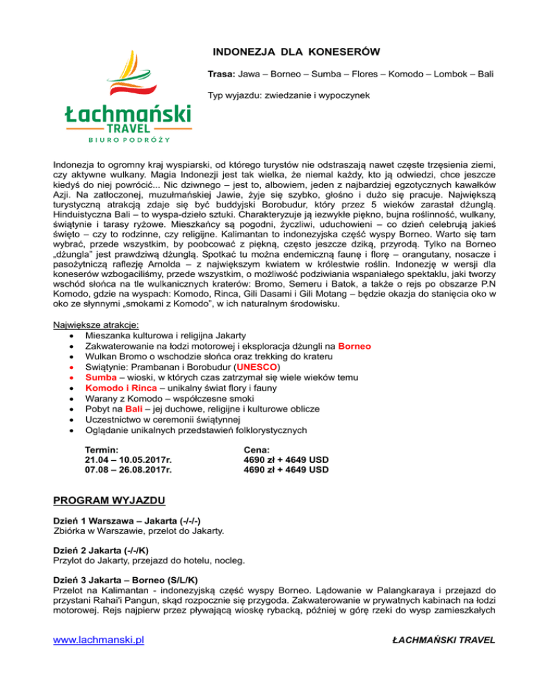 INDONEZJA DLA KONESERÓW Trasa: Jawa – Borneo – Sumba – Flores – Komodo – Lombok – Bali Typ wyjazdu: zwiedzanie i wypoczynek Indonezja to ogromny kraj wyspiarski, od którego turystów nie odstraszają nawet częste trzęsienia ziemi, czy aktywne wulkany. Magia Indonezji jest tak wielka, że niemal każdy, kto ją odwiedzi, chce jeszcze kiedyś do niej powrócić... Nic dziwnego – jest to, albowiem, jeden z najbardziej egzotycznych kawałków Azji. Na zatłoczonej, muzułmańskiej Jawie, żyje się szybko, głośno i dużo się pracuje. Największą turystyczną atrakcją zdaje się być buddyjski Borobudur, który przez 5 wieków zarastał dżunglą. Hinduistyczna Bali – to wyspa-dzieło sztuki. Charakteryzuje ją iezwykłe piękno, bujna roślinność, wulkany, świątynie i tarasy ryżowe. Mieszkańcy są pogodni, życzliwi, uduchowieni – co dzień celebrują jakieś święto – czy to rodzinne, czy religijne. Kalimantan to indonezyjska część wyspy Borneo. Warto się tam wybrać, przede wszystkim, by poobcować z piękną, często jeszcze dziką, przyrodą. Tylko na Borneo „dżungla” jest prawdziwą dżunglą. Spotkać tu można endemiczną faunę i florę – orangutany, nosacze i pasożytniczą raflezję Arnolda – z największym kwiatem w królestwie roślin. Indonezję w wersji dla koneserów wzbogaciliśmy, przede wszystkim, o możliwość podziwiania wspaniałego spektaklu, jaki tworzy wschód słońca na tle wulkanicznych kraterów: Bromo, Semeru i Batok, a także o rejs po obszarze P.N Komodo, gdzie na wyspach: Komodo, Rinca, Gili Dasami i Gili Motang – będzie okazja do stanięcia oko w oko ze słynnymi „smokami z Komodo”, w ich naturalnym środowisku. Największe atrakcje: Mieszanka kulturowa i religijna Jakarty Zakwaterowanie na łodzi motorowej i eksploracja dżungli na Borneo Wulkan Bromo o wschodzie słońca oraz trekking do krateru Swiątynie: Prambanan i Borobudur (UNESCO) Sumba – wioski, w których czas zatrzymał się wiele wieków temu Komodo i Rinca – unikalny świat flory i fauny Warany z Komodo – współczesne smoki Pobyt na Bali – jej duchowe, religijne i kulturowe oblicze Uczestnictwo w ceremonii świątynnej Oglądanie unikalnych przedstawień folklorystycznych Termin: 21.04 – 10.05.2017r. 07.08 – 26.08.2017r. Cena: 4690 zł + 4649 USD 4690 zł + 4649 USD PROGRAM WYJAZDU Dzień 1 Warszawa – Jakarta (-/-/-) Zbiórka w Warszawie, przelot do Jakarty. Dzień 2 Jakarta (-/-/K) Przylot do Jakarty, przejazd do hotelu, nocleg. Dzień 3 Jakarta – Borneo (S/L/K) Przelot na Kalimantan - indonezyjską część wyspy Borneo. Lądowanie w Palangkaraya i przejazd do przystani Rahai'i Pangun, skąd rozpocznie się przygoda. Zakwaterowanie w prywatnych kabinach na łodzi motorowej. Rejs najpierw przez pływającą wioskę rybacką, później w górę rzeki do wysp zamieszkałych www.lachmanski.pl ŁACHMAŃSKI TRAVEL przez orangutany oraz coraz głębiej w dżunglę. Wieczorem przesiadka na małe canoe i przeprawa przez Czarne Jeziora - w trakcie wyprawy obserwacja dzikich zwierząt: małp, lemurów oraz licznych ptaków, m. in. kolibrów i dzioborożców. Nocleg na łodzi. Dzień 4 Borneo (S/L/K) Śniadanie na pokładzie. Dalsza wyprawa w górę rzeki Rungan, przez rezerwat orangutanów na wyspie Kaja, do wioski Kanarakan. Wizyta w wiosce i obserwacja codziennego życia i pracy członków tej wyizolowanej społeczności. Po południu spływ canoe. Powrót na kolację do wioski i nocleg na łodzi. Dzień 5 Borneo (S/L/K) Dalsza podróż, tym razem w dół rzeki, do wyspy Pallas. Wizyta w centrum rehabilitacji młodych orangutanów, osieroconych w wyniku działalności kłusowników lub degradacji środowiska. Obserwacja procesu karmienia młodych oraz "resocjalizacji" czyli wtórnego przystosowywania zwierząt do życia w dżungli. Wyprawa canoe do wioski Tumbang Tahai oraz do wzgórza Tangkiling, gdzie zobaczyć można "patahu" - charakterystyczne domki na palach, budowane przez plemię Dayaków dla duchów swych zmarłych przodków. Wizyta w kolejnym miejscu animistycznego kultu - przy świętym kamieniu Banama. Krótki trekking przez dżunglę na szczyt wzgórza i podziwianie panoramy okolicy porośniętej gęstym, deszczowym lasem. Powrót na łódź, nocleg. Dzień 6 Borneo – Jawa (S/L/K) Powrót do przystani Rahai'i Pangun i przejazd na lotnisko. Przelot do Surabaya. Przejazd w dalszą drogę w kierunku Bromo, po drodze postój w Pasuruan - tradycyjnej wiosce rybackiej. W godzinach wieczornych dojazd do Tosari - wioski na zboczu wulkanu Bromo. Nocleg. Dzień 7 Jawa: wulkan Bromo (S/L/K) Wczesna pobudka i przejazd land roverami do Cemoro Lawang - miejsca skąd zaczyna się podejście do punktu widokowego na Bromo. Ok. godz. 6:00 nad wulkanem rozpoczyna się niezwykły spektakl wstające słońce maluje cały horyzont wszystkimi odmianami czerwieni, różu i żółci, a wulkaniczny krajobraz kraterów Bromo, Semeru i Batok sprawia wrażenie, jakby się było na innej planecie. Po nasyceniu się widokiem, trekking do wewnętrznego krateru Bromo. Dla chętnych możliwość pokonania trasy konno. Powrót do hotelu na śniadanie, prysznic i następnie wyruszenie w drogę powrotną do Surabaya. Transfer na lotnisko i przelot do Jogyakarta. Nocleg. Dzień 8 Jawa: Jogyakarta – Prambanan – Borobudur (S/L/K) Zwiedzanie dawnej stolicy starożytnego królestwa Mataram, dziś najważniejszego ośrodka kulturalnego i uniwersyteckiego w Indonezji. Wizyta w Prambanan – spektakularnym kompleksie świątyń hinduistycznych z VIII w. n.e. Następnie wyprawa do słynnej Borobudur, pochodzącej z IX w. największej świątyni buddyjskiej świata. Przejazd na lotnisko i przelot na Bali. Nocleg. Dzień 9 Bali – Sumba (S/L/K) Przelot na Sumbę. Lądowanie w miejscowości Waikabubak w zachodniej części wyspy. Zakwaterowanie i wizyta w położonych na okolicznych wzgórzach tradycyjnych wioskach, w których czas zatrzymał się wiele wiek