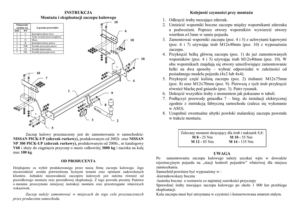 INSTRUKCJA MontaŜu i eksploatacji zaczepu kulowego Kolejność czynności przy montaŜu 10 Oznaczenie zacisku wg ISO PN 1 L 2 + 3 31 4 R 5 58R 6 54 7 58L Łączenie przewodów 6 Kierunkowskazy lewe Tylne światła przeciwmgłowe Masa Kierunkowskazy prawe Światła pozycyjne prawe Światła hamowania Światła pozycyjne lewe 10 10 10 7 4 1 9 8 3 2 1. Odkręcić śruby mocujące zderzak. 2. Umieścić wsporniki boczne zaczepu między wspornikami zderzaka a podwoziem. Poprzez otwory wsporników wywiercić otwory wiertłem ø13mm w ramie pojazdu. 3. Zamontować wsporniki zaczepu (poz. 4 i 5) z uchwytami kątowymi (poz. 6 i 7) uŜywając śrub M12x40mm (poz. 10) z wyposaŜenia zaczepu. 4. Przykręcić belkę główną zaczepu (poz. 1) do juŜ zamontowanych wsporników (poz. 4 i 5) uŜywając śrub M12x40mm (poz. 10). W obu wspornikach znajdują się otwory umoŜliwiające zamontowanie belki na dwa sposoby – wybrać odpowiedni w zaleŜności od posiadanego modelu pojazdu (4x2 lub 4x4). 5. Przykręcić część kulistą zaczepu (poz. 2) śrubami: M12x75mm (poz. 8) oraz M12x70mm (poz. 9). Pierwszą z tych śrub przykręcić równieŜ blachę pod gniazdo (poz. 3). Patrz rysunek. 6. Dokręcić wszystkie śruby z momentem jak pokazano w tabeli. 7. Podłączyć przewody gniazdka 7 – bieg. do instalacji elektrycznej zgodnie z instrukcją fabryczną samochodu (zaleca się wykonanie w ASO). 8. Uzupełnić ewentualne ubytki powłoki malarskiej zaczepu powstałe w trakcie montaŜu. 5 Zaczep kulowy przeznaczony jest do zamontowania w samochodzie: NISSAN PICK-UP (zderzak rurkowy), produkowanym od 2002r. oraz NISSAN NP 300 PICK-UP (zderzak rurkowy), produkowanym od 2008r., nr katalogowy V68 i słuŜy do ciągnięcia przyczep o masie całkowitej 3000 kg i nacisku na kulę max 100 kg. OD PRODUCENTA Dziękujemy za wybór produkowanego przez naszą firmę zaczepu kulowego. Jego niezawodność została potwierdzona licznymi testami oraz opiniami zadowolonych klientów. JednakŜe niezawodność zaczepów kulowych jest zaleŜna równieŜ od prawidłowego montaŜu oraz prawidłowej eksploatacji. Z tego powodu prosimy Państwa o staranne przeczytanie niniejszej instrukcji montaŜu oraz przestrzeganie właściwych wskazówek. Zaczep naleŜy zamontować w miejscach do tego celu przeznaczonych przez producenta samochodu. Zalecany moment skręcający dla śrub i nakrętek 8,8: M 8 - 25 Nm M 10 - 55 Nm M 12 - 85 Nm M 14 - 135 Nm UWAGA Po zamontowaniu zaczepu kulowego naleŜy uzyskać wpis w dowodzie rejestracyjnym pojazdu na „stacji kontroli pojazdów” właściwej dla miejsca zamieszkania. Samochód powinien być wyposaŜony w : -kierunkowskazy boczne -lusterka boczne o rozstawie co najmniej szerokości przyczepy Sprawdzać śruby mocujące zaczepu kulowego po około 1 000 km przebiegu eksploatacji. Kula zaczepu musi być utrzymana w czystości i konserwowana smarem stałym. PPUH AUTO-HAK S.J. WyposaŜenie zaczepu kulowego: Produkcja Zaczepów Kulowych Henryk & Zbigniew Nejman 76-200 SŁUPSK ul. Słoneczna 16K tel/fax (059) 8-414-414; 8-414-413 E-mail: [email protected] www.autohak.com.pl Zaczep kulowy bez wyposaŜenia elektrycznego V68 Klasa: A50-X Nr kat. Przeznaczony do zamontowania w samochodzie: Producent: NISSAN Model: PICK-UP (zderzak rurkowy) produkowanym od 2002 r. oraz Dane techniczne: wartość siły D: 15,0 kN maksymalna masa przyczepy: 3000 kg maksymalny nacisk na kulę: 100 kg Producent: NISSAN Model: NP 300 PICK-UP (zderzak rurkowy) produkowanym od 2008 r. KARTA GWARANCYJNA Producent udziela gwarancji niniejszą kartą gwarancyjną na okres 24 miesięcy licząc od dnia zakupu zaczepu kulowego do samochodu: NISSAN PICK-UP (zderzak rurkowy)- produkowanego od 2002 r. NISSAN NP 300 PICK-UP (zderzak rurkowy)- produkowanego od 2008 r. Data produkcji .............................. Data zakupu............................................. Zakres gwarancji obejmuje wyłącznie wady jakościowe wynikające z winy producenta. Gwarancja nie obejmuje natomiast uszkodzeń zawinionych przez nabywcę, wynikających z niewłaściwego montaŜu, uŜytkowania lub konserwacji, uszkodzeń mechanicznych, normalnego zuŜycia podczas eksploatacji itp. Gwarancja udzielona na zakupiony towar nie wyłącza, nie ogranicza ani nie zawiesza uprawnień kupującego wynikających z niezgodności towaru z umową. Reklamacje naleŜy zgłaszać w punkcie sprzedaŜy, składając jednocześnie kartę gwarancyjną. Usunięcie "wady" następuje po stwierdzeniu przez punkt sprzedaŜy wspólnie z producentem słuszności złoŜonej reklamacji. Reklamacja powinna być załatwiona w ciągu 14 dni od dnia uznania reklamacji. Karta gwarancyjna jest niewaŜna jeŜeli nie jest wypełniona i podpisana. Data zgłoszenia reklamacji: ................................................................... Numer homologacji zgodnie z Dyrektywą 94/20/WE: e20*94/20*0696*00 INFORMACJA WSTĘPNA Zaczep kulowy jest skonstruowany zgodnie z zasadami bezpieczeństwa ruchu drogowego. Zaczep kulowy jest elementem wpływającym na bezpieczeństwo jazdy i moŜe zostać zainstalowany wyłącznie przez personel wyspecjalizowany. Niedopuszczalne jest dokonywanie jakichkolwiek zmian w konstrukcji zaczepu. Powoduje to wygaśniecie dopuszczenia do stosowania. W przypadku obecności masy izolacyjnej lub osłony podwozia w miejscu przylegania zaczepu, naleŜy ją usunąć. Nieosłonięte miejsca karoserii oraz wywiercone otwory naleŜy pomalować farbą antykorozyjną. Informacjami wiąŜącymi odnośnie wartości obciąŜeń są dane podawane przez producenta samochodu, względnie wartości maksymalnej masy przyczepy oraz maksymalnego nacisku na kulę, przy czym wartości parametrów zaczepu kulowego nie mogą być przekroczone. Wzór do obliczania wartości siły D: Maks. masa przyczepy [kg] x Maks. masa samochodu [kg] Maks. masa przyczepy [kg] + Maks. masa samochodu [kg] X 9,81 = 1000 D [kN]